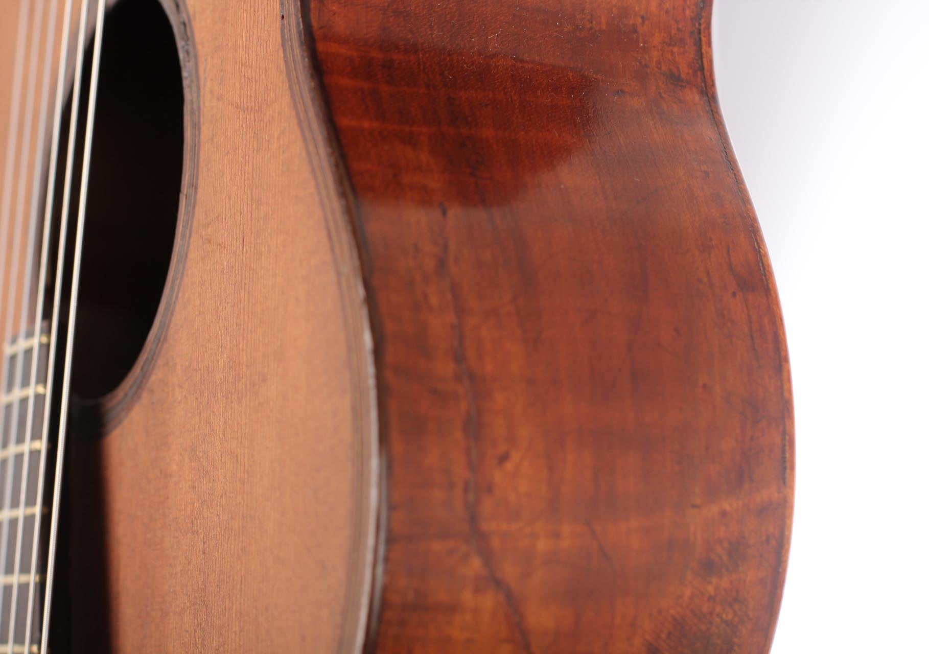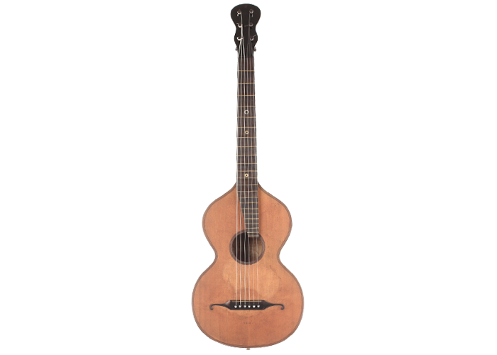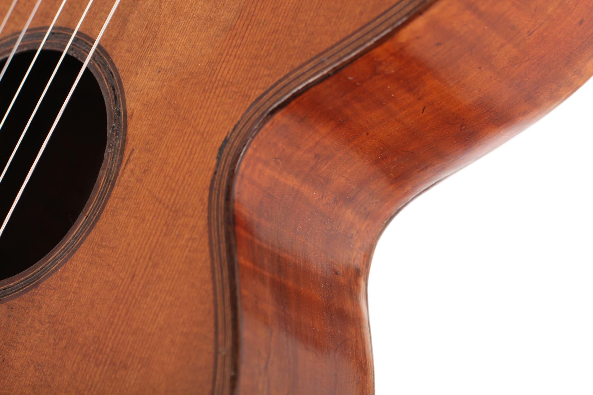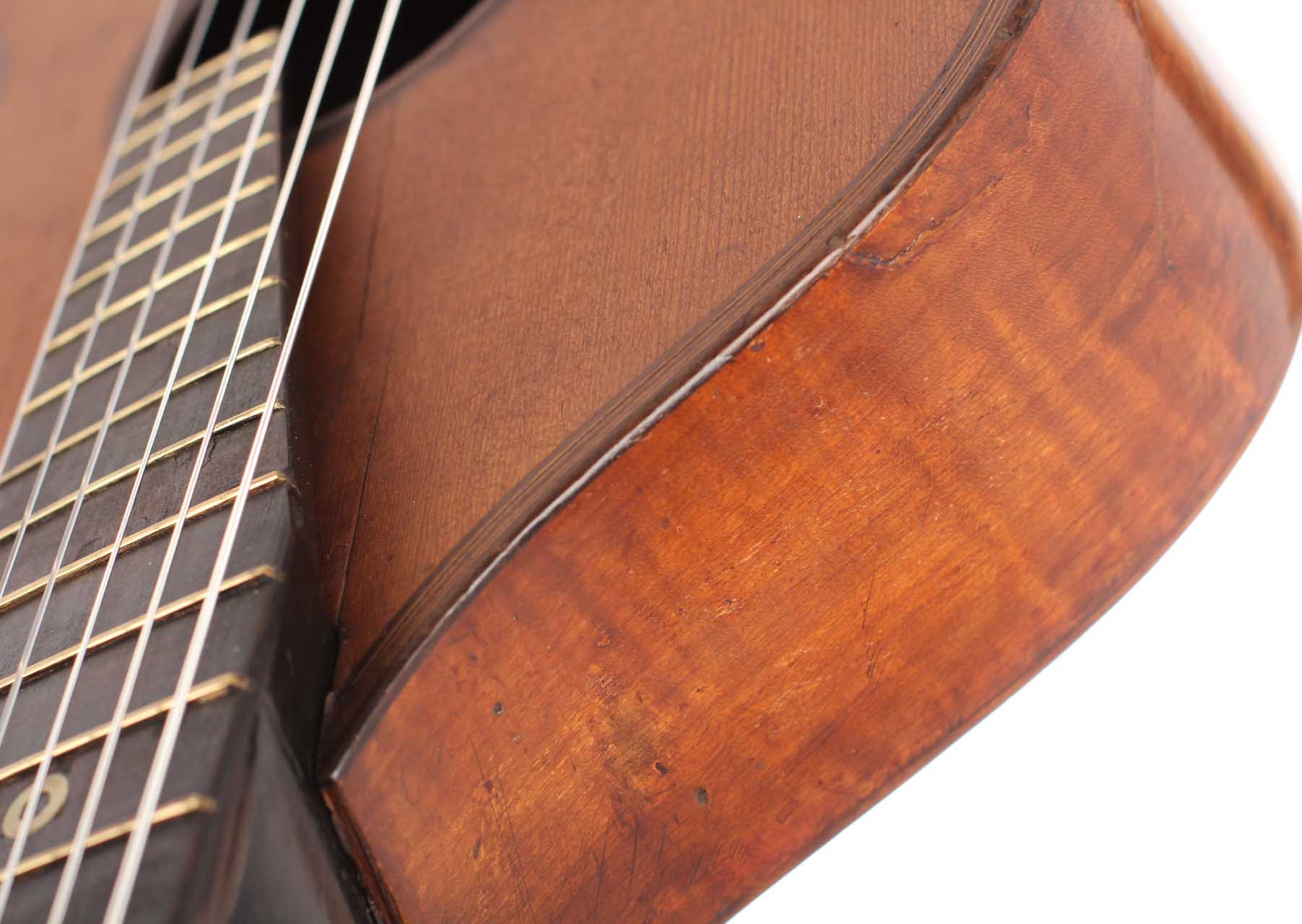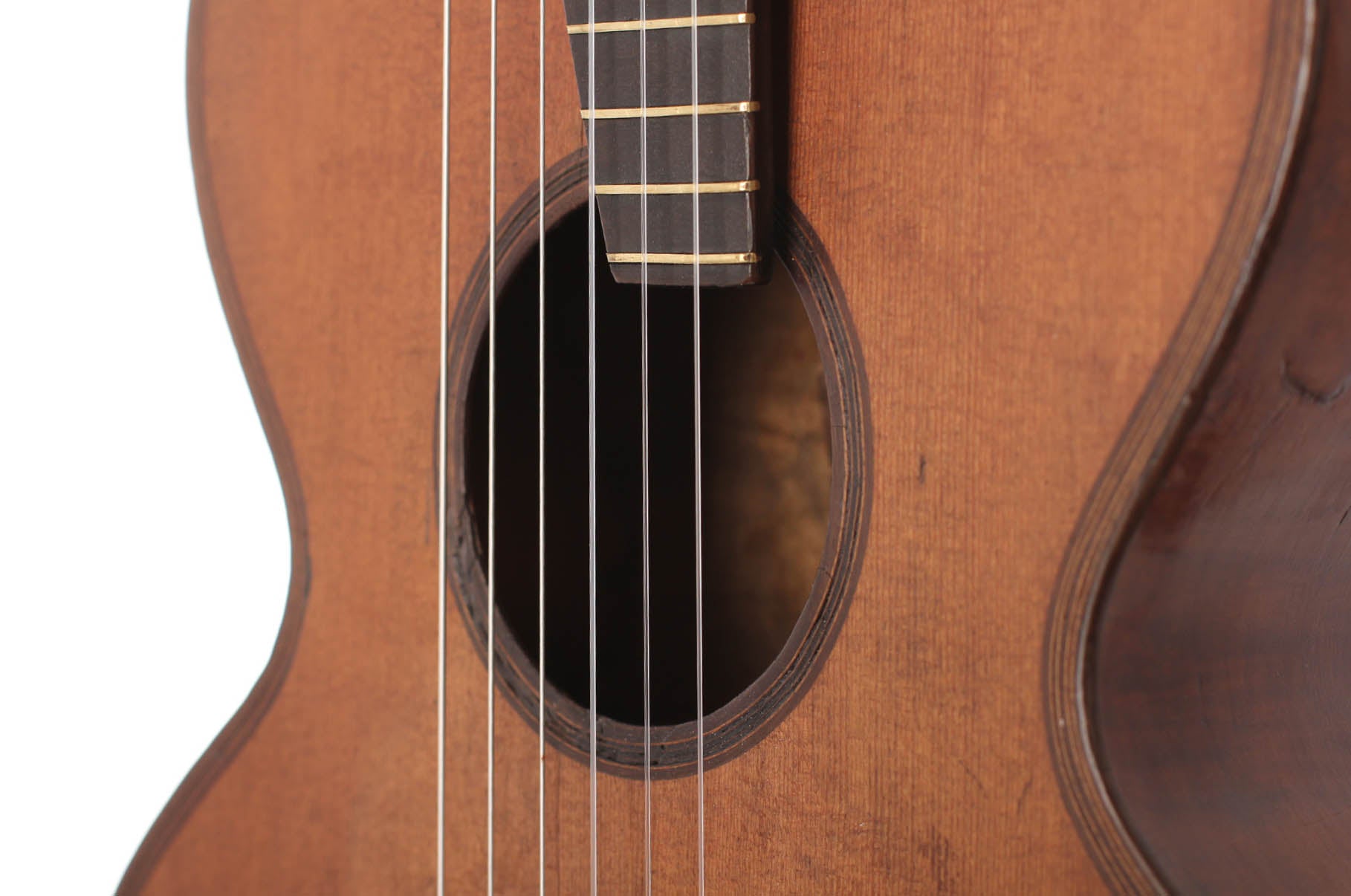 This wonderful guitar by Anton Stauffer & Comp., represents one of the models which were constructed by Stauffer with the reference “nach dem Modell des Luigi Legnani“ (=in accordance with the model by Luigi Legnani). This guitar was built in 1829 and has the serial no. 480. The top is made of spruce wood and has a matt finish. The guitar’s bridge is designed in a plain and modest manner and is a copy of an original bridge (made by Bernhard Kresse). The mother of pearl dots on the fretboard were added at some point in the past. The sides as well as the one-piece back are made of maple. It has some very well repaired cracks on the top and the sides. It is fully playable.