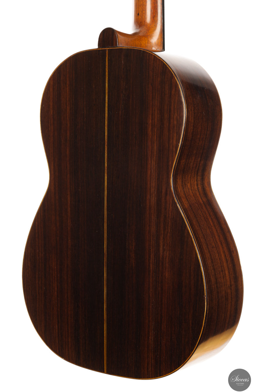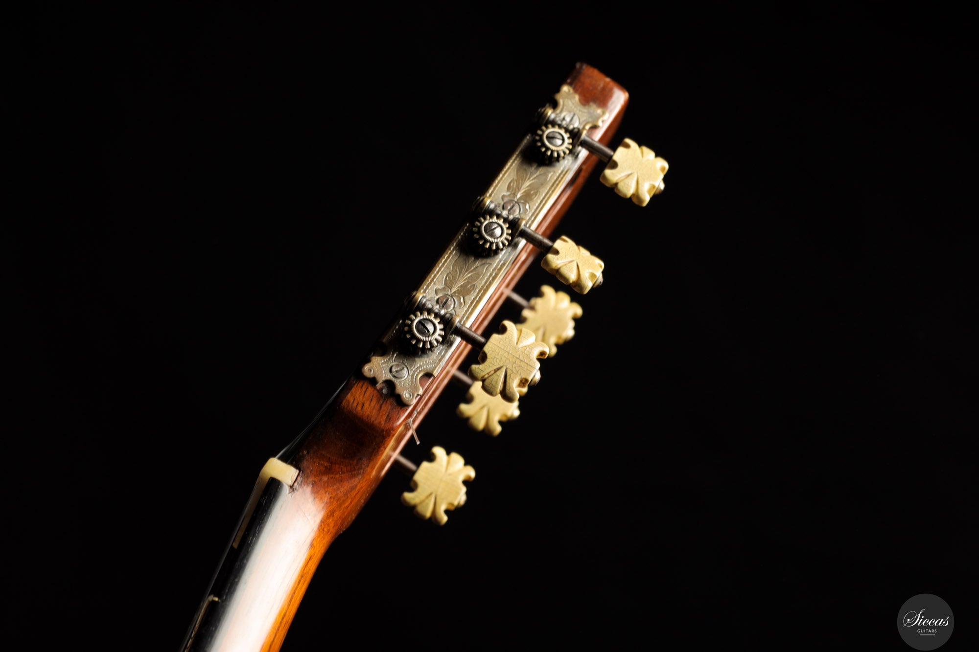 This remarkable guitar, built in 1925 and bearing the number 159, is a rare and elegant example of Antonio Emilio Pascual Viudes’ craftsmanship. Featuring a spruce top and Indian rosewood back and sides, the instrument is traditionally constructed and finished with French polish. Weighing only 1380 grams and equipped with beautiful antique tuners, it is a lightweight and highly resonant guitar with an unmistakable historical character. Pascual’s guitars are distinctive in their craftsmanship. They reflect his Madrid training, with strong Manuel Ramírez elements, but also his own artistic flourishes. His instruments are often lavishly decorated, with artistic rosettes, headstocks, and detailed labels. Pascual Viudes deserves to stand alongside the famous names of Santos Hernández, Manuel Ramírez, and Domingo Esteso—his career shows that excellence in guitar making can thrive even far from the Spanish centers.