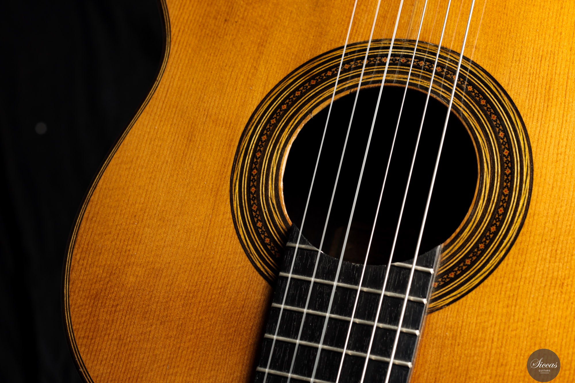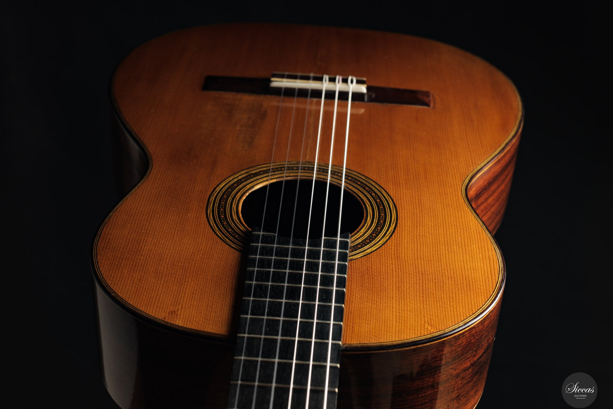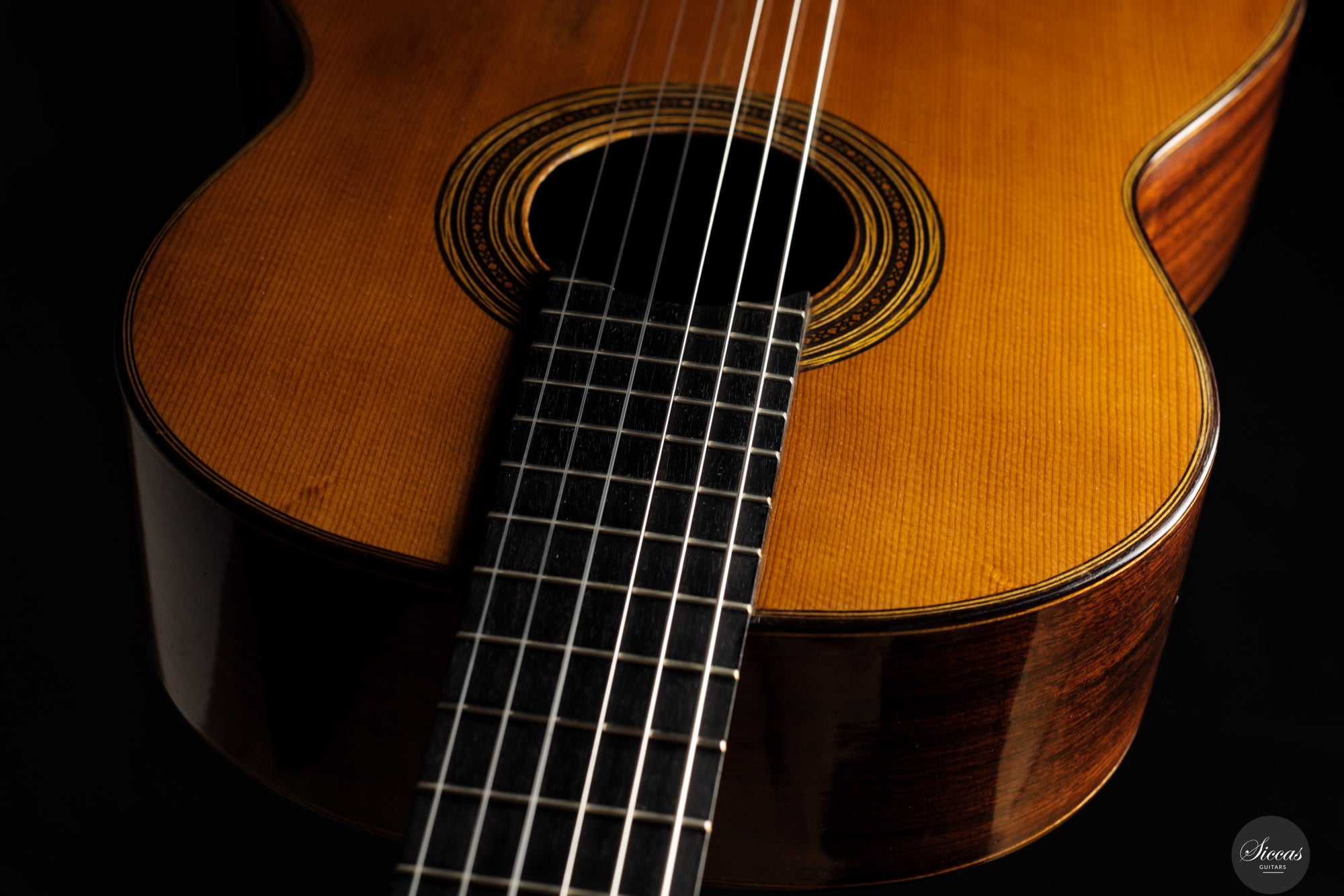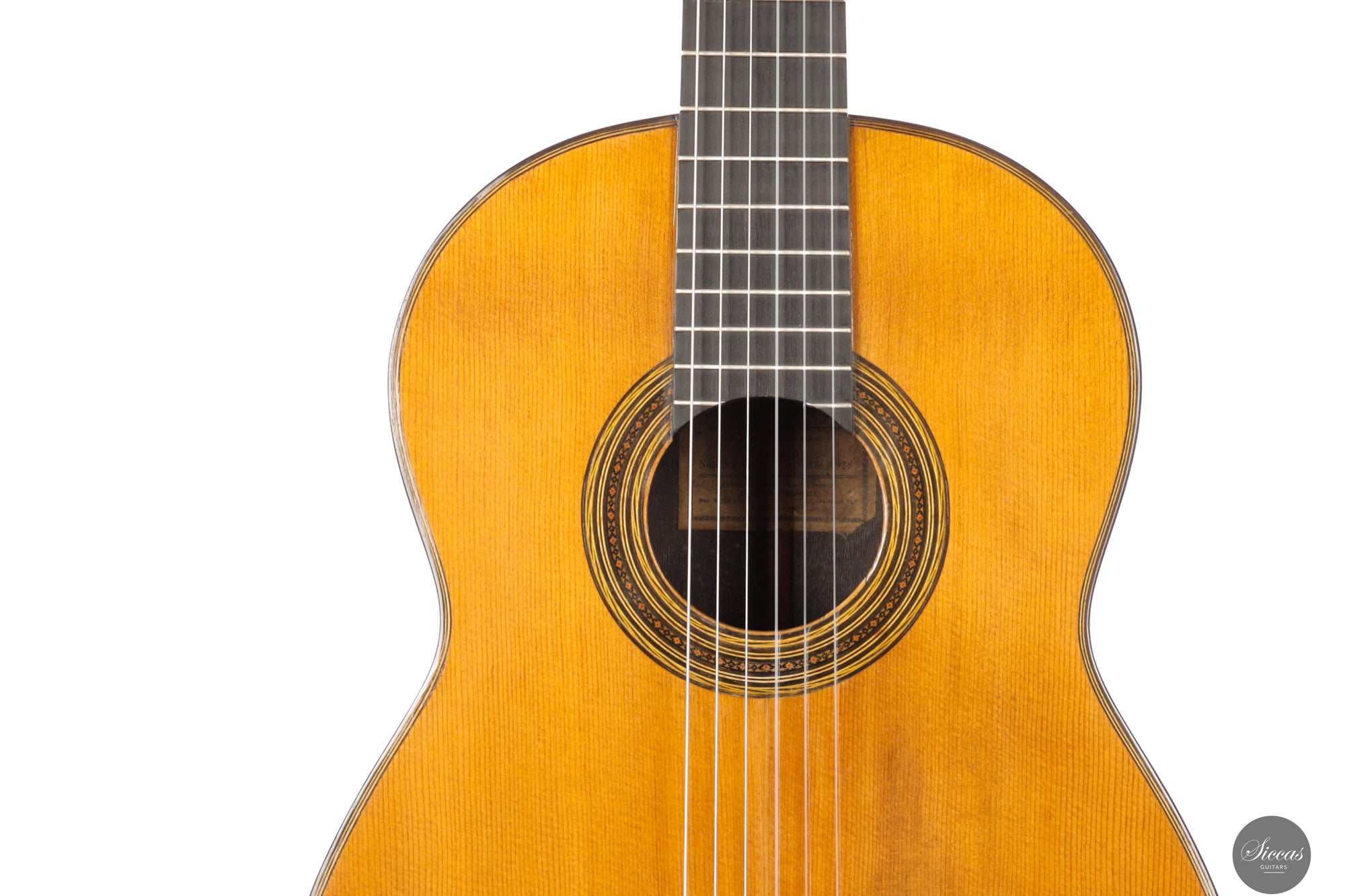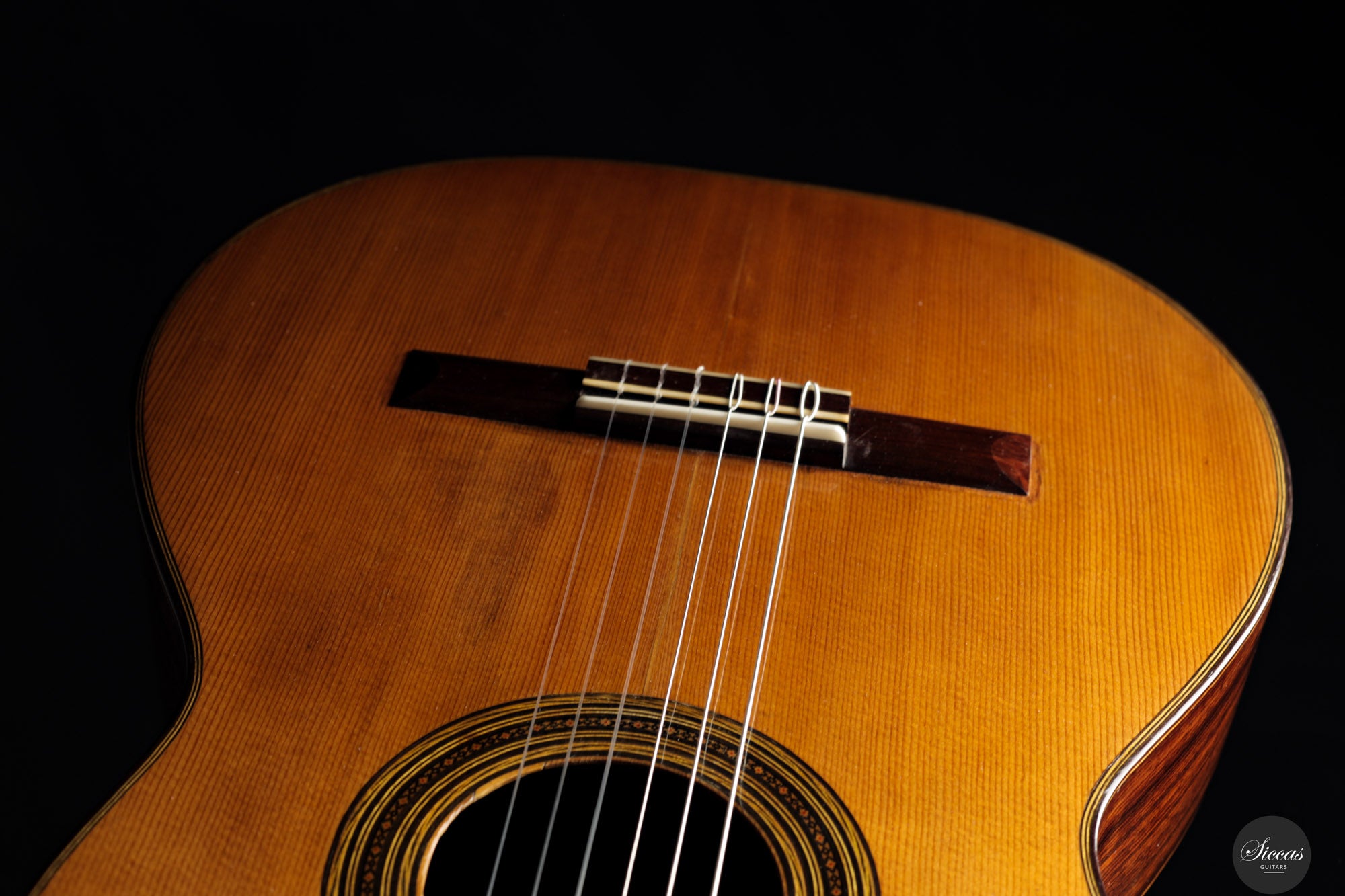 Its tonal palette is both elegant and expressive. the instrument offers a wide range of timbral colors and a highly reactive response to right-hand technique. This makes it a particularly sensitive guitar, one that inspires exploration and rewards nuance. The dynamic range is expansive, and the guitar excels in delicate phrasing as well as assertive playing. Playability and overall condition are outstanding considering the instrument’s age, making it an inspiring instrument for performers and collectors alike.