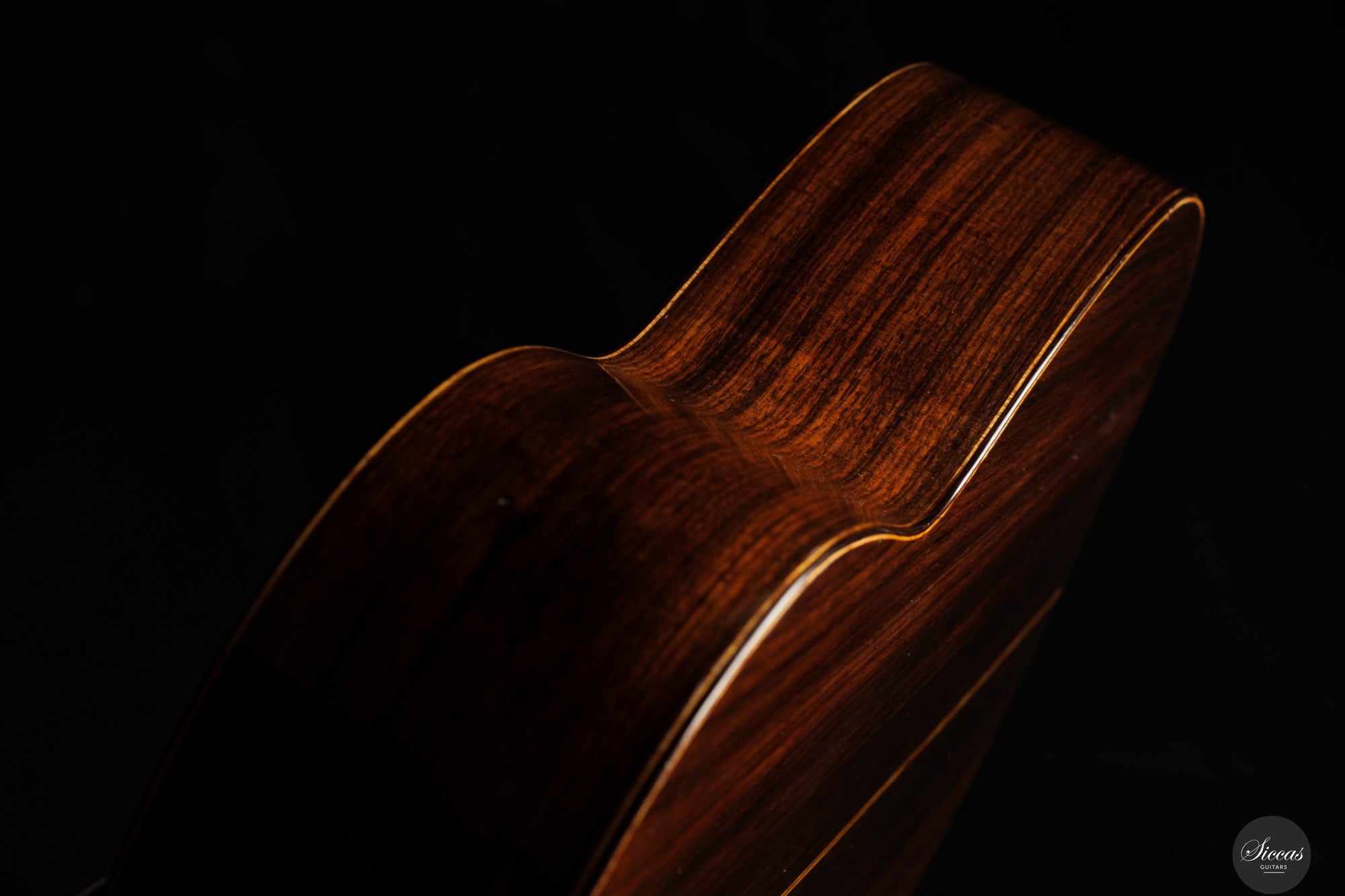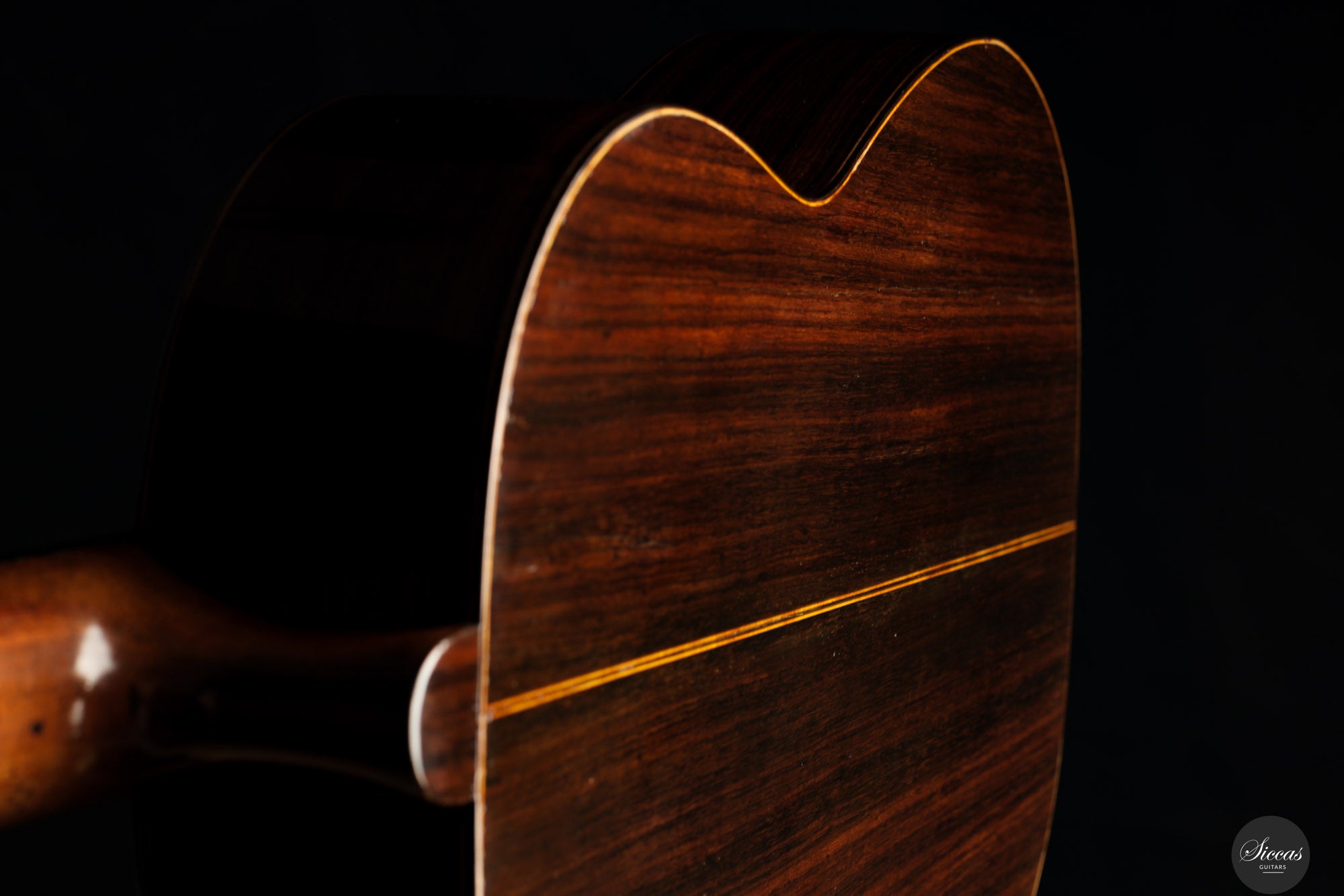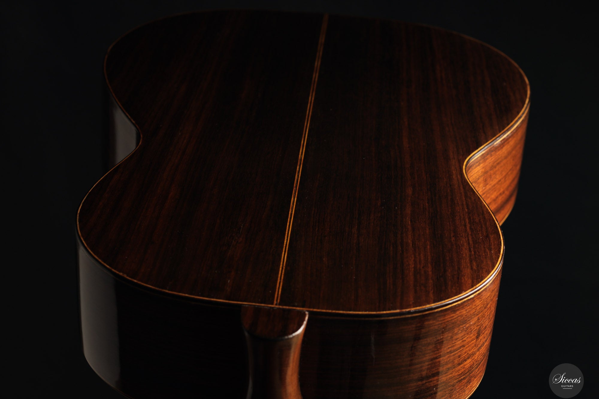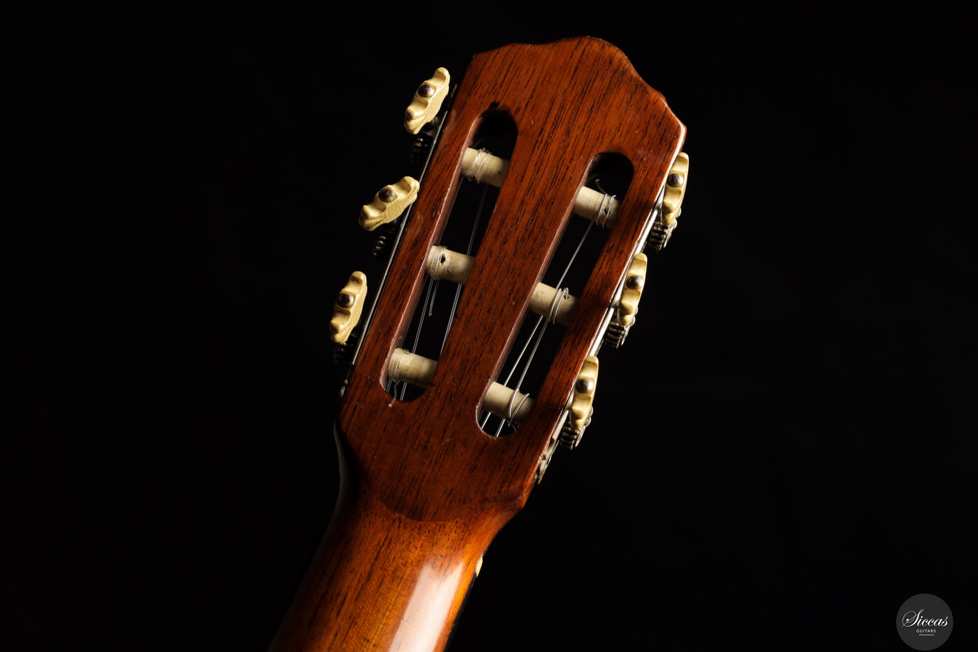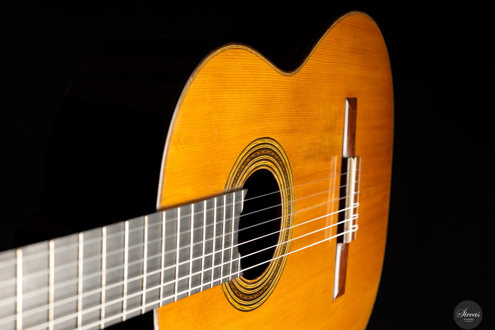 Its tonal palette is both elegant and expressive. the instrument offers a wide range of timbral colors and a highly reactive response to right-hand technique. This makes it a particularly sensitive guitar, one that inspires exploration and rewards nuance. The dynamic range is expansive, and the guitar excels in delicate phrasing as well as assertive playing. Playability and overall condition are outstanding considering the instrument’s age, making it an inspiring instrument for performers and collectors alike.