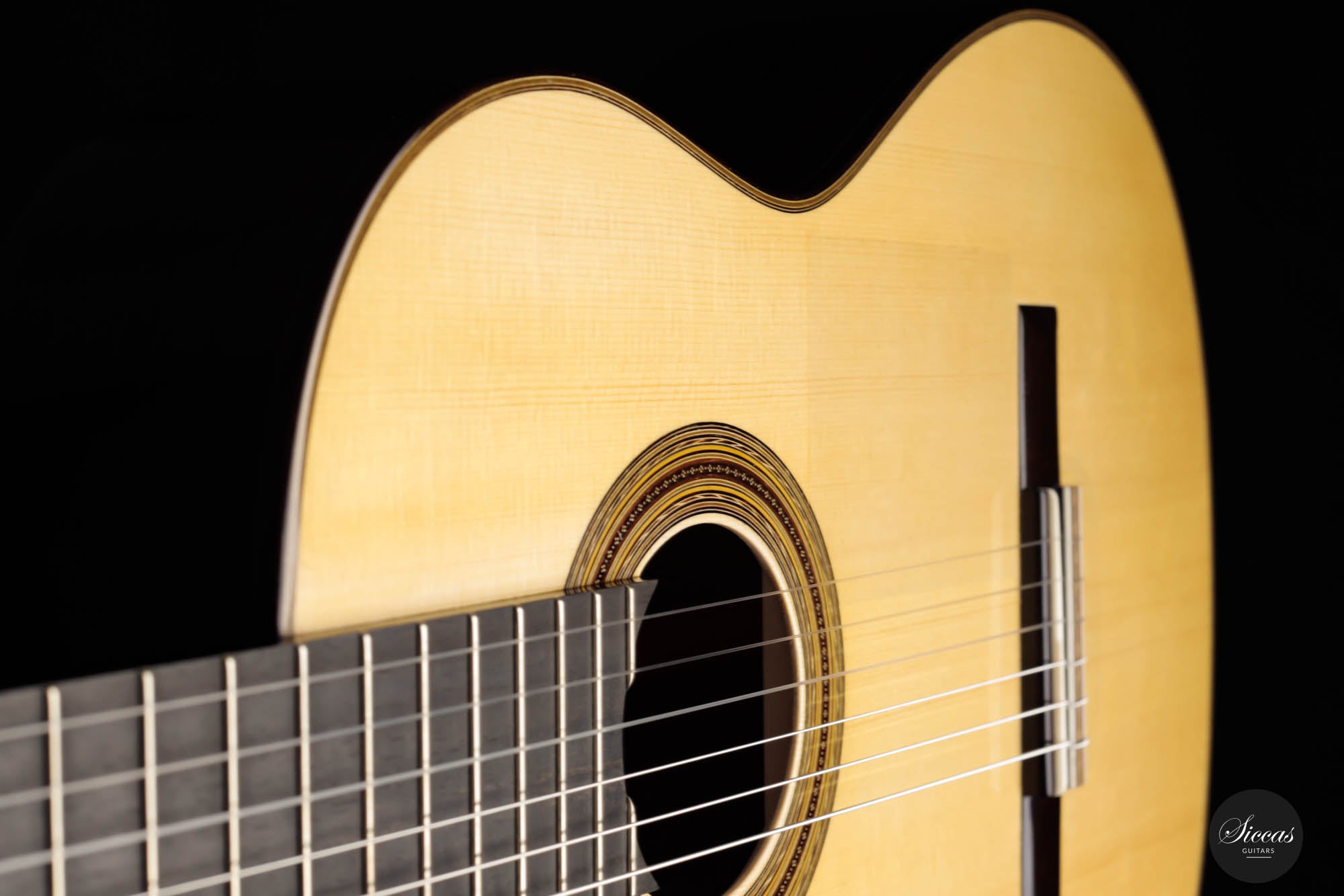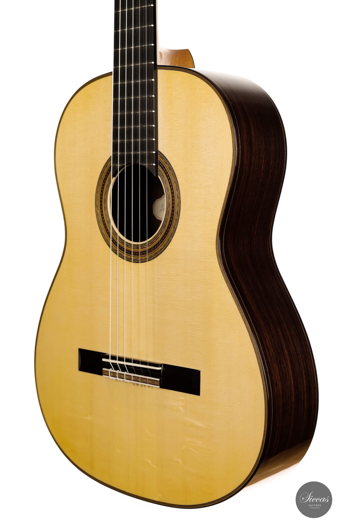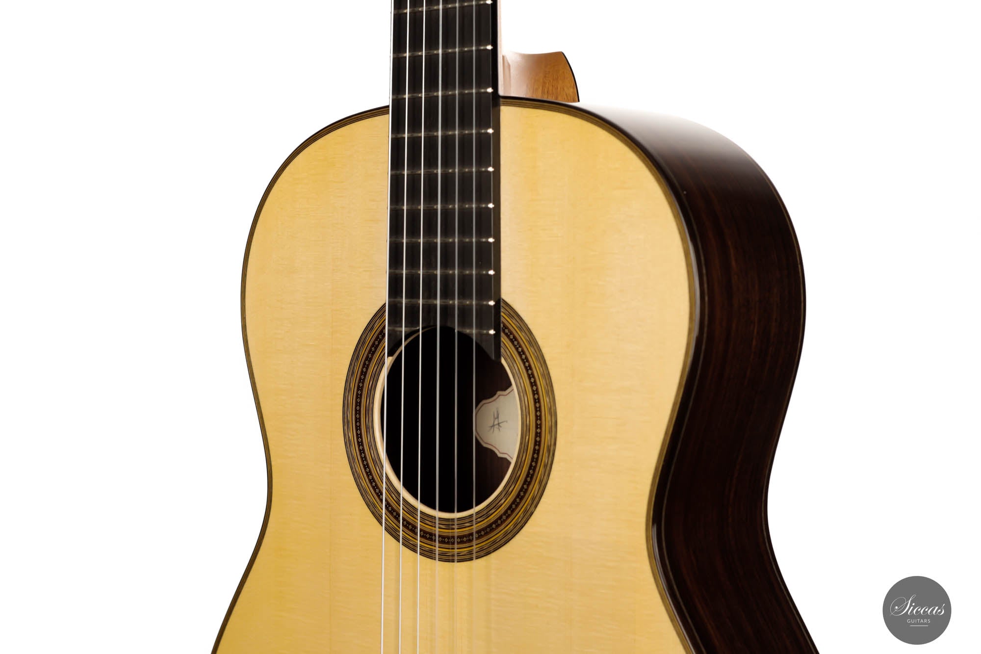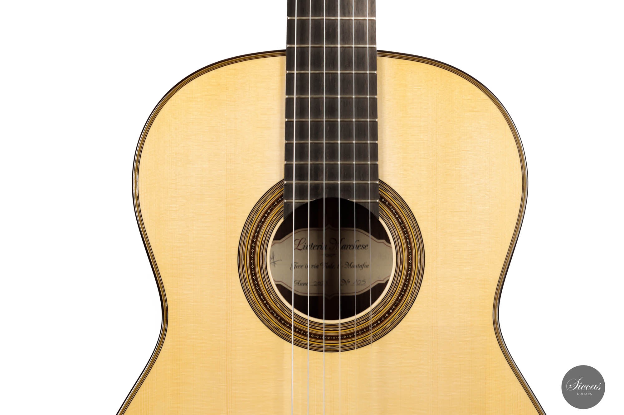 The 2023 Antonio Marchese Guitar No. 105 is a testimony to superior craftsmanship and acoustic brilliance. Constructed by the accomplished luthier Antonio Marchese, this guitar reflects an exquisite blend of traditional design and innovative acoustics. Featuring a stunning spruce top coupled with Indian rosewood back and sides, the instrument shines in both aesthetics and tonal quality. One standout attribute of the 2023 Antonio Marchese Guitar no. 105 is its exceptional French polish. Marchese's expertise in this technique is evident in the flawless finish, adding to the visual allure of the instrument. This meticulous detailing truly speaks volumes about Marchese's commitment to excellence and his mastery of the craft. Built on a traditional 7 fan brace design, this guitar embodies Marchese's personal vision of the perfect guitar sound. Its main resonance is in the F# range, resulting in deep, dark bass tones that beautifully complement the very singing and melodious trebles. This balance provides an enriching and expressive sound palette, offering guitarists a versatile instrument for various playing situations. In summary, the 2023 Antonio Marchese Guitar no. 105 exemplifies top-tier luthiery, marrying stunning visuals with superior sound quality. Its intricate design and remarkable acoustics make it an ideal choice for discerning guitarists, further cementing Antonio Marchese's status as a leading figure in guitar-making.