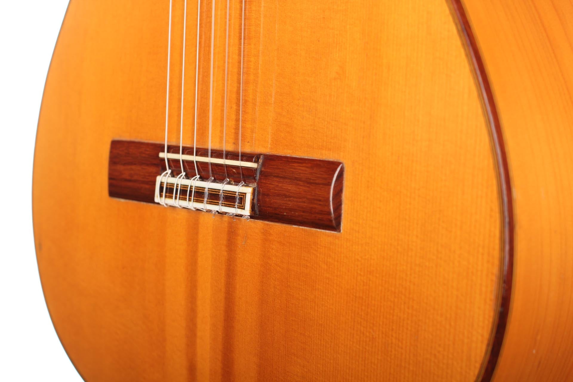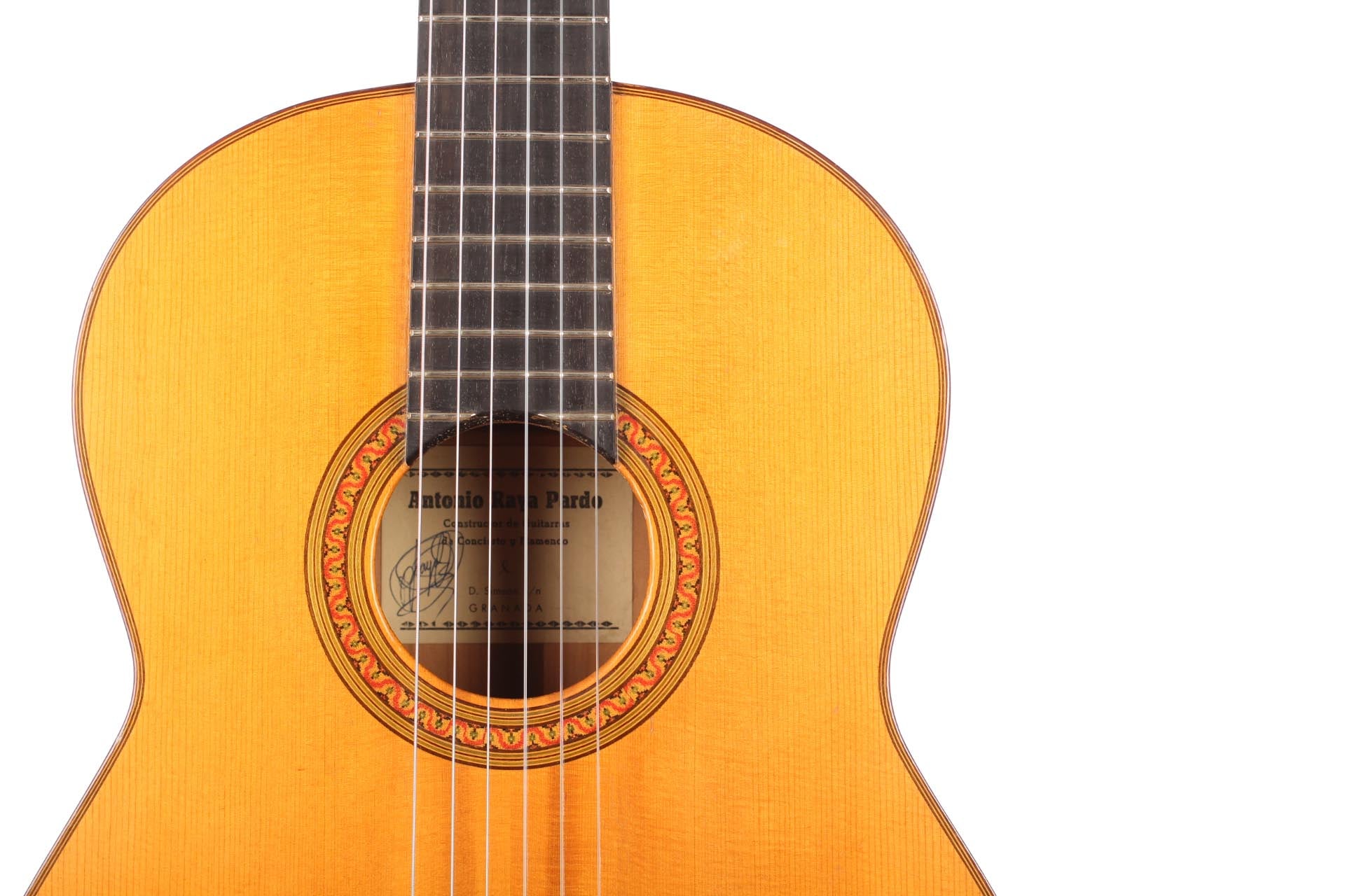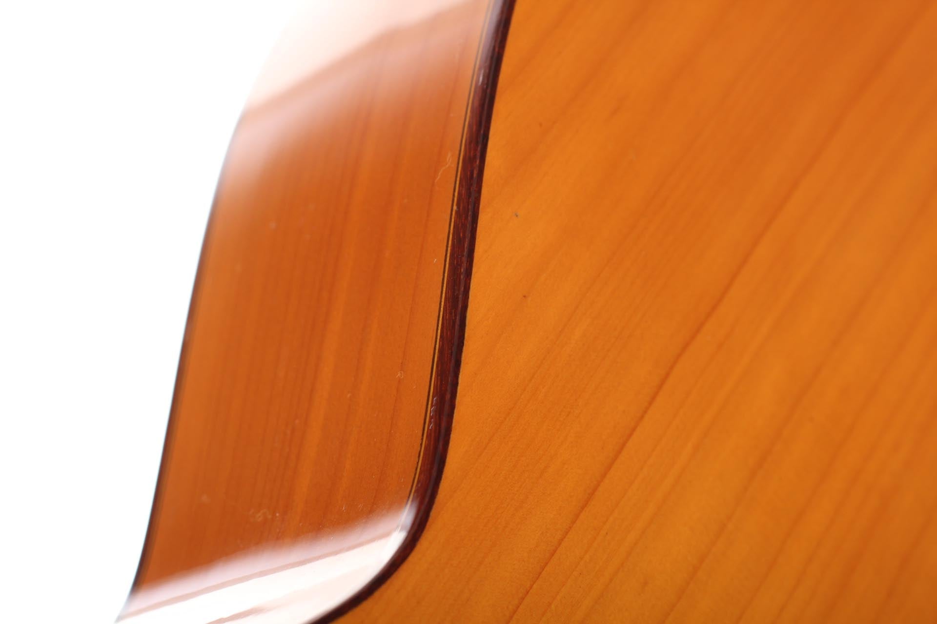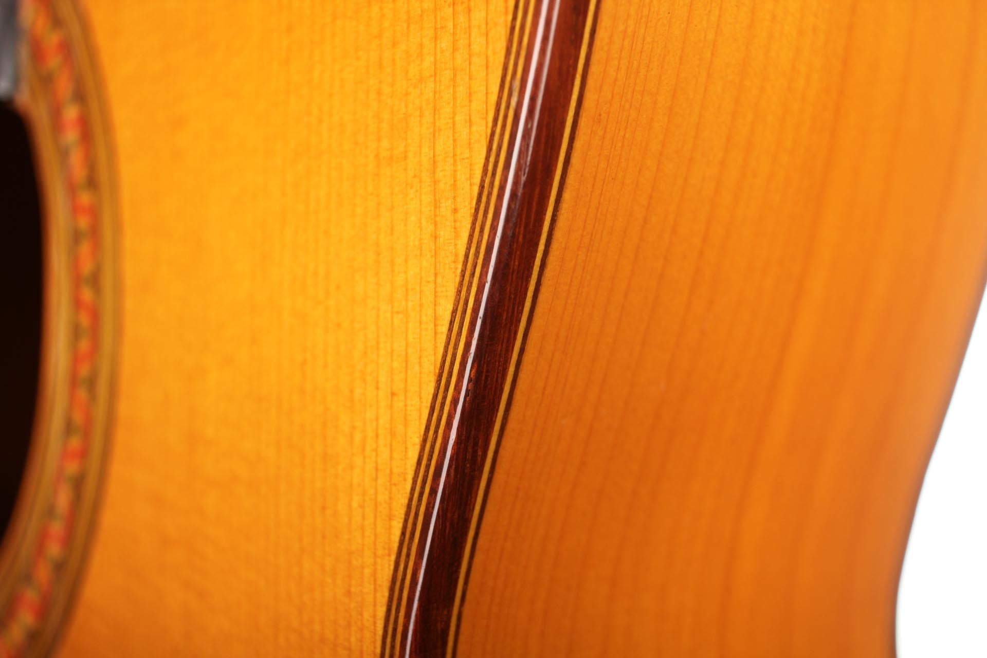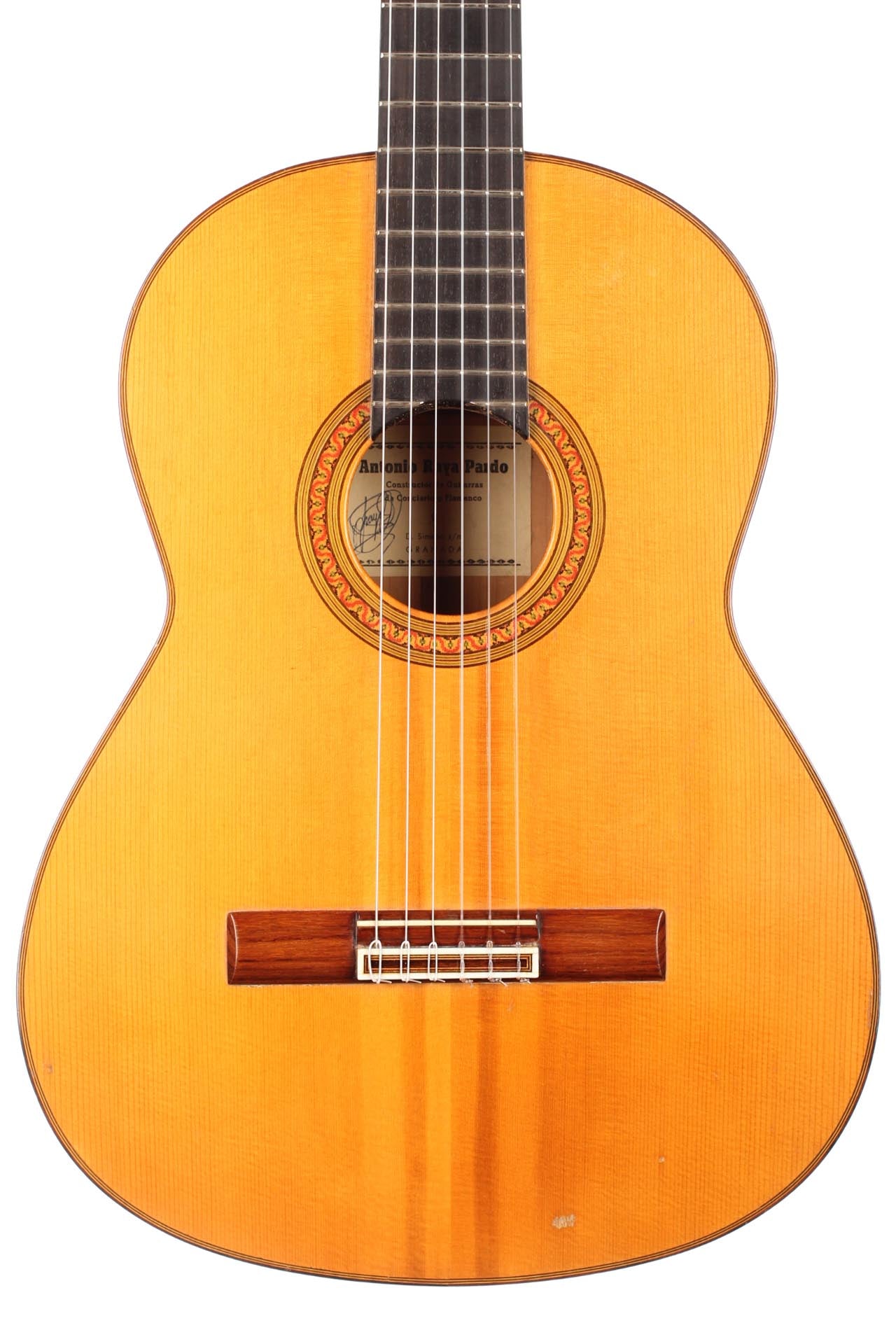 Antonio Raya Pardo was born in Huelva in 1950. At the age of 14, his family moved to Granada where he first worked as a weaver. After that time, he apprenticed to Eduardo Ferrer and later, also for a short period, to José Lopez Bellido. In 1973 he opened his own workshop. Today, he shares the workshop with his son Antonio Raya Ferrer. This traditional flamenco guitar was built in 1975. The top is made of spruce and back and sides are made of cypress wood. The whole guitar is French-polished. This flamenco guitar has a genuine flamenco sound with a very strong basses and a penetrating crisp treble. This is a real professional quality guitar that is suitable for solo performance and dance accompaniment.