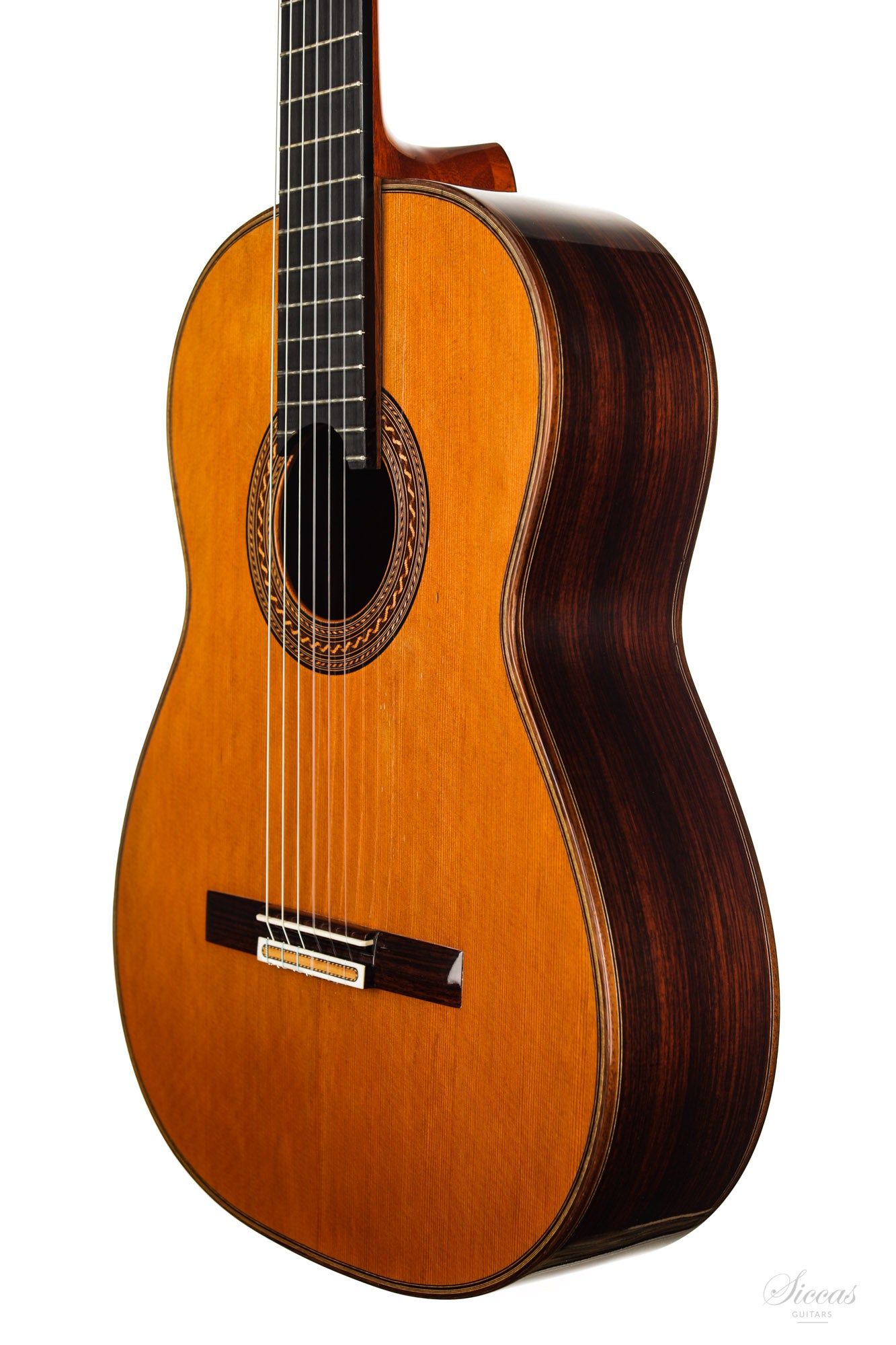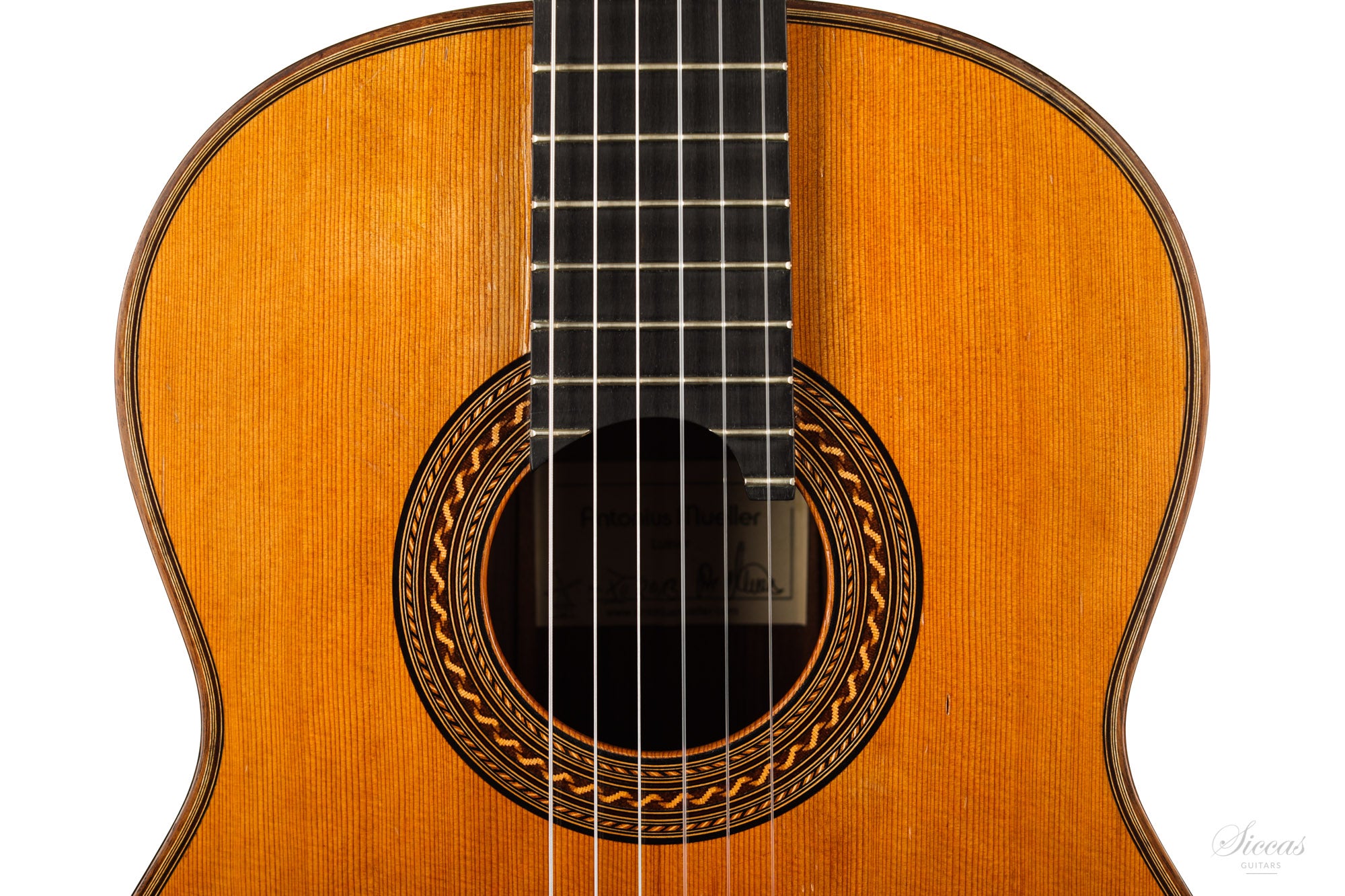 This double top guitar was built in 2013 by Antonius Müller. The top is made of dark Canadian cedar. Back and sides are made of beautifully grained Indian rosewood and sealed with a thin layer of nitrocellulose lacquer, while the top is finished with shellac polish. This instrument was played professionally over the past years, and therefore wears some superficial playing marks on the top. Nevertheless, it is in perfect structural condition and developed an absolutely astonishing sound over the years.