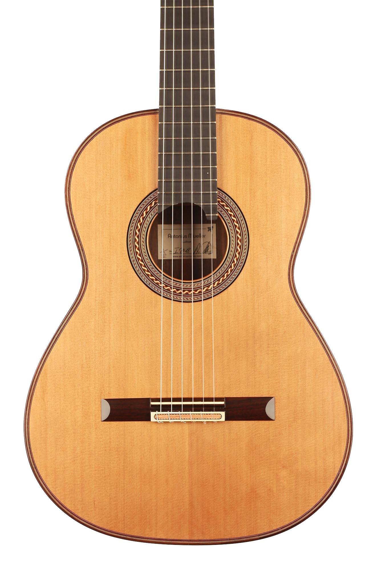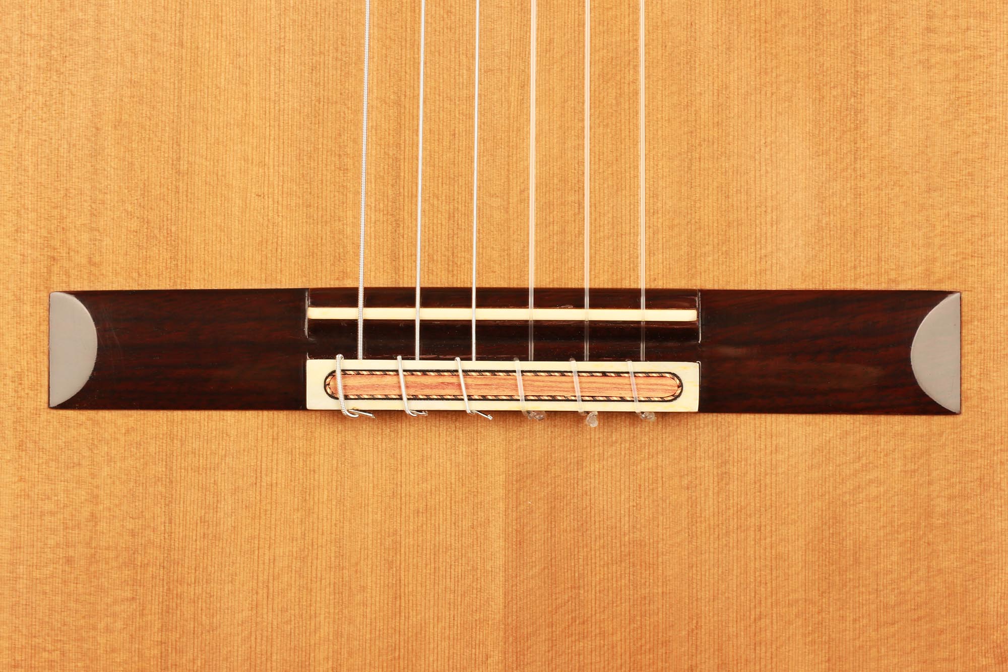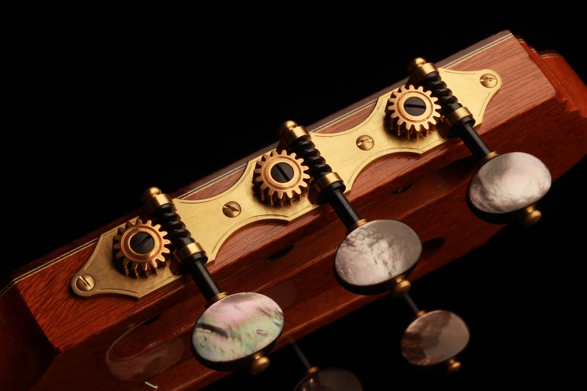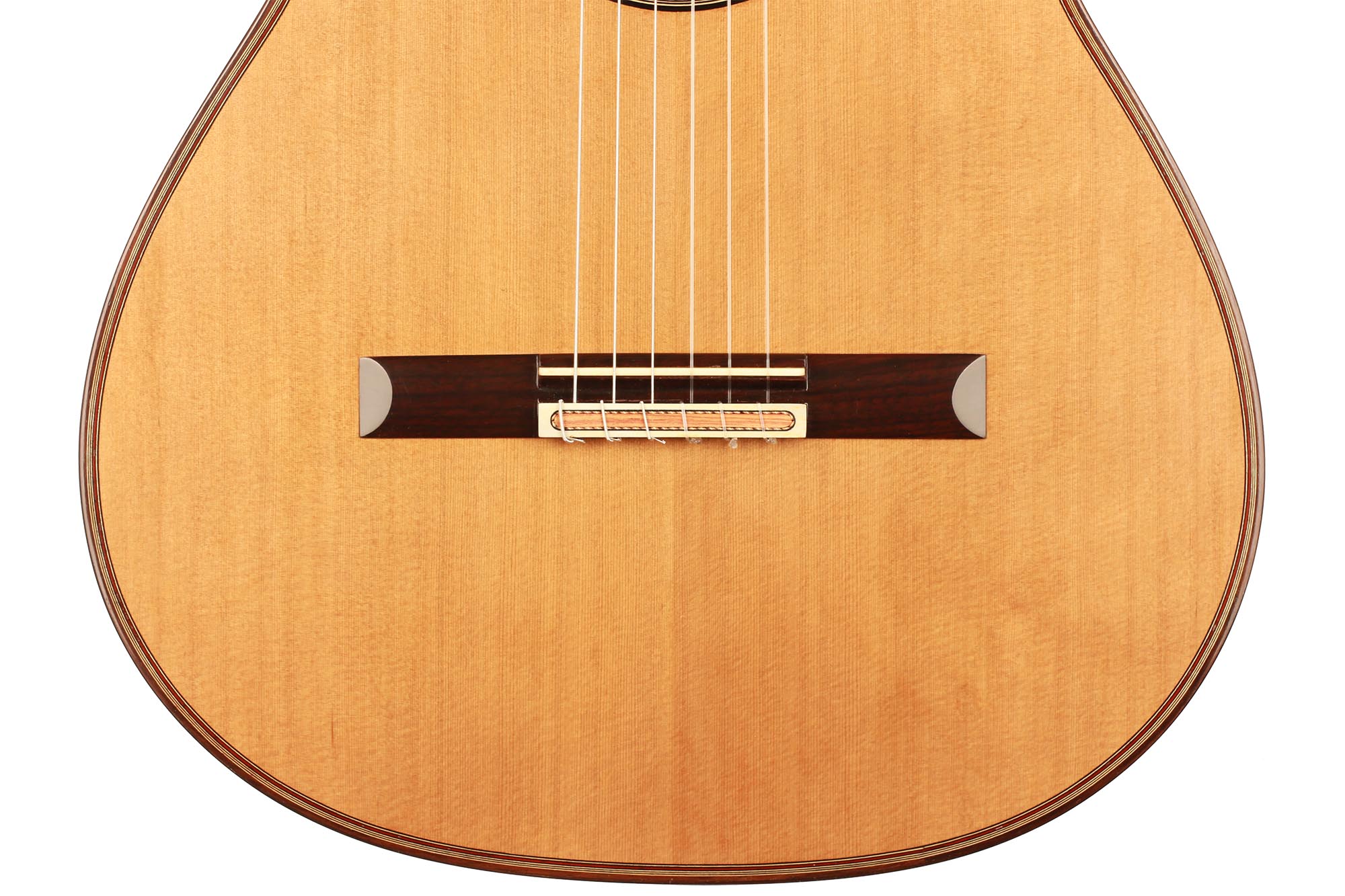 This double top guitar was built in 2018 by Antonius Müller. The top is made of dark Canadian cedar. Back and sides are made of beautifully grained Indian rosewood and sealed with a thin layer of nitrocellulose lacquer, while the top is finished with shellac polish. High-quality Scheller tuners complete the overall picture of this noble guitar.