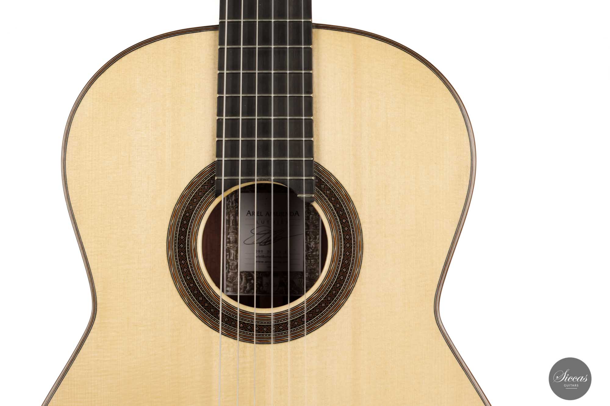 This shorter scale guitar is a special order for our store with a focus on sound and playability. It comes directly from Ariel's workshop and has a 63 cm scale length, 2 cm shorter than the standard 65 cm scale length, making it very comfortable for the left hand. The bracing is inspired by Antonio de Torres' guitars, creating a very responsive, warm, and joyful playing experience for this instrument. A very nice set of dark Madagascar rosewood was chosen for the back and sides, giving this guitar an elegant and classy look.