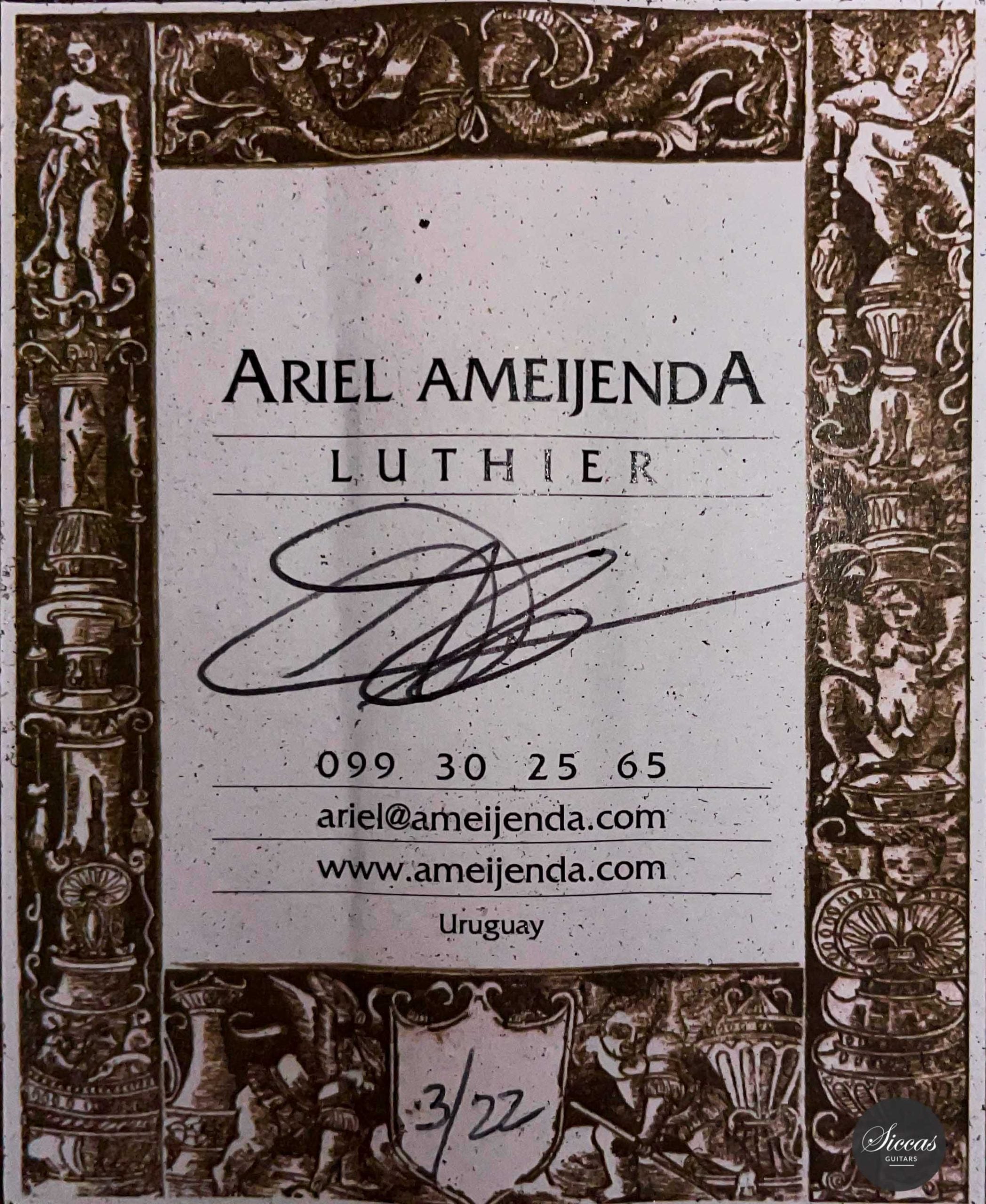 Ariel Ameijenda was born in Montevideo, Uruguay, in 1963, as the son of one of the country’s most famous guitar makers, Manuel Ameijenda. Ariel’s father learned this complex art from one of Ignacio Fleta’s pupils: Juan Carlos Santurion. Ariel Ameijenda started to help his father in the workshop at a very young age young, and he quickly developed great skills in different techniques of guitar making. In 1997 Ariel Ameijenda opened his own workshop in Montevideo. He is now selling guitars and period string instruments to musicians all over the world. In 2014, Ariel moved to the heavenly settings of the Cerro de los Burros near the city of Piriapolis on the East Coast of Uruguay.