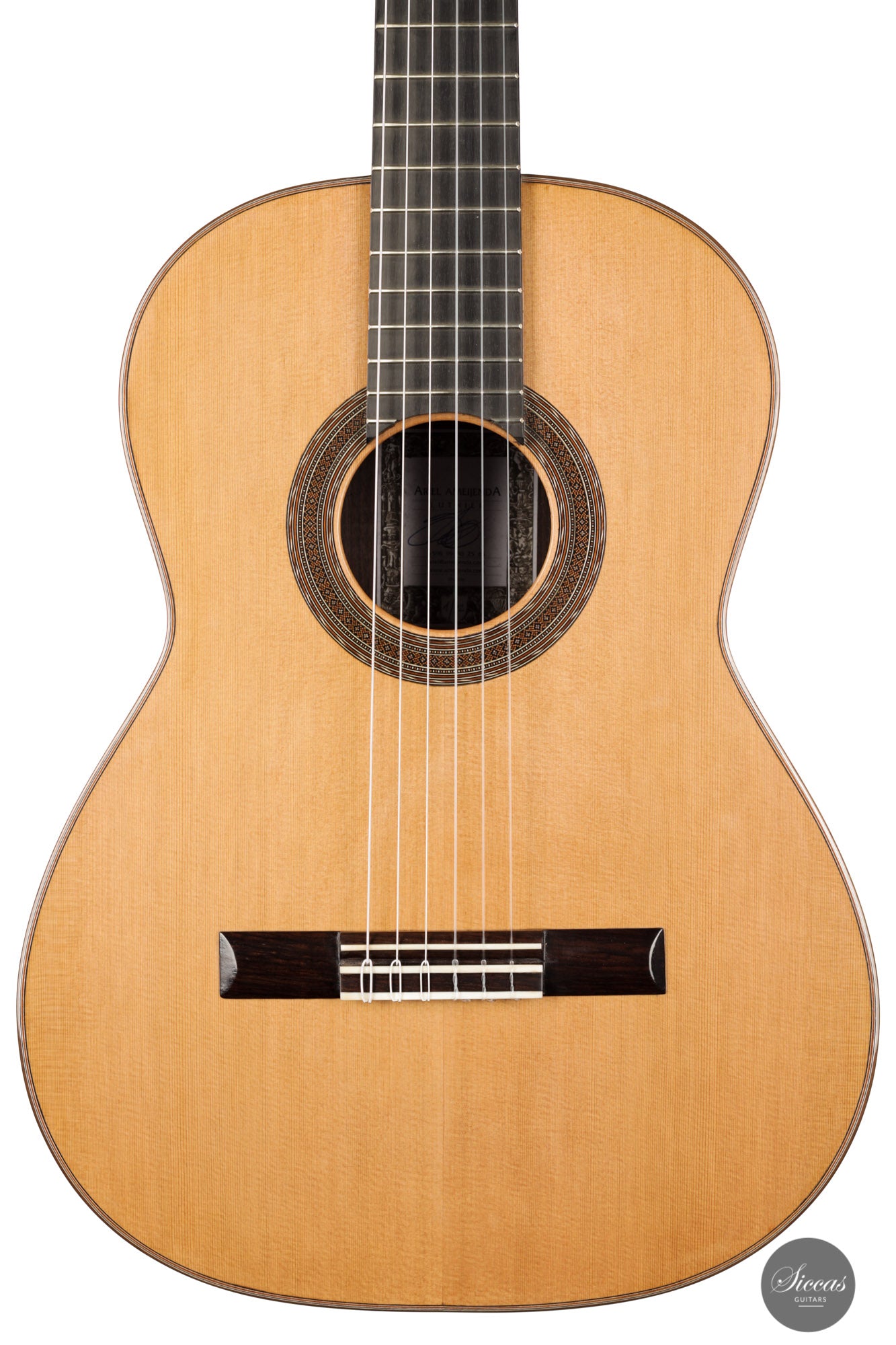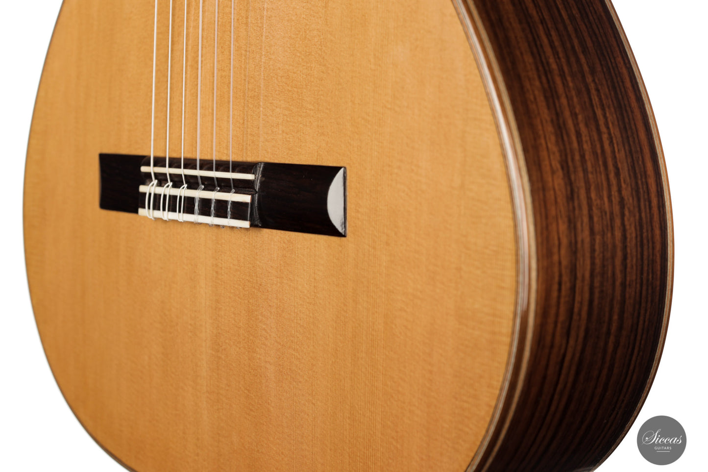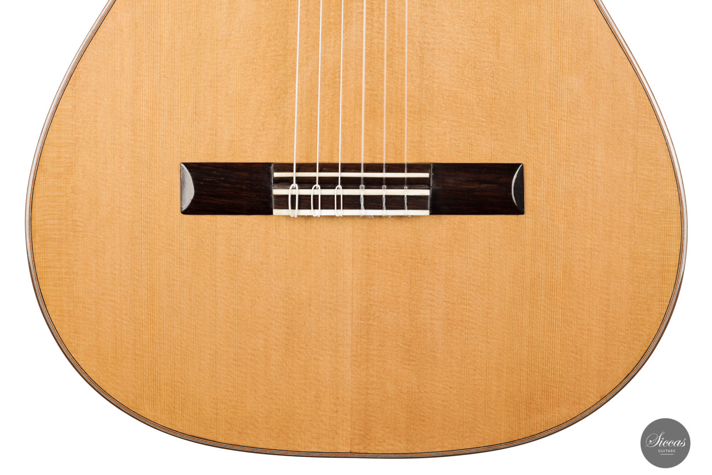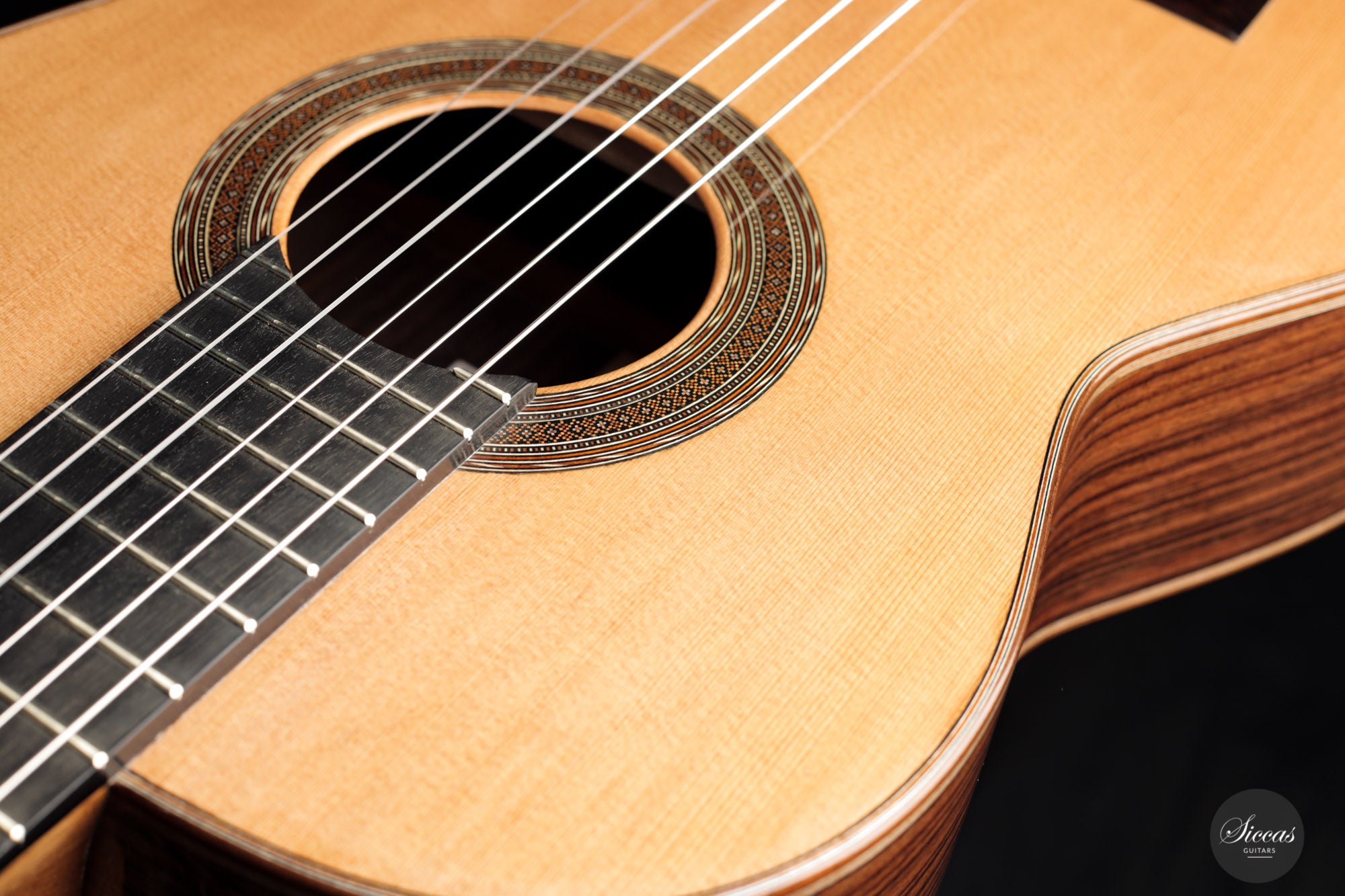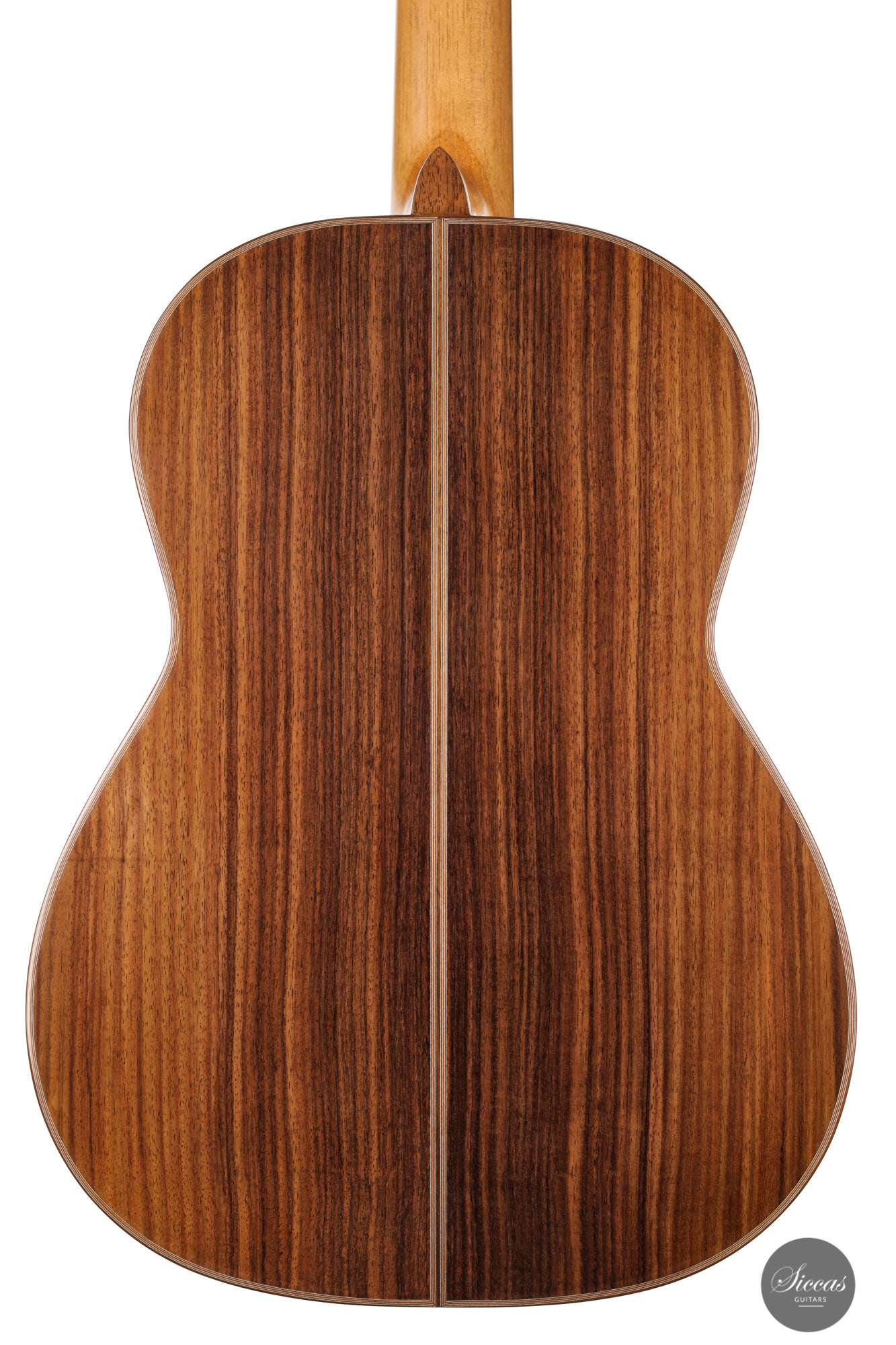 This shorter scale guitar is a special order from our shop, focussing on the highest quality sound and most comfortable playability. Coming directly from Ariel’s workshop, this cedar top 64 cm scale has a warm and open sound. The bracing is inspired by Antonio de Torres’ guitars, making this instrument very responsive, colorful, and joyful. In addition, a nice set of Indian rosewood was chosen for the back and sides, giving this guitar an elegant and classy appearance. Overall, it is a very expressive concert guitar with a powerful sound and ideal playing comfort.