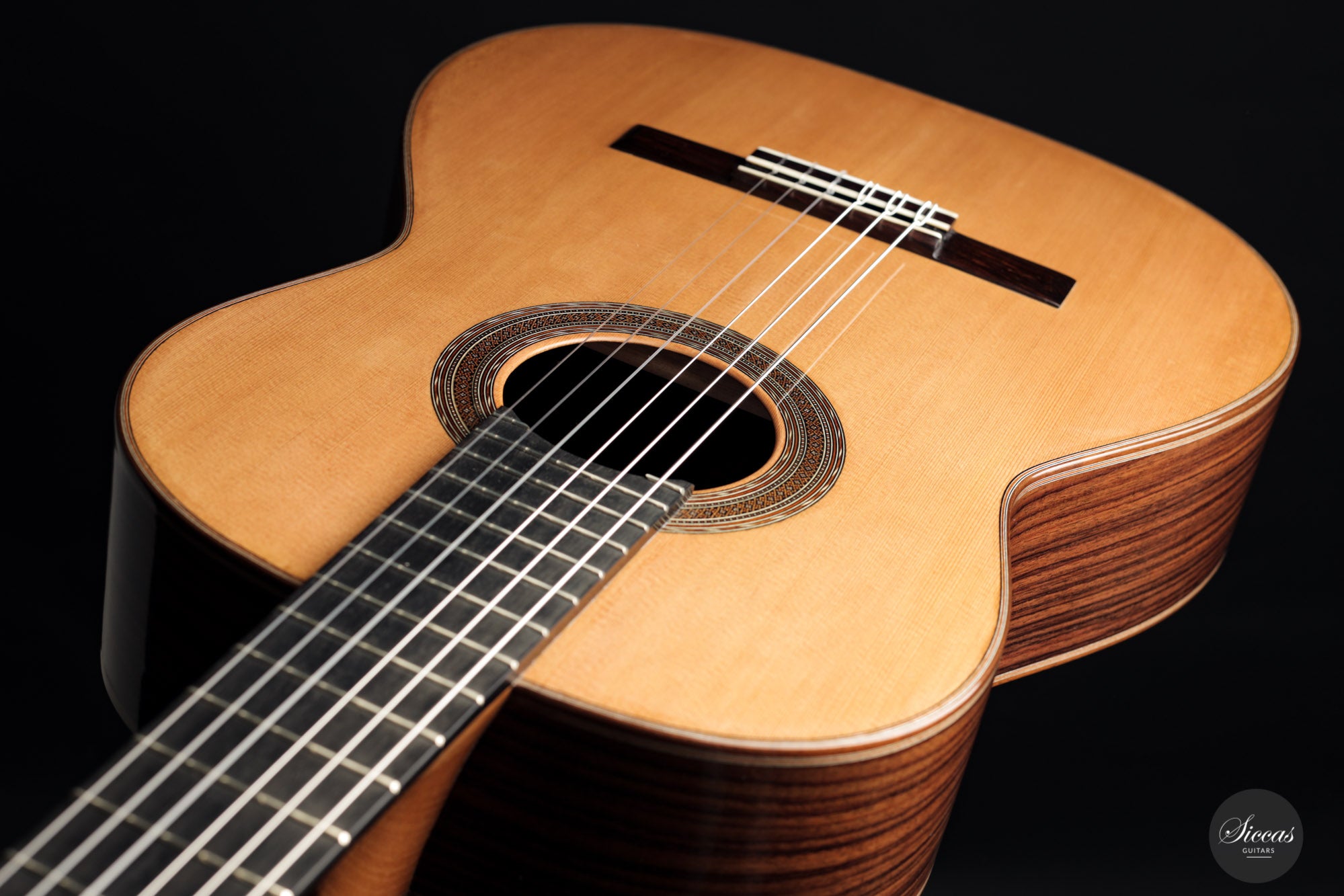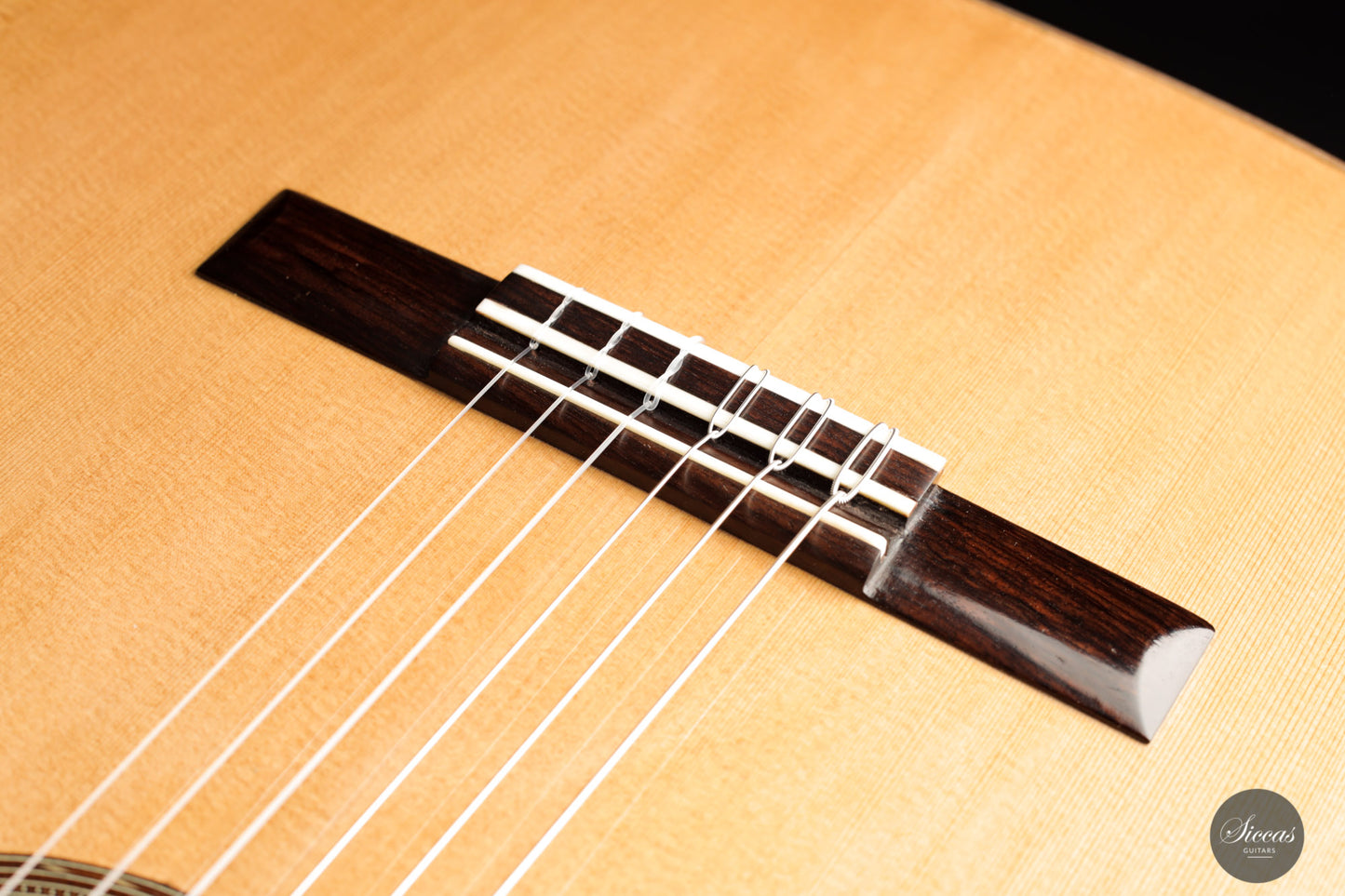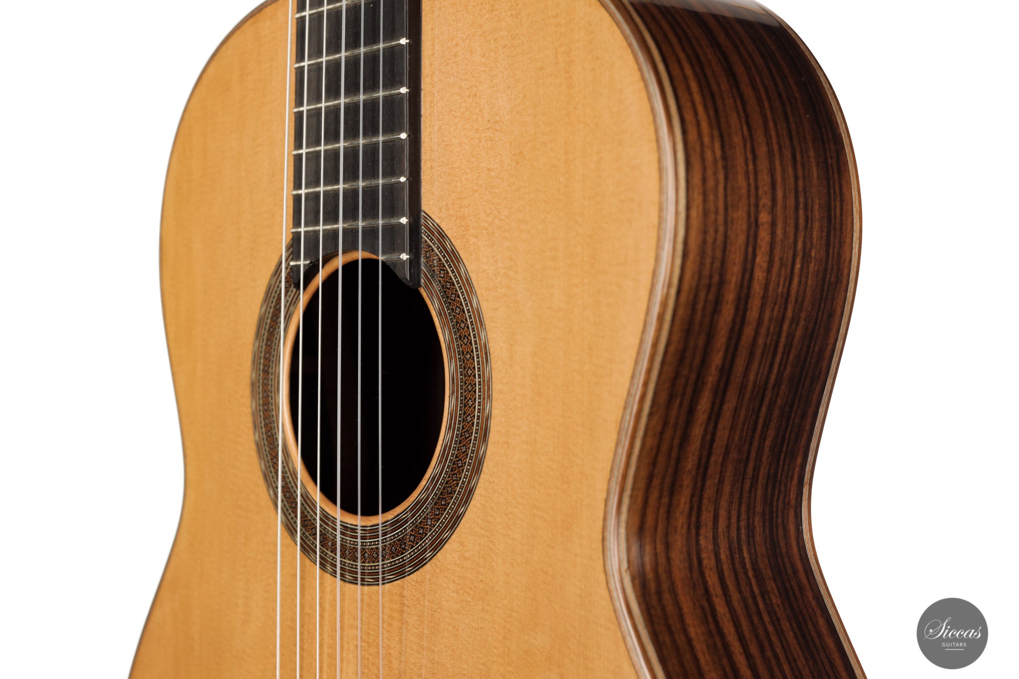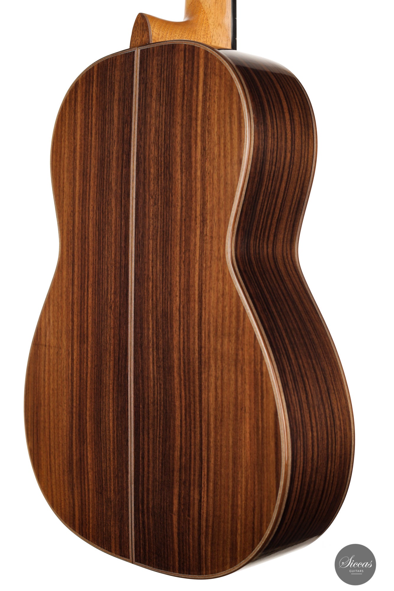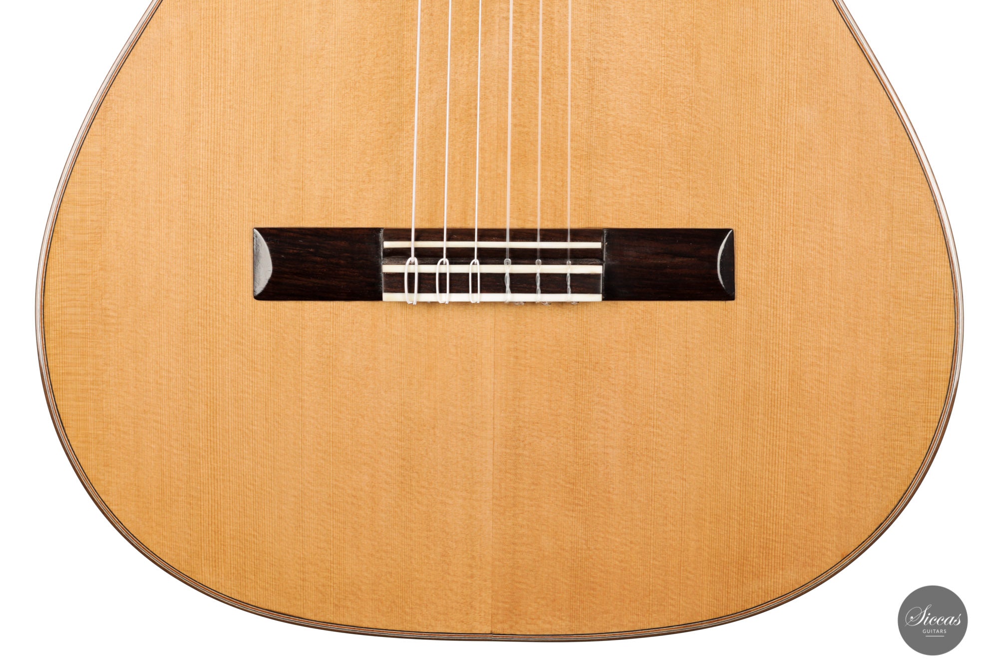 This shorter scale guitar is a special order from our shop, focussing on the highest quality sound and most comfortable playability. Coming directly from Ariel’s workshop, this cedar top 64 cm scale has a warm and open sound. The bracing is inspired by Antonio de Torres’ guitars, making this instrument very responsive, colorful, and joyful. In addition, a nice set of Indian rosewood was chosen for the back and sides, giving this guitar an elegant and classy appearance. Overall, it is a very expressive concert guitar with a powerful sound and ideal playing comfort.