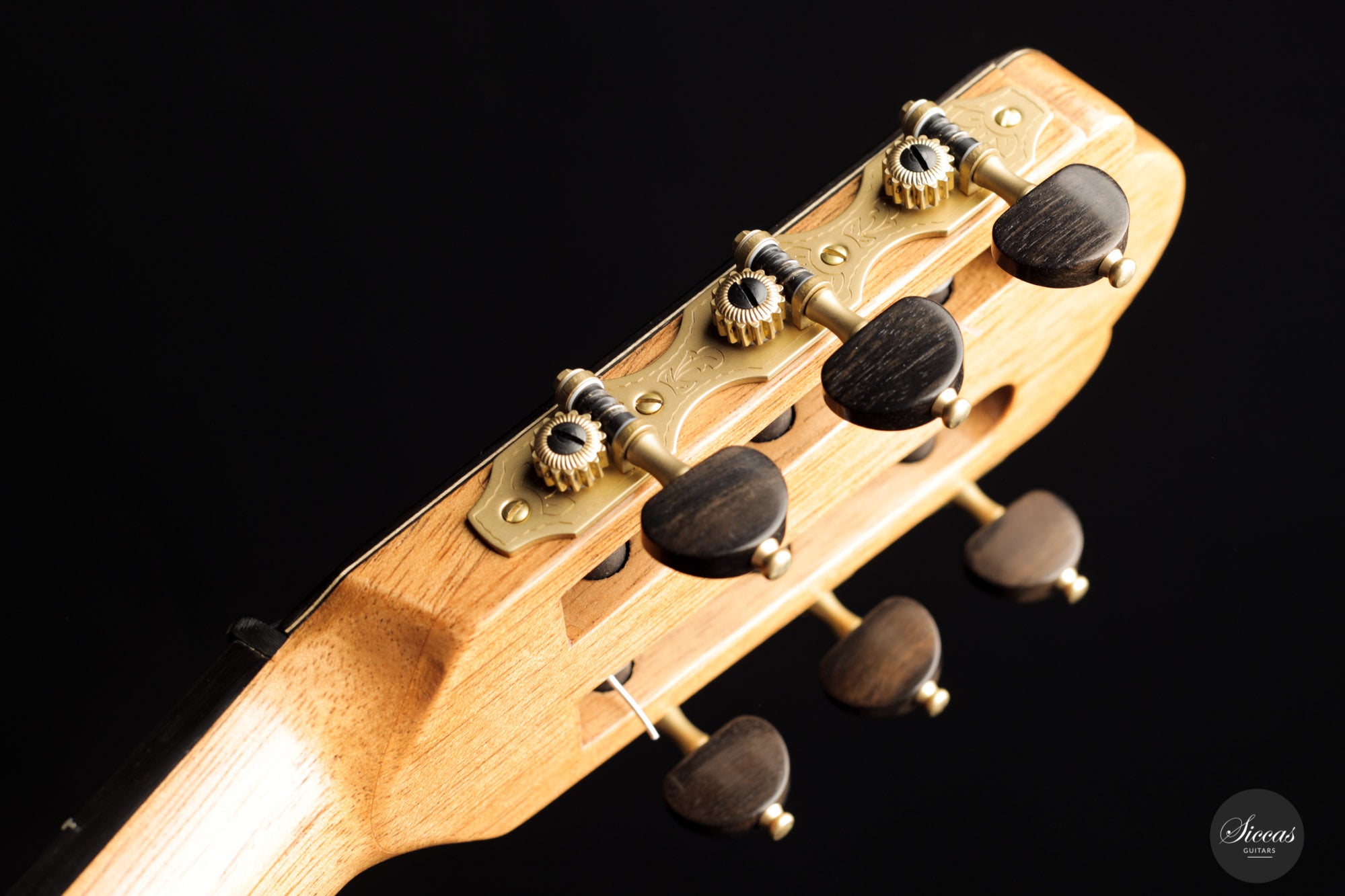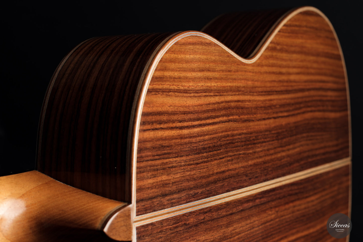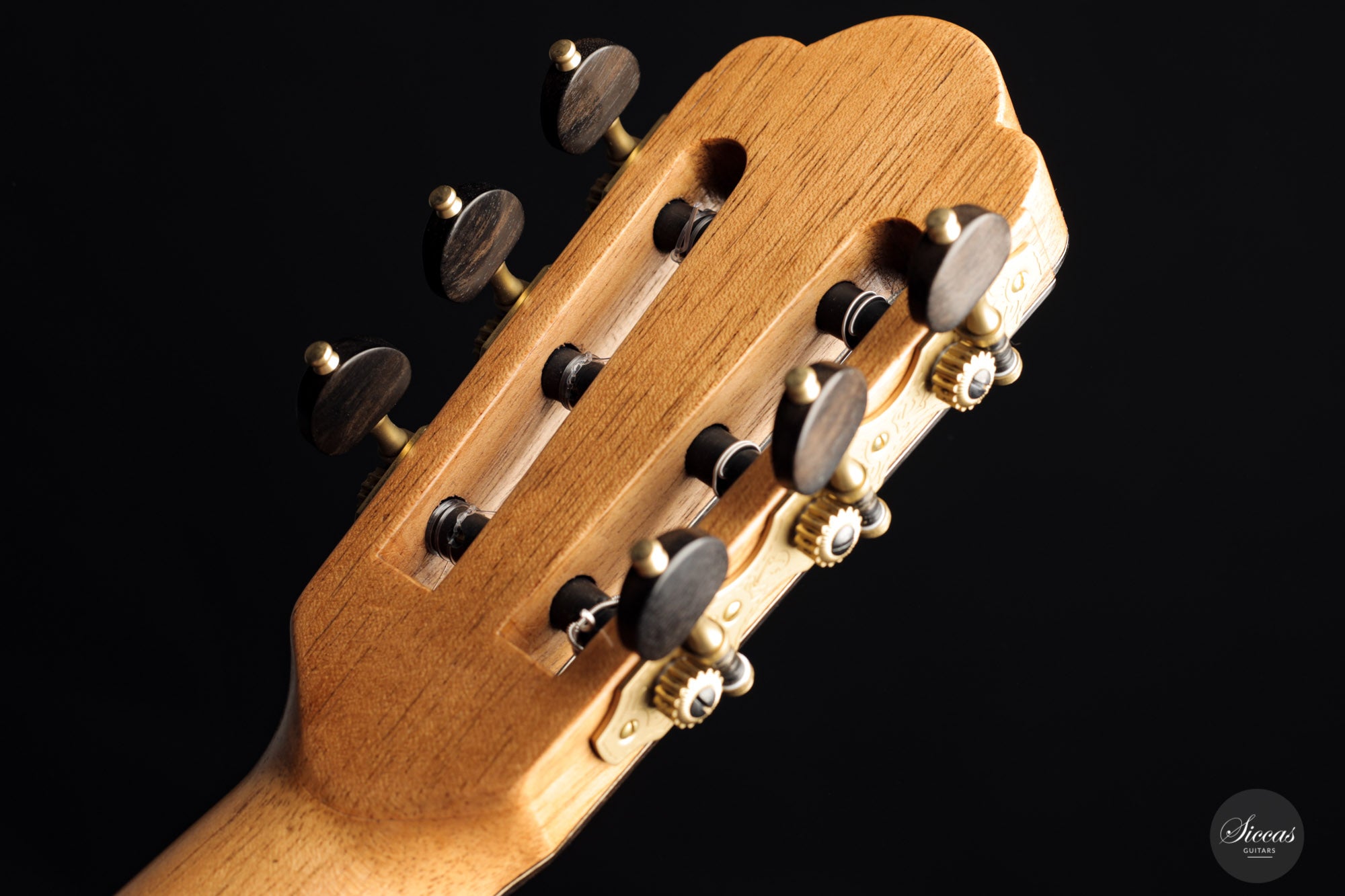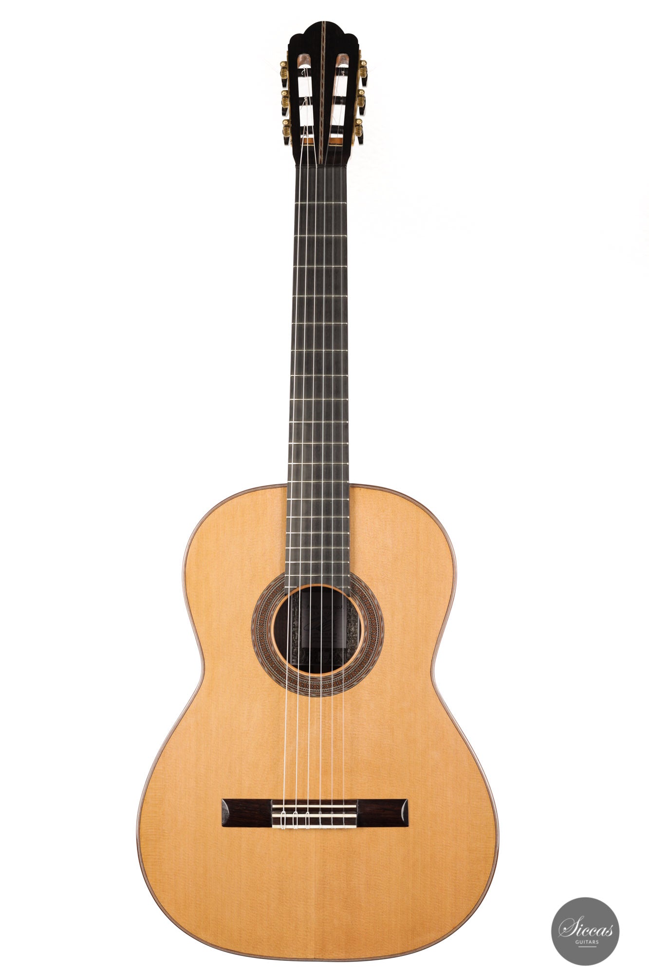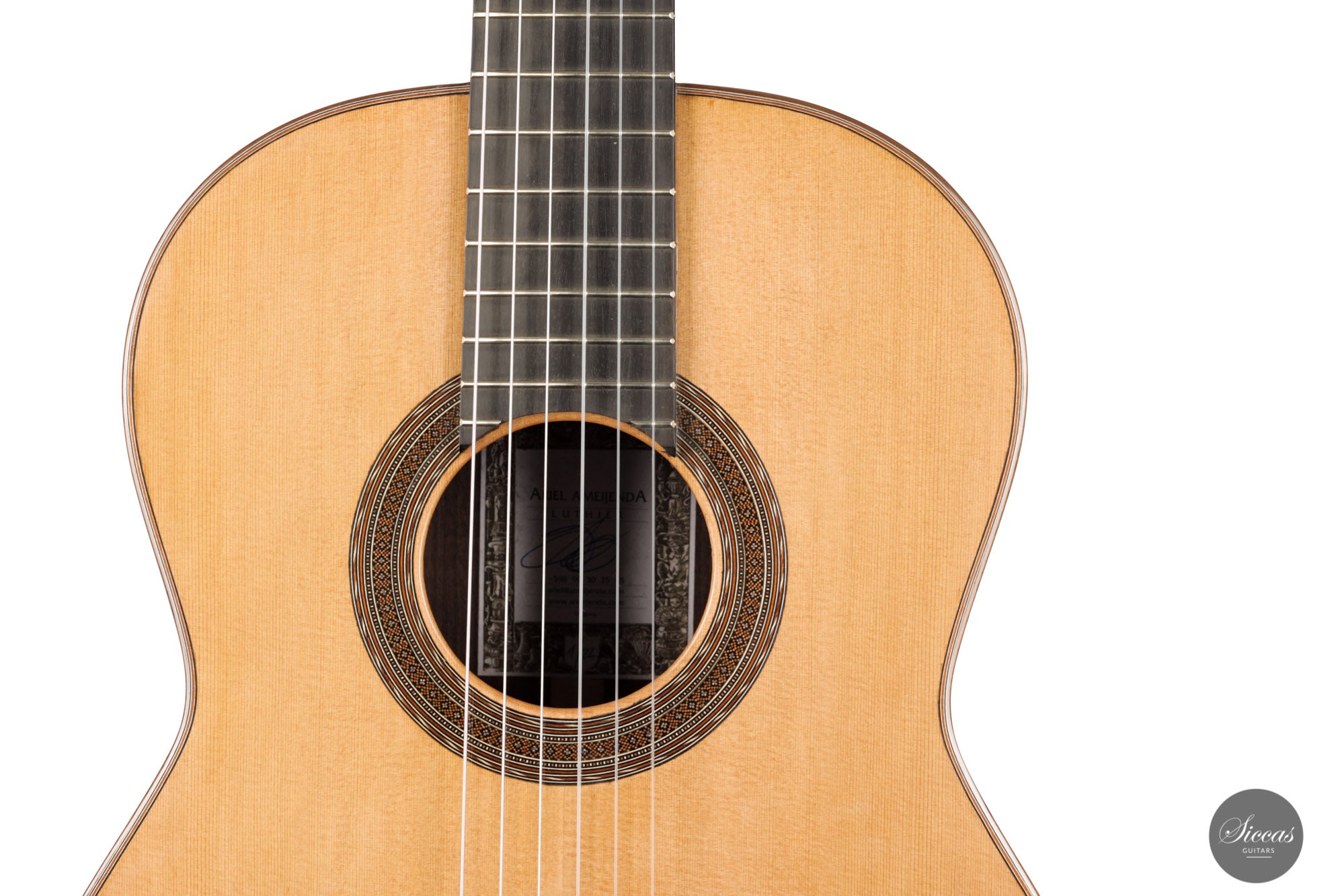 This shorter scale guitar is a special order from our shop, focussing on the highest quality sound and most comfortable playability. Coming directly from Ariel’s workshop, this cedar top 64 cm scale has a warm and open sound. The bracing is inspired by Antonio de Torres’ guitars, making this instrument very responsive, colorful, and joyful. In addition, a nice set of Indian rosewood was chosen for the back and sides, giving this guitar an elegant and classy appearance. Overall, it is a very expressive concert guitar with a powerful sound and ideal playing comfort.