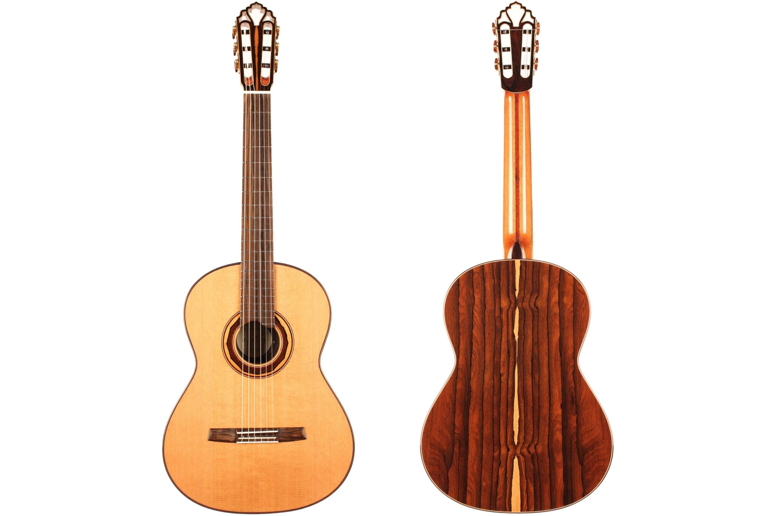 Price: 5.990 €Sale price 5.990 € Price:Unit price / per Tax free (0% DE)0 €Save: -5.990 €Luthier: Elvis PajaresConstruction Year: 2025Construction Type: Double TopTop: CedarBack and Sides: Indian rosewoodSoundboard Finish: French polishBody Finish: French polishAir Body Frequency: F / F sharpWeight (g): 1415Tuner: Kris BarnettCondition: New -