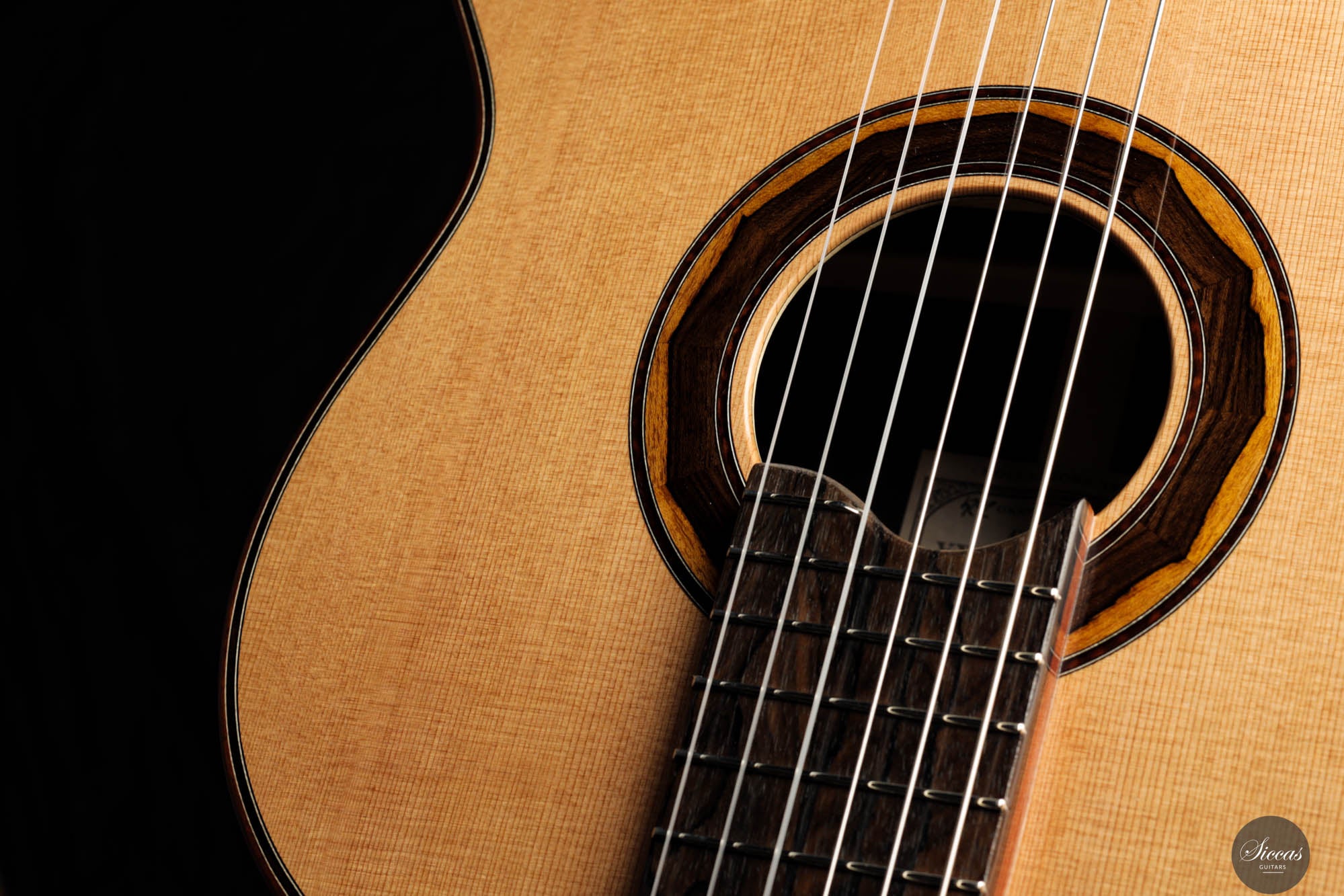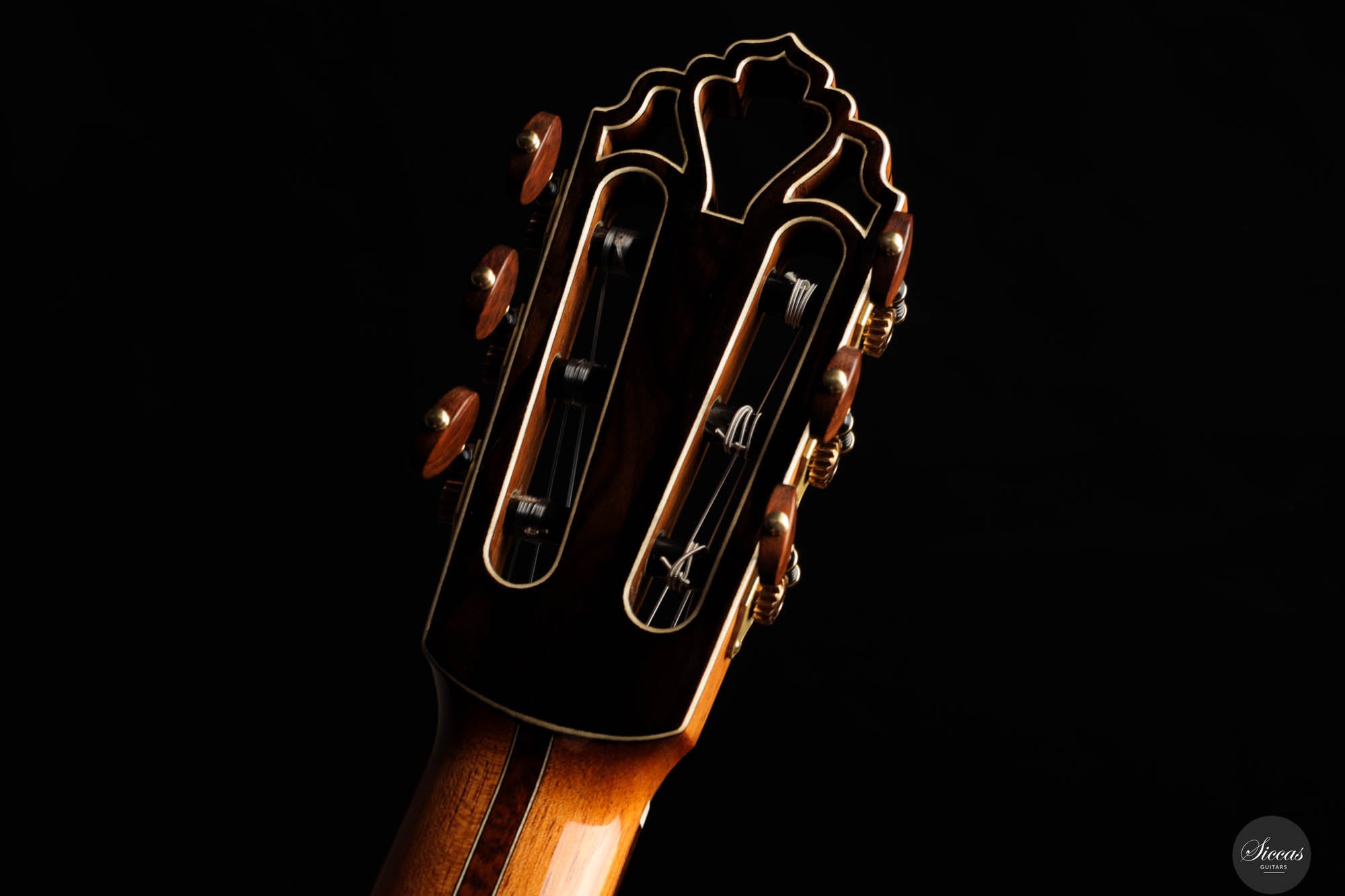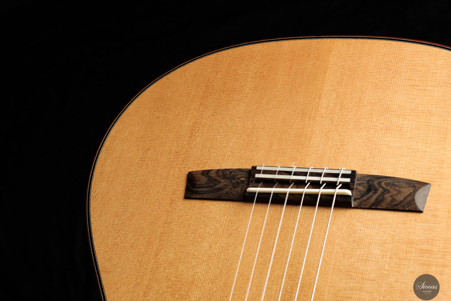 The 1a Lattice models represent the pinnacle of Armin Hanika's guitar craftsmanship, showcasing exceptional beauty and sophistication. These models feature back and sides constructed from the finest hand-picked Mexican ziricote wood, complemented by a double-top lattice soundboard made from perfectly split cedar wood. The innovative design of the domed soundboard with lattice bracing enhances the guitar's efficiency, while Klaus Scheller tuning machines emphasize the high quality standards that the 1A Lattice demands. Visually, the guitar stands out with its body finished in a UV-curing high-gloss varnish and a soundboard meticulously hand-polished with shellac, presenting a stunning aesthetic that is as refined as it is durable.