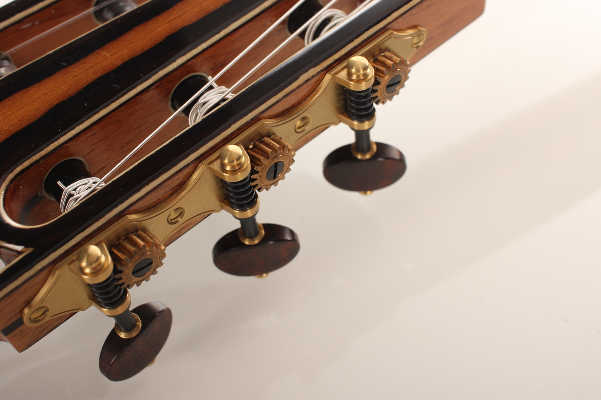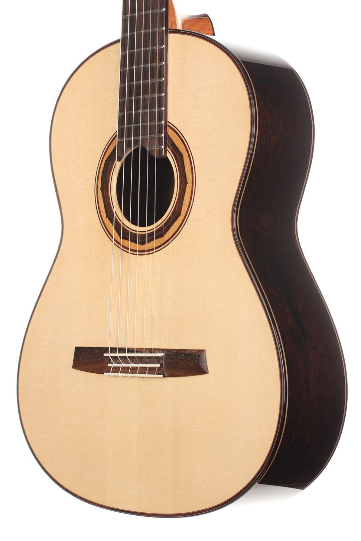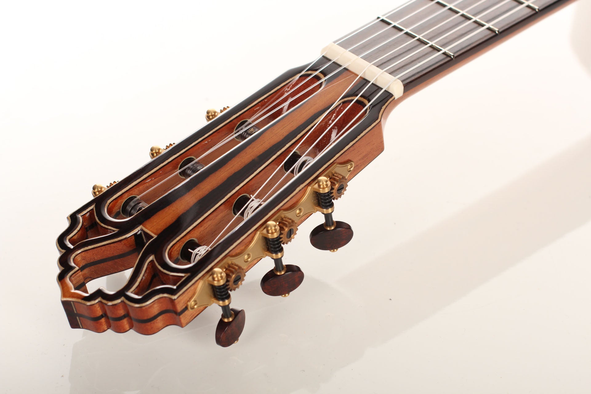 The guitar is made of high quality massive tone woods and has a high gloss French polish finish on the top. The body has a gloss finish with a UV-curing acrylic lacquer. The Klaus Scheller machine heads with bushes and snakewood pegs, the cedro neck reinforced with best hardwood, the quality ebony fingerboard and 3-ply rosewood-maple-ziricote headstock shows the high quality of the 1a Torres. A CCCase carbon case included. This guitar is CITES free (CF).
