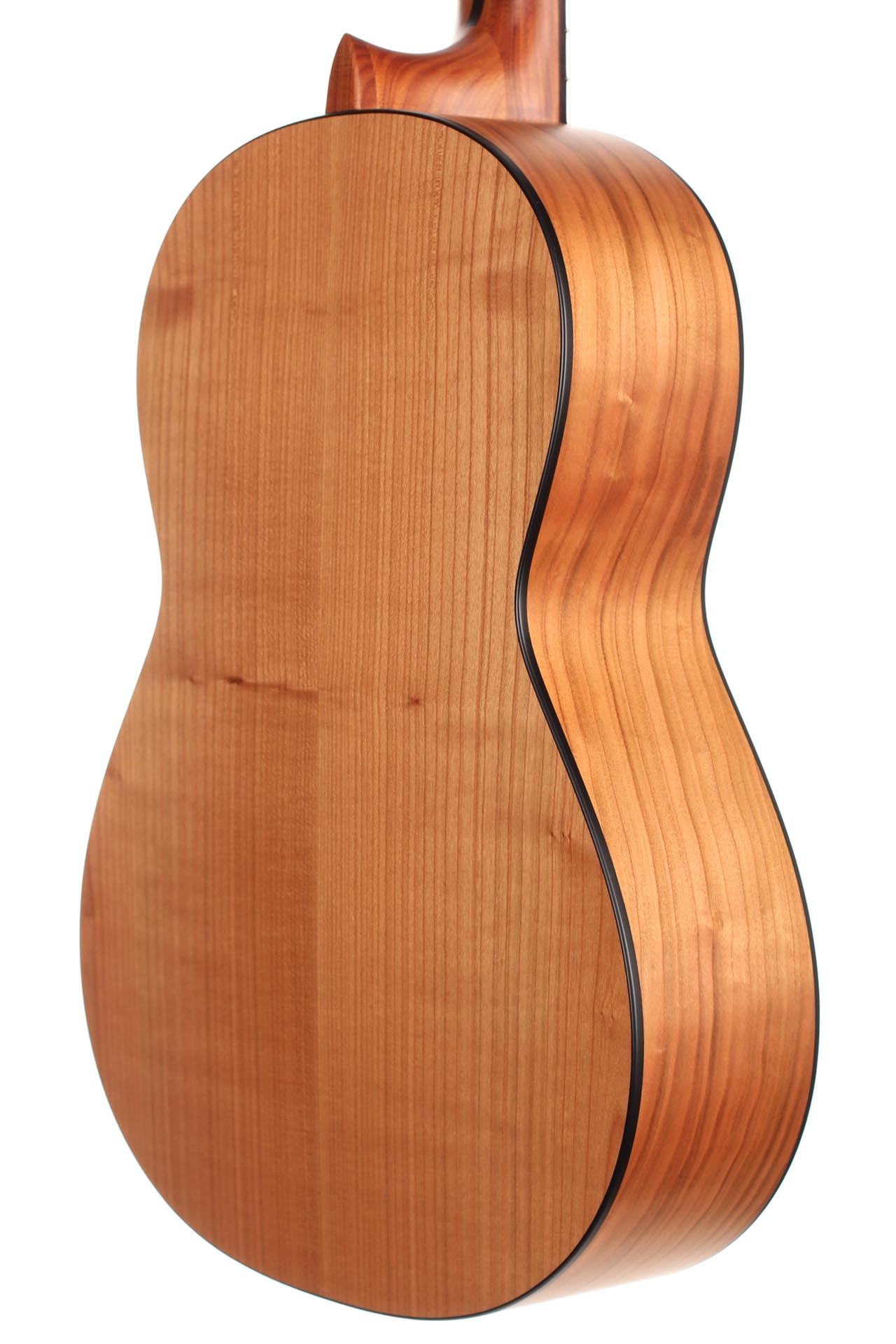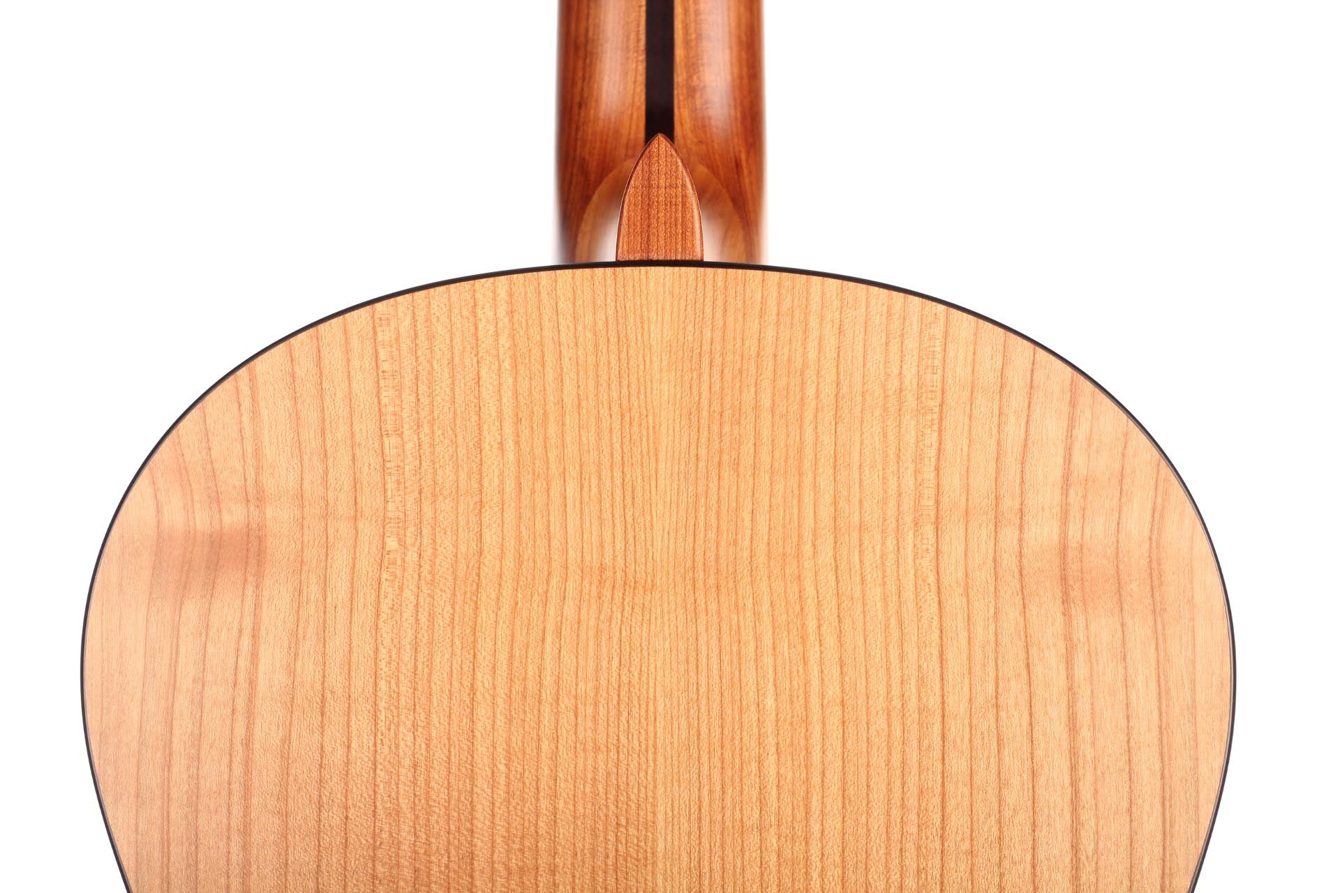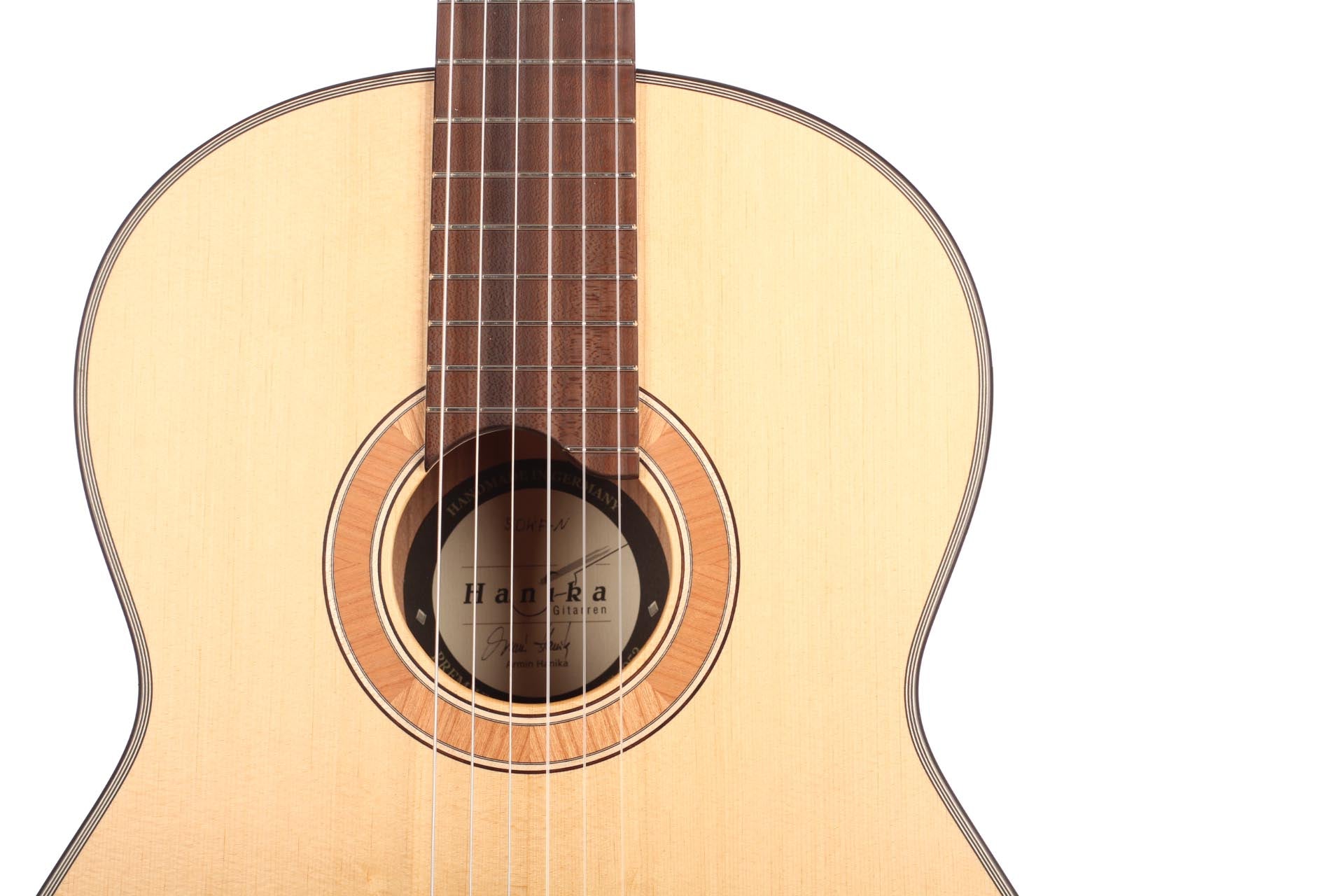 Armin Hanika 50 KF N 2017: Back and sides are manufactured of finest cherry wood and the top is made of excellent spruce. Along with the thin spruce top the 50 KF archieves a very good response with full sound and good separation. This guitar satisfies highest demands, it is recommended for conscious guitar players and can completely unfold especially in slow and carried pieces.