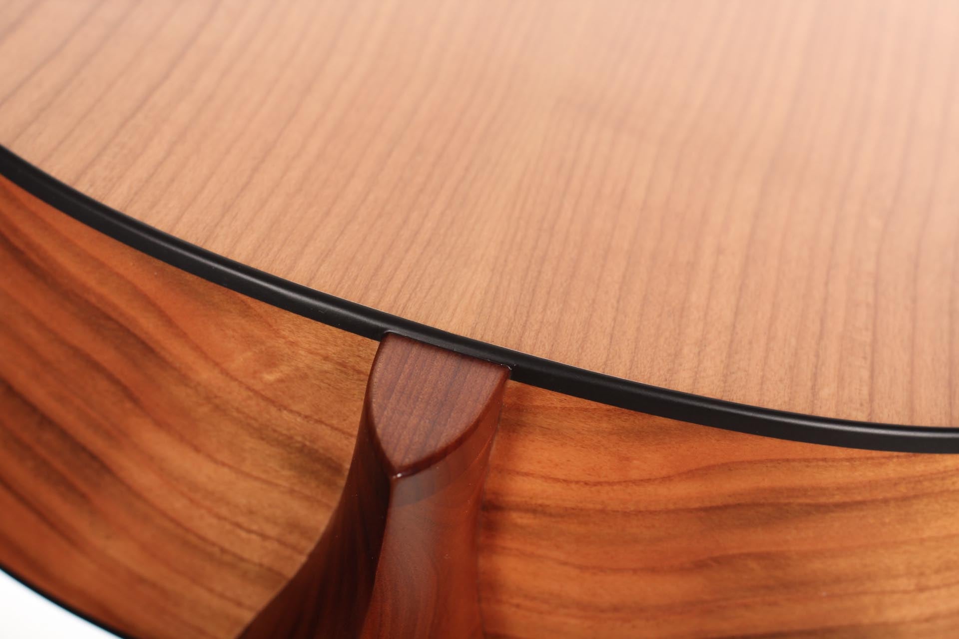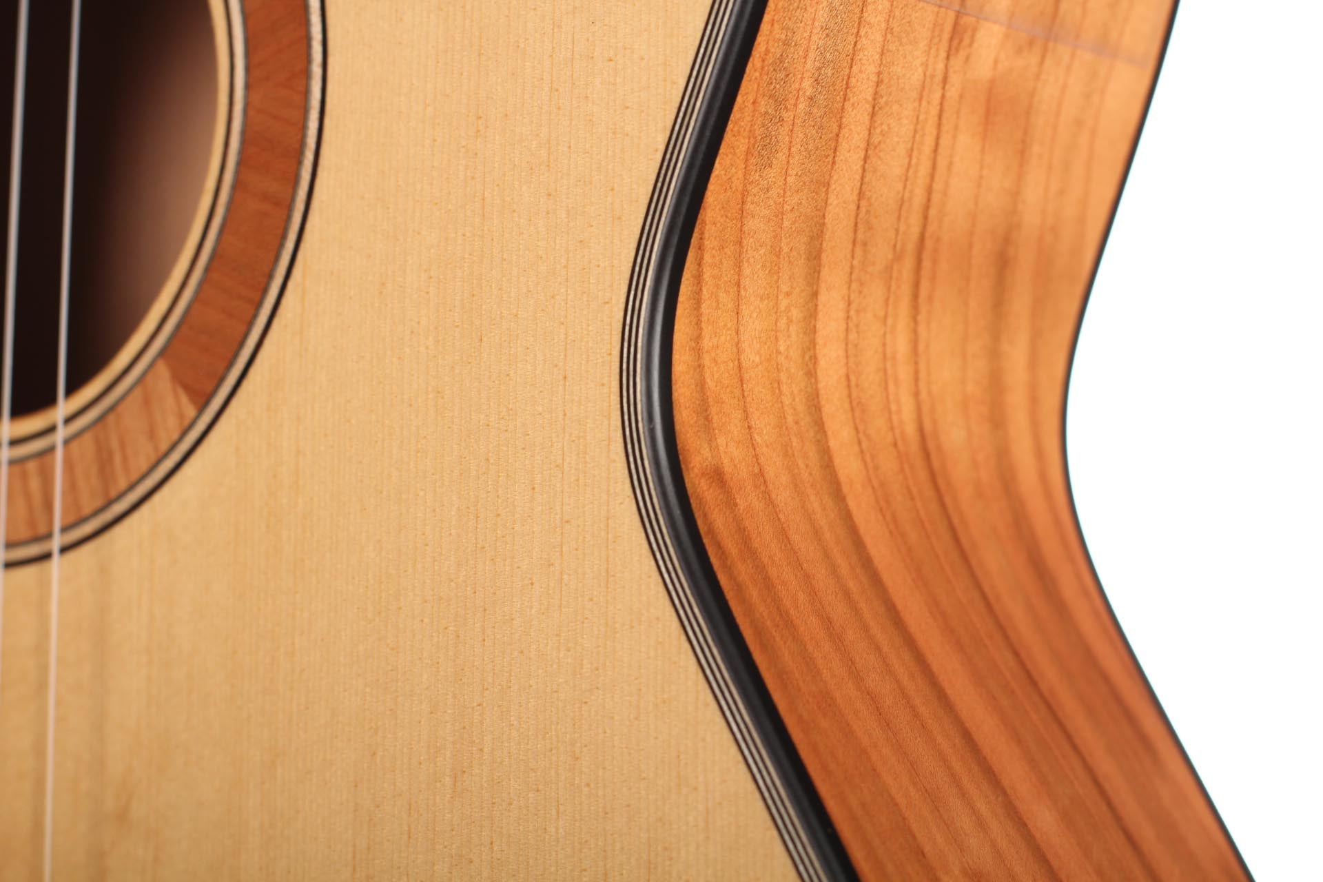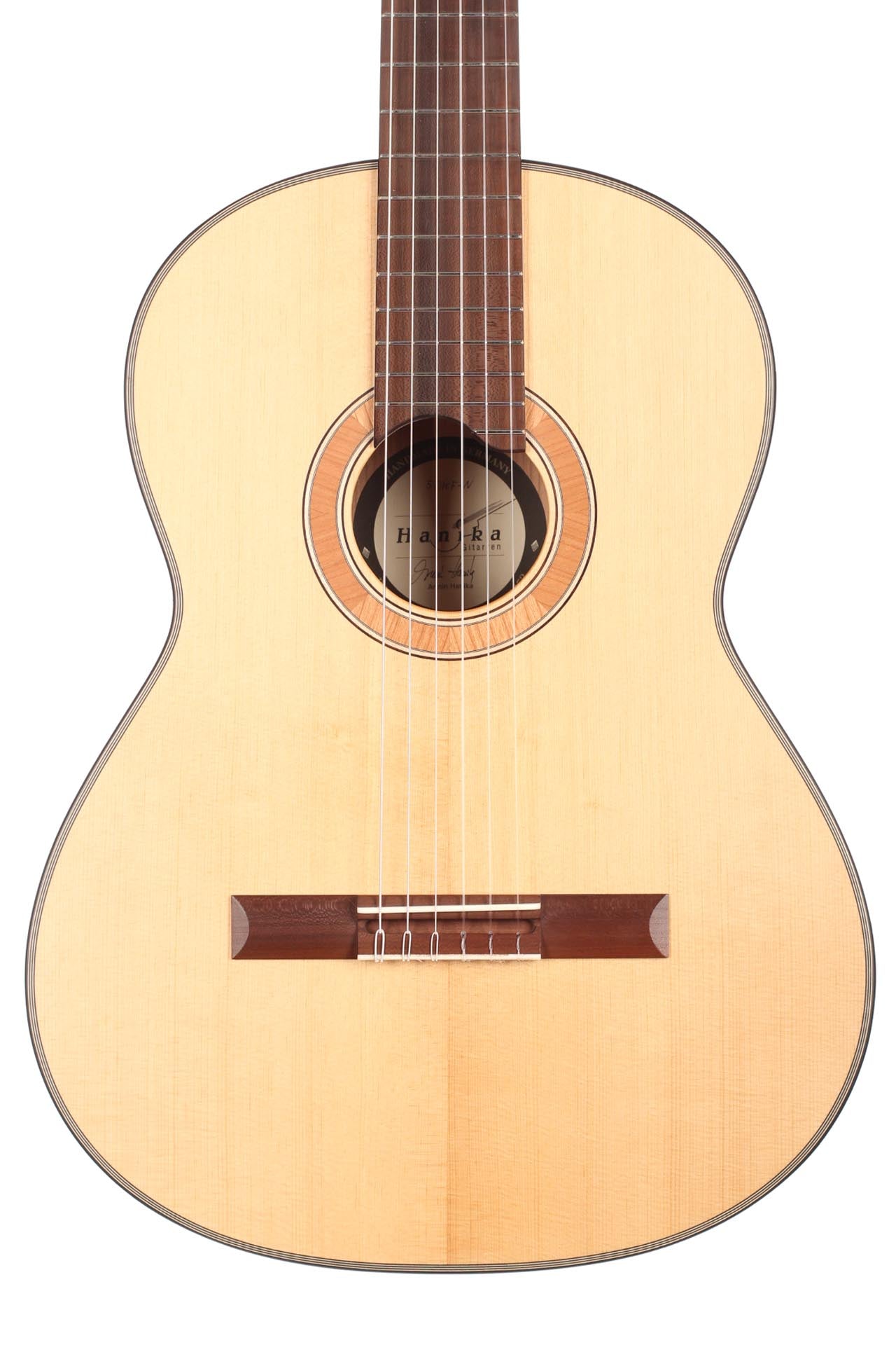Armin Hanika 50 KF N 2017: Back and sides are manufactured of finest cherry wood and the top is made of excellent spruce. Along with the thin spruce top the 50 KF archieves a very good response with full sound and good separation. This guitar satisfies highest demands, it is recommended for conscious guitar players and can completely unfold especially in slow and carried pieces.
