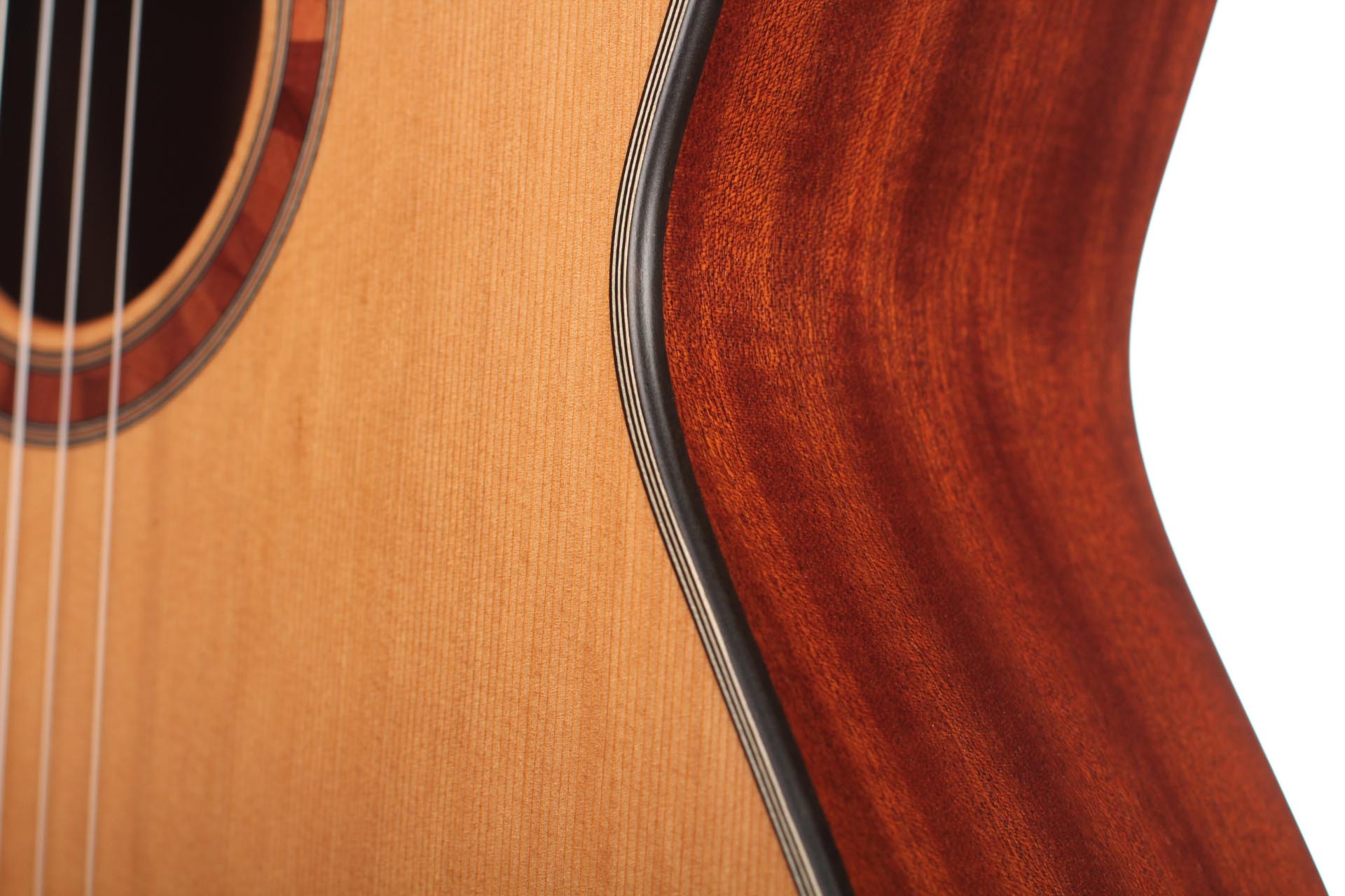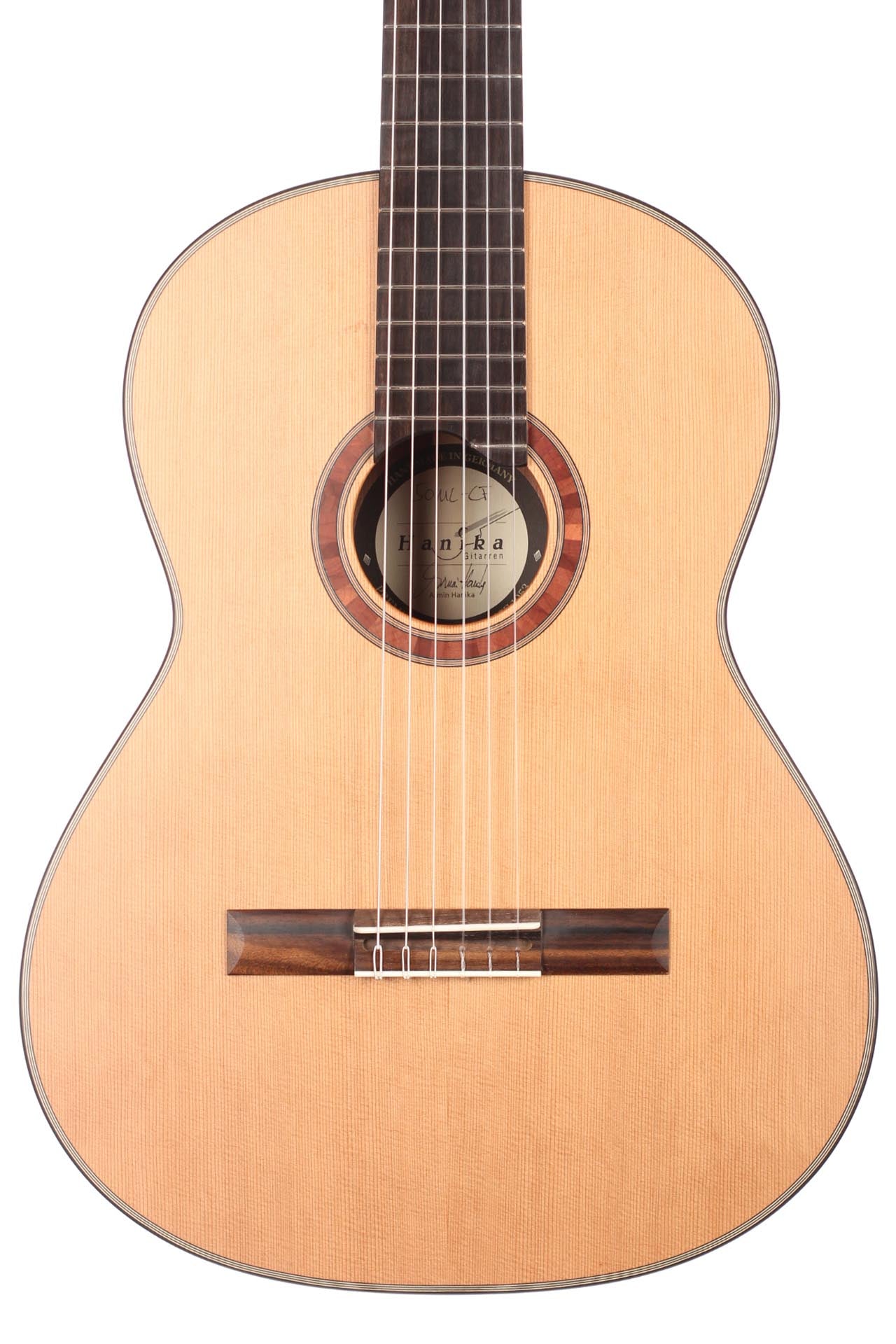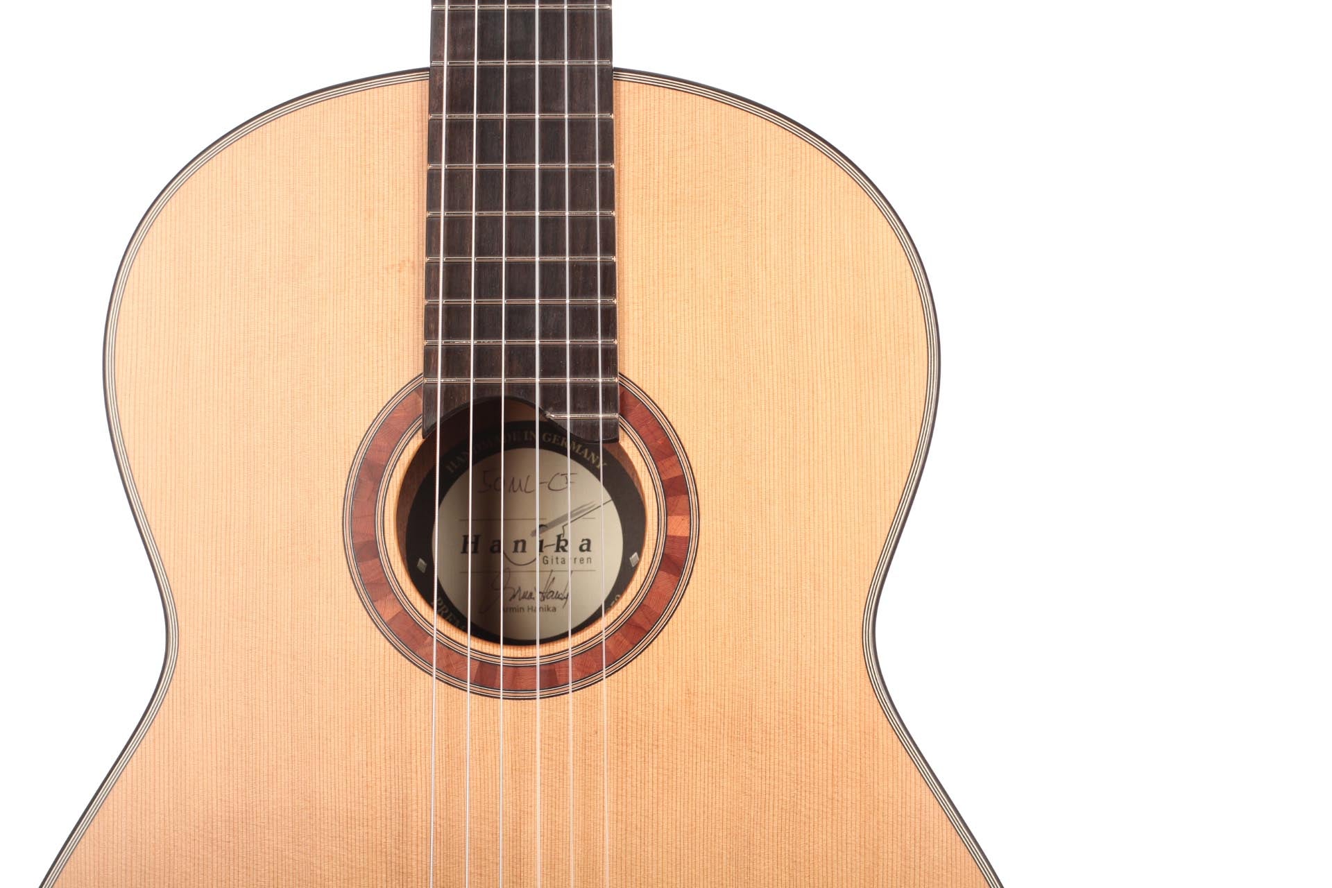 The Hanika 50 MC CF is a work of art crafted from the finest tonewoods, including a rich mahogany back and sides and a radiant cedar top. Its impeccable attack makes it the perfect companion for musicians as they develop their playing technique. Adorned with high-quality 'Rubner-Gold' mechanics and Teflon bearings, the 50 MC CF exudes sophistication and precision. The ebony inlaid Cedro neck, ebony fretboard, and hard bone saddle add to the guitar's overall beauty. The matte finish with PUR-Mattlack not only protects it from the elements, but also enhances its open and free-flowing sound.