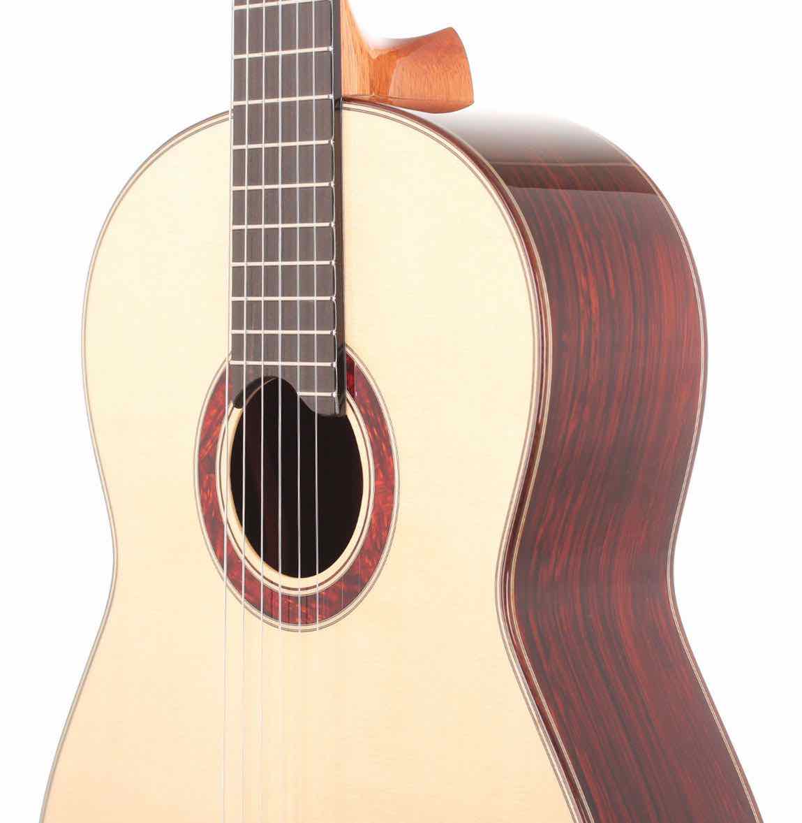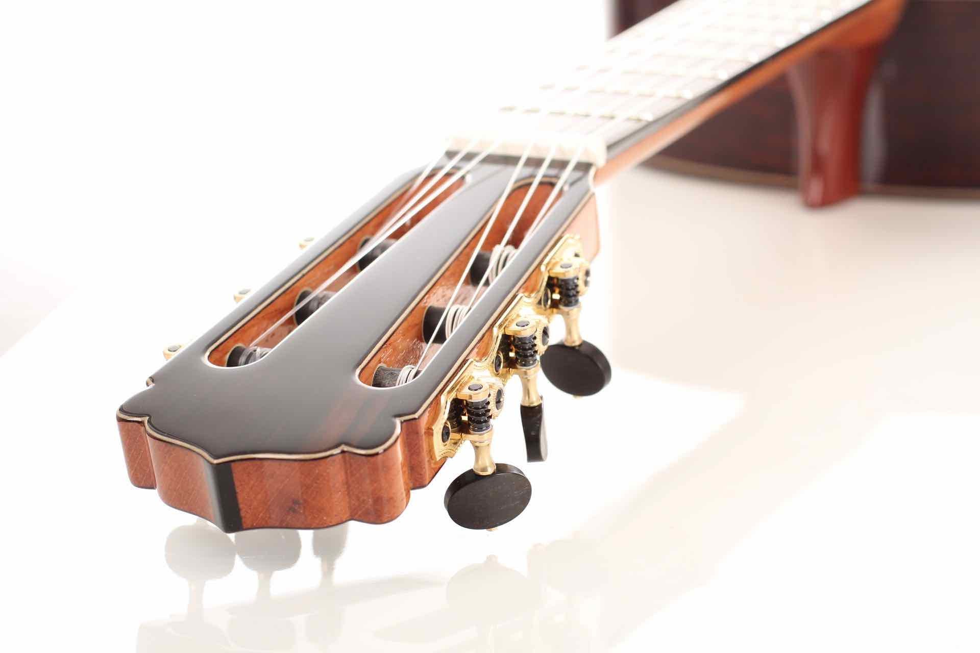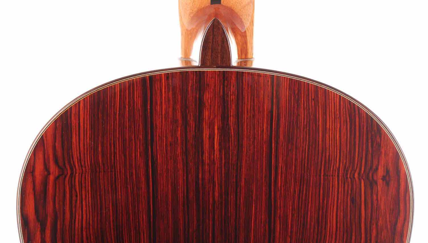 This Armin Hanika 58 CF has a solid spruce top and solid Cocobolo back and sides. The volume of this guitar and the quick response are impressive. The player gets a very good feedback and it's easy to play so that the player can play fast and virtuous. The balance between the treble, middle and bass is very good. The tuning machines are made by Rubner.