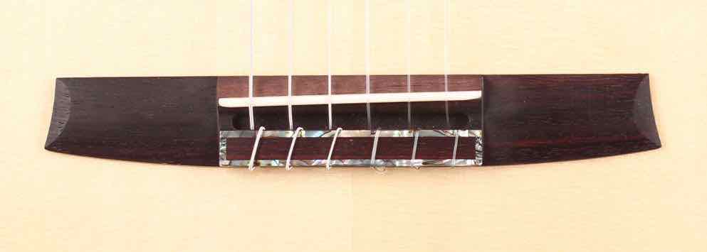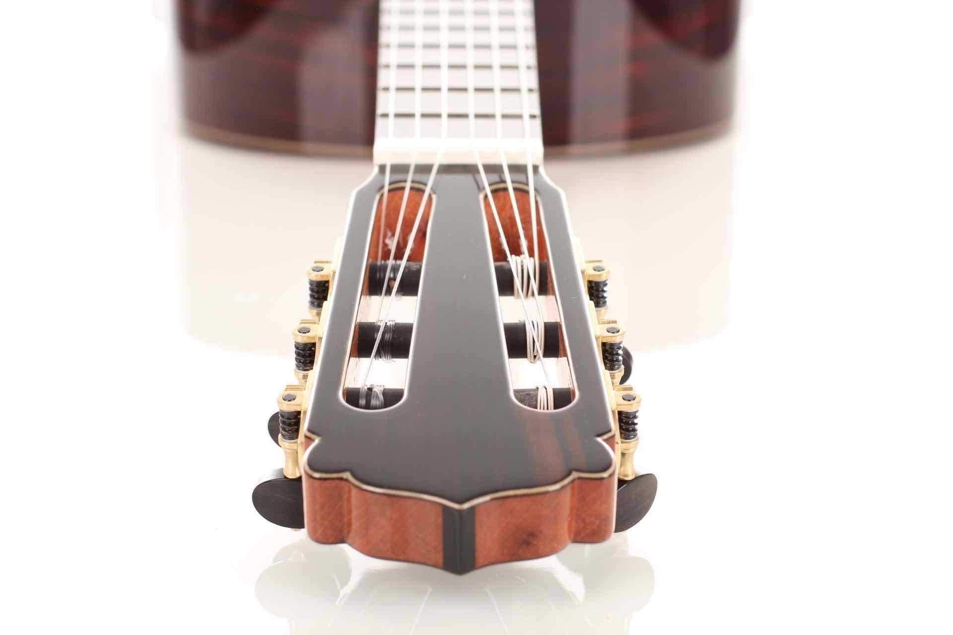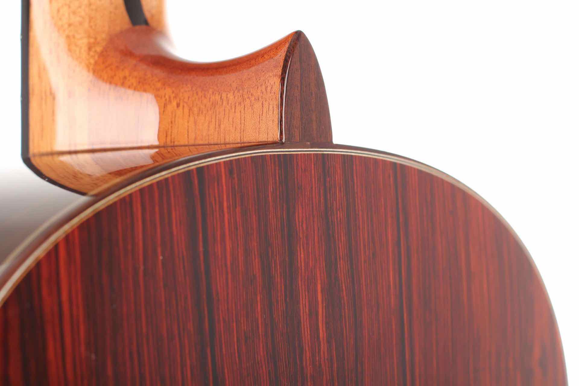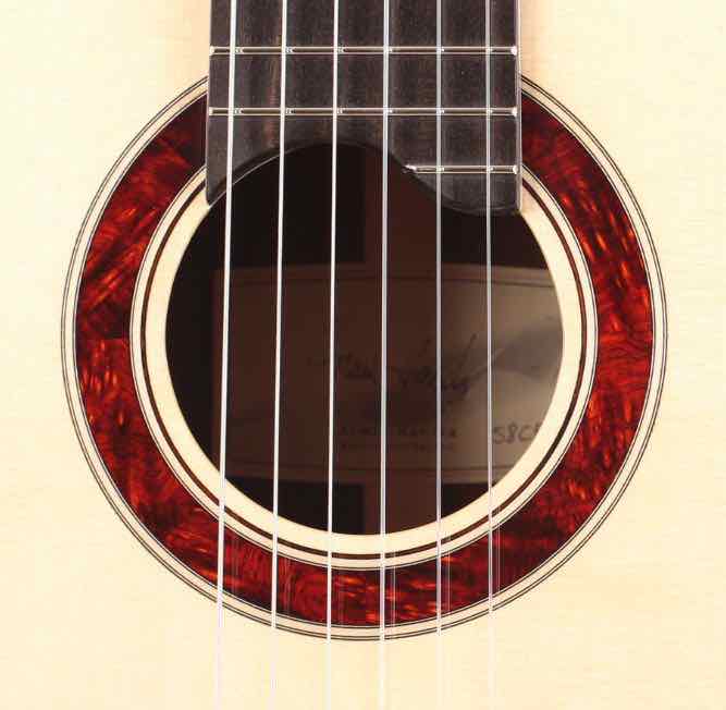 This Armin Hanika 58 CF has a solid spruce top and solid Cocobolo back and sides. The volume of this guitar and the quick response are impressive. The player gets a very good feedback and it's easy to play so that the player can play fast and virtuous. The balance between the treble, middle and bass is very good. The tuning machines are made by Rubner.