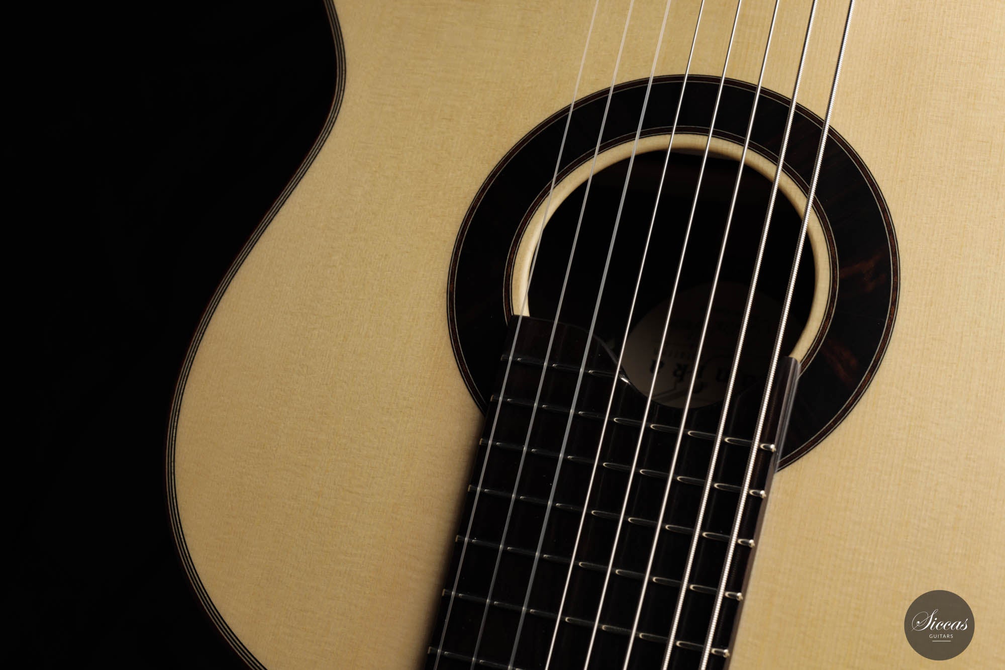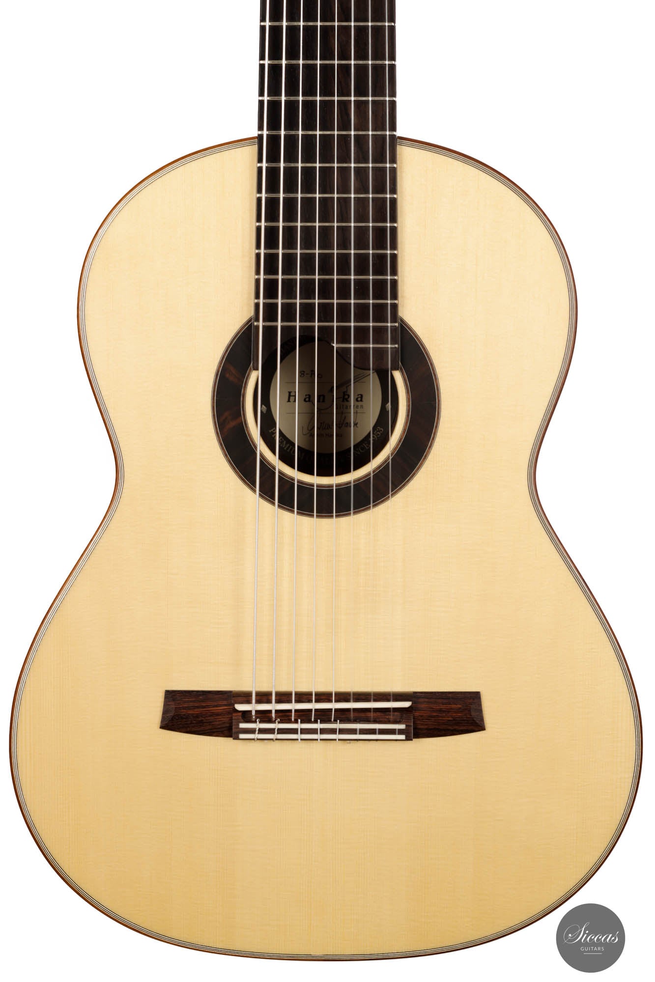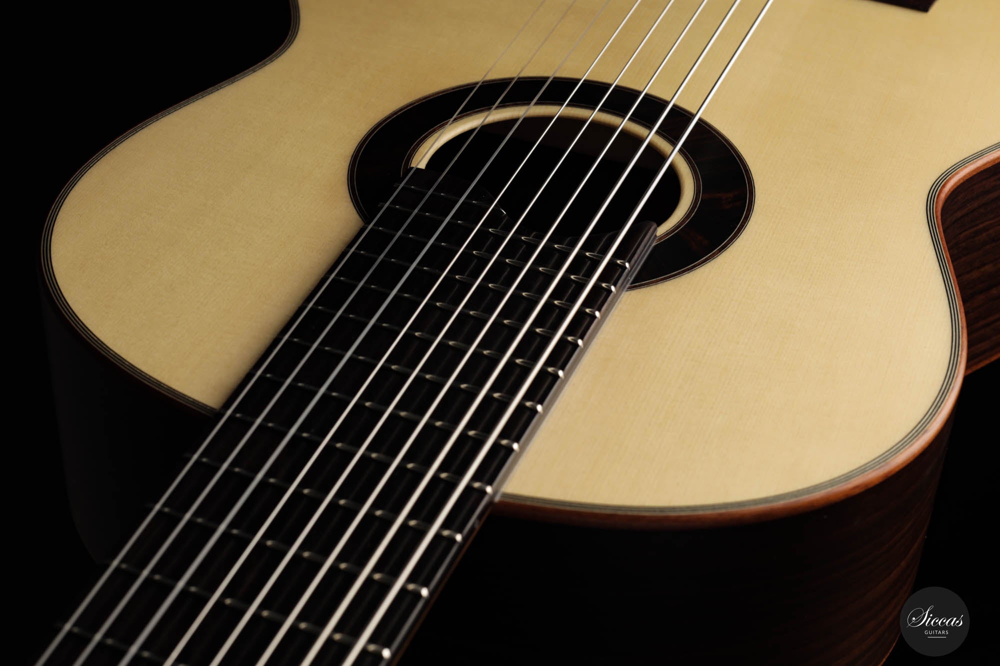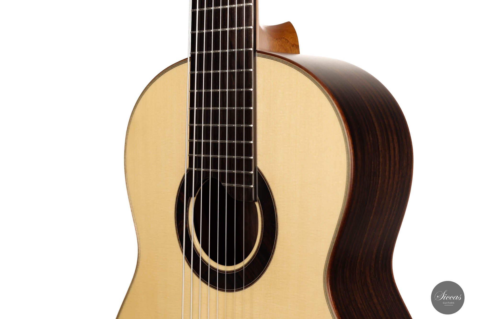 The Hanika 8-Pro stands as a concert instrument of remarkable refinement, built from East Indian rosewood and a fine spruce top to deliver a powerful attack, full resonance and clarity. Its extended eight-string design expands the tonal range with deep, resonant basses, while the slightly narrowed string spacing ensures comfortable playability. A matte lacquered surface with closed pores enhances both projection and elegance, and the dome-shaped top with 7-fold Torres bracing supports tonal richness and stability. With Rubner tuners, reinforced Cedro neck and Grenadilla fittings, the 8-Pro offers a precise, versatile sound for ambitious repertoire.