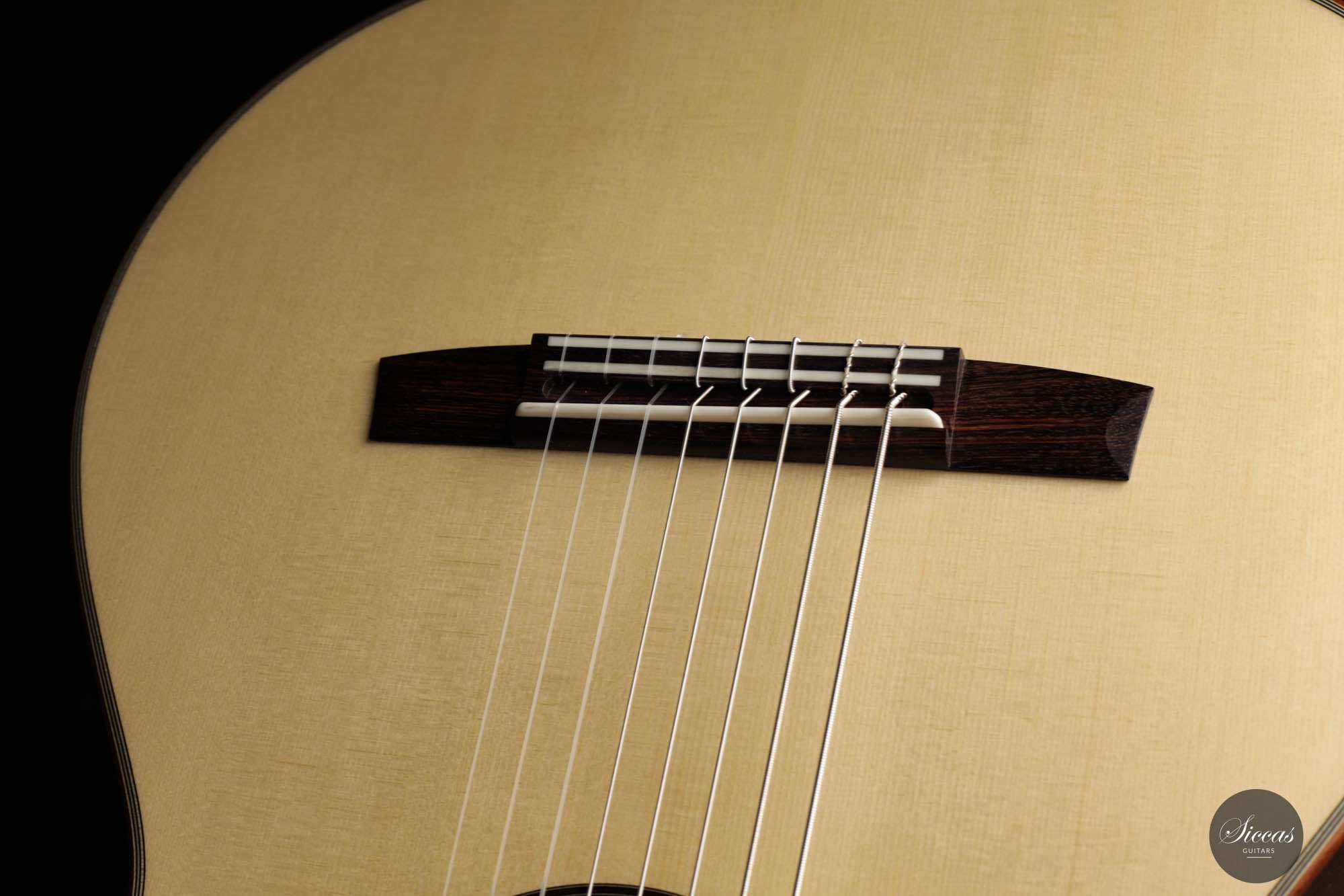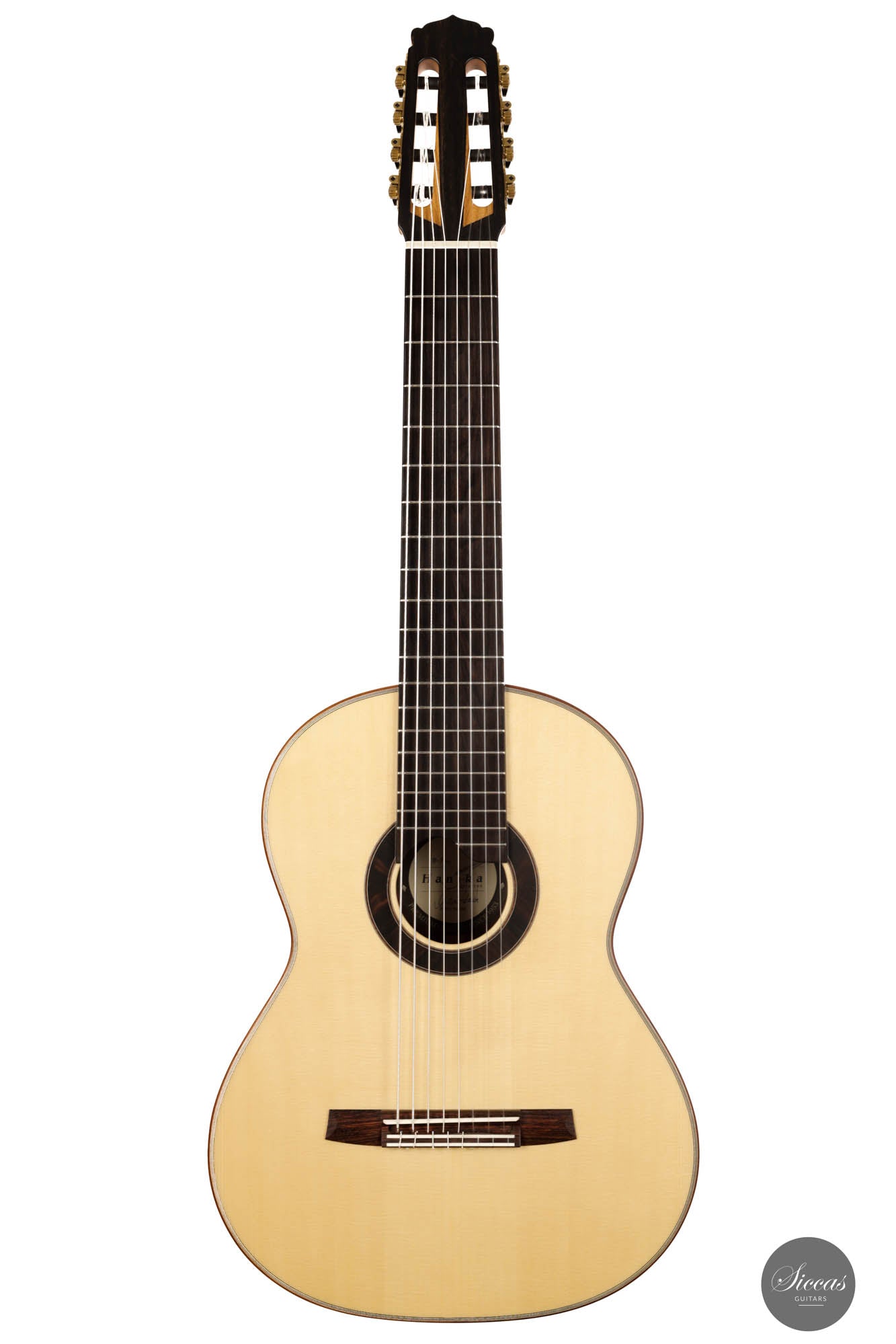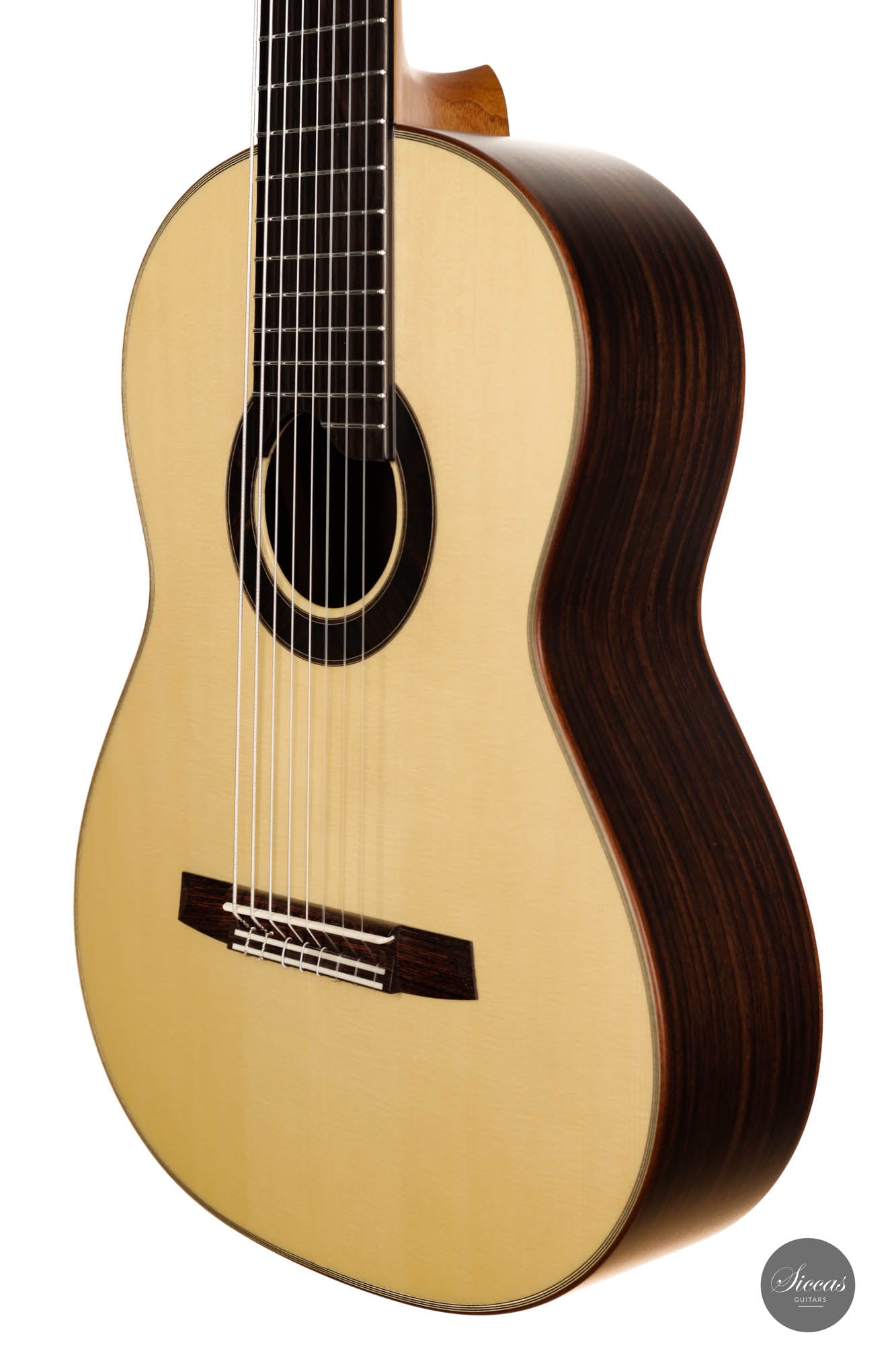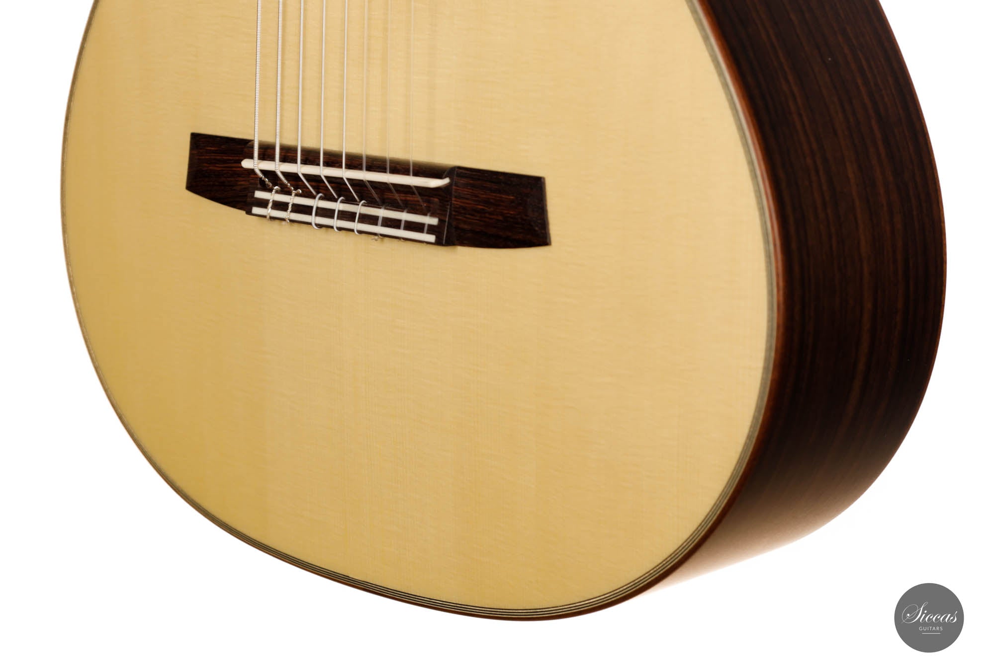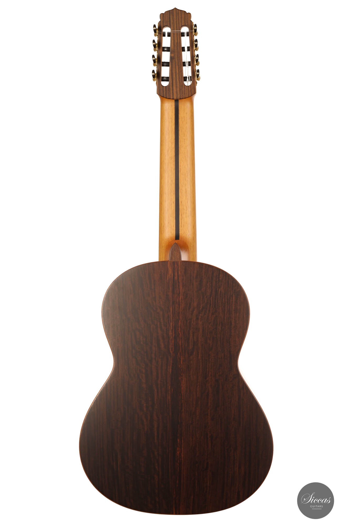 The Hanika 8-Pro stands as a concert instrument of remarkable refinement, built from East Indian rosewood and a fine spruce top to deliver a powerful attack, full resonance and clarity. Its extended eight-string design expands the tonal range with deep, resonant basses, while the slightly narrowed string spacing ensures comfortable playability. A matte lacquered surface with closed pores enhances both projection and elegance, and the dome-shaped top with 7-fold Torres bracing supports tonal richness and stability. With Rubner tuners, reinforced Cedro neck and Grenadilla fittings, the 8-Pro offers a precise, versatile sound for ambitious repertoire.