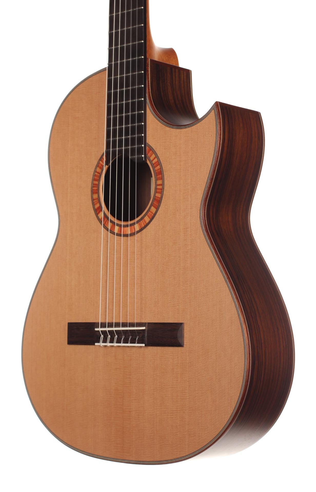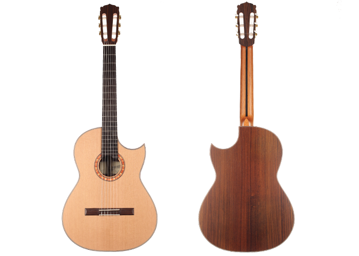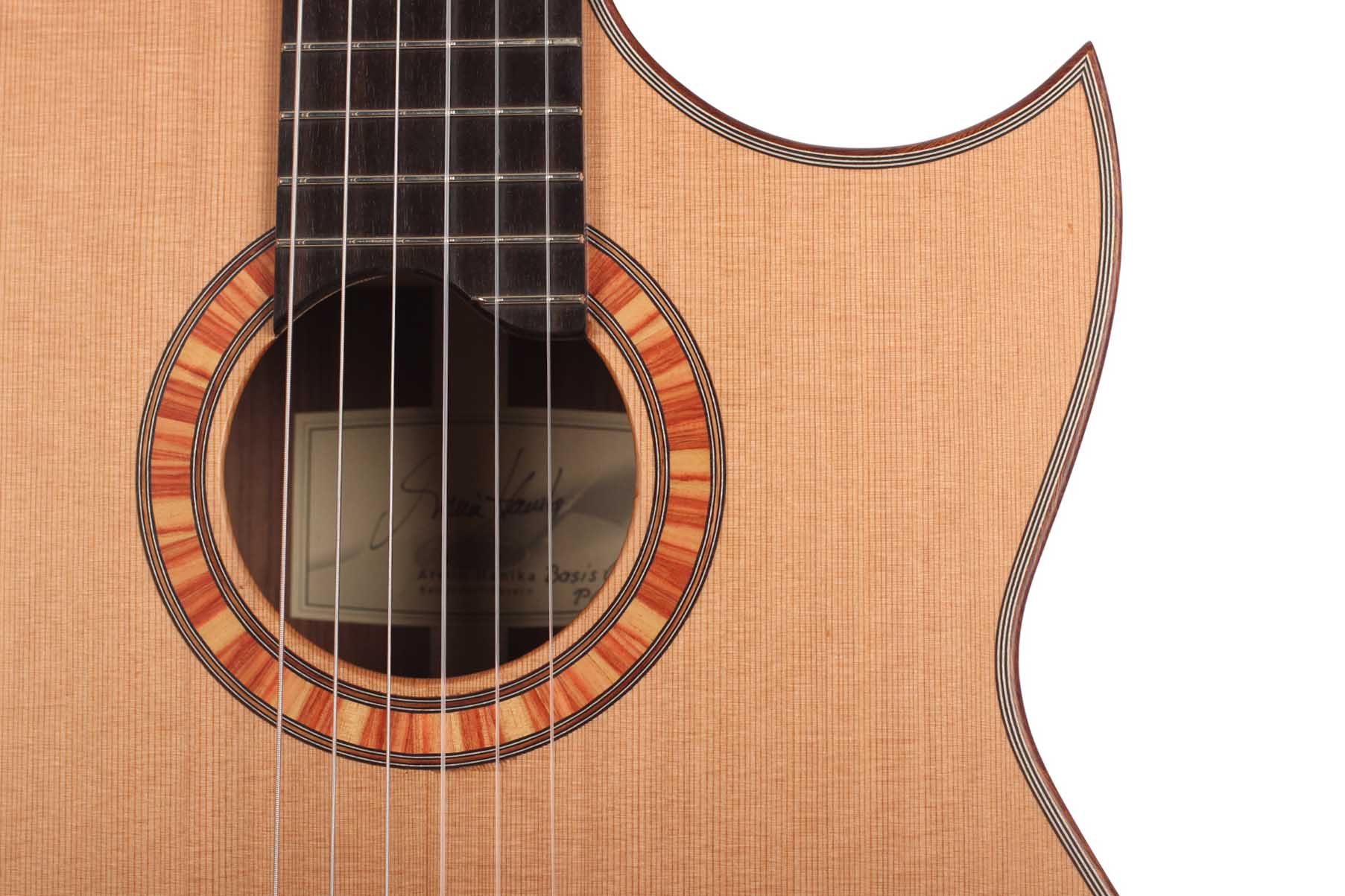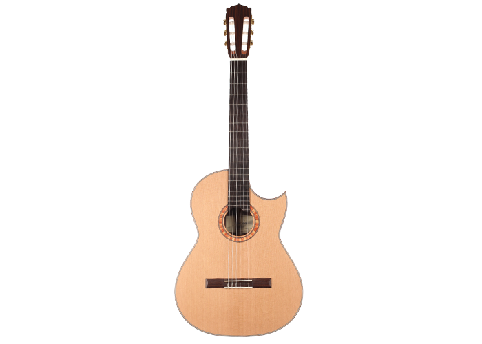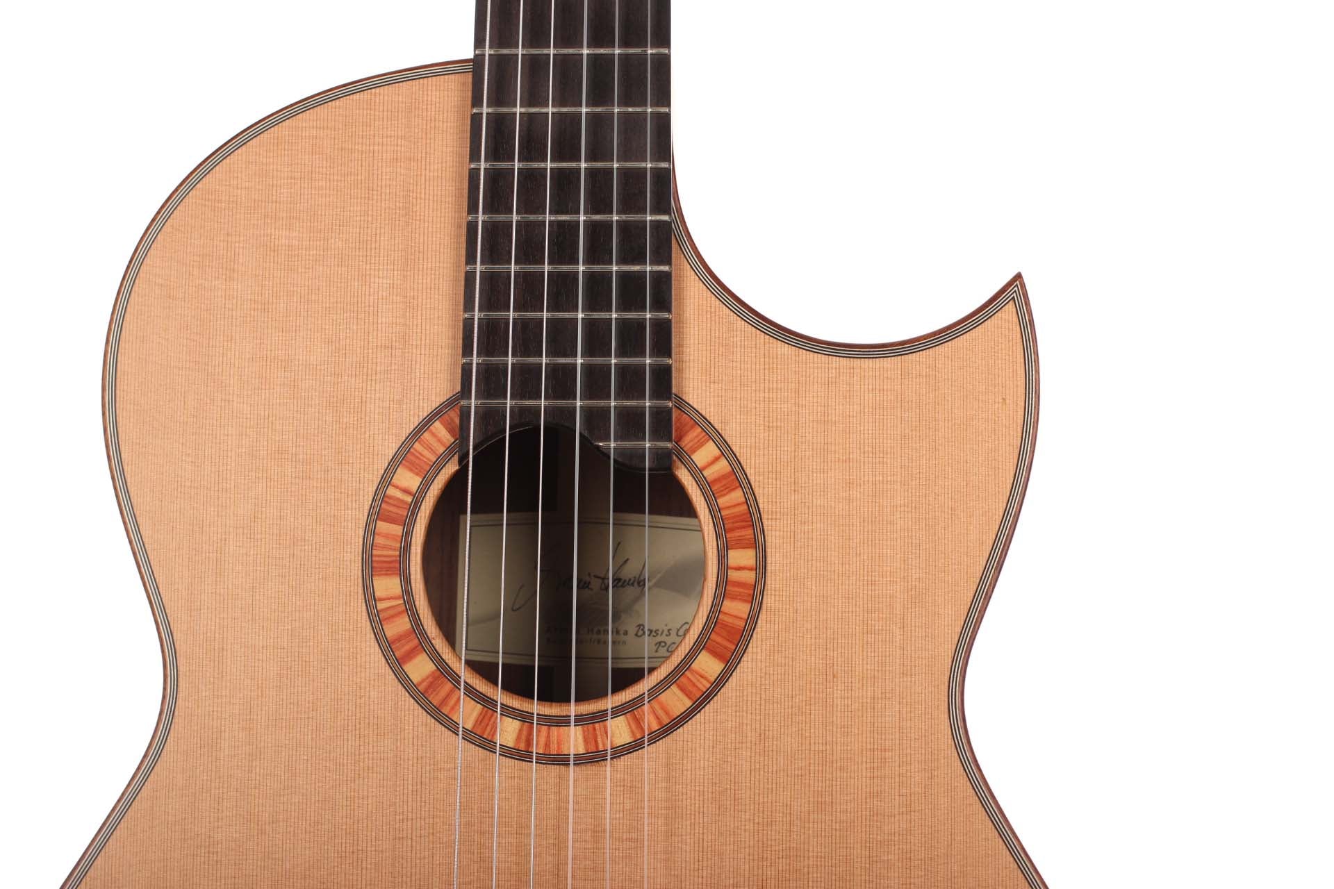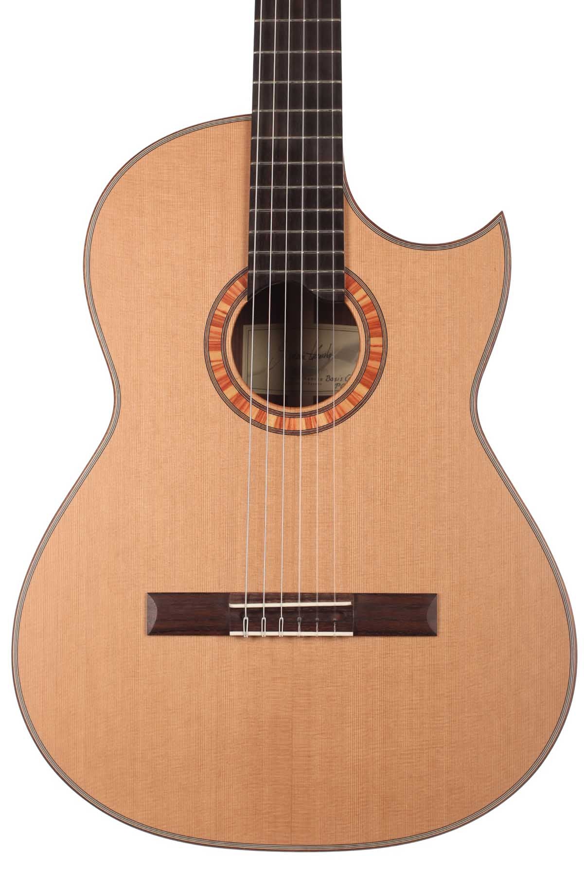 A cutaway classical guitar developed on the basis of the Model 50s for easy fingering and improved playability in high ranges. The Florentine cutaway makes playing in the high ranges comfortable. The rib height has been slightly reduced. Back and ribs made from high-quality east Indian rosewood, the soundboard from cedar wood. The BasisCut PC convinces with its good attack. This means it responds well to almost any type of playing.