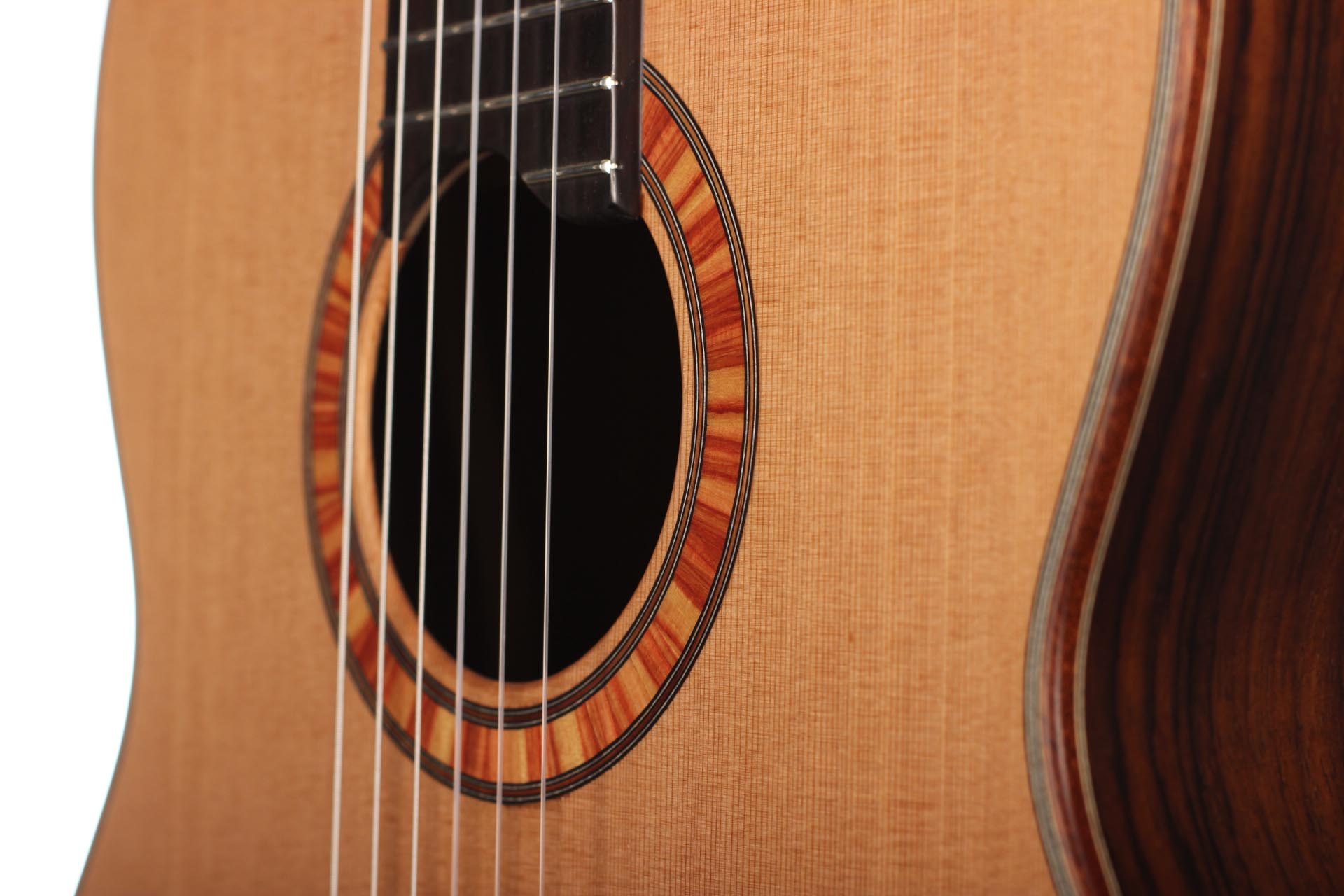 Made from solid tonewoods, this guitar comes with high-quality Teflon-mounted ‘Rubner Gold Tuning Machines’ and bushed holes. Quality features include the cedro neck that has been laminated throughout with ebony, the ebony fretboard, and a bridge saddle made from hard bone material. The open-pore finish with PUR matt varnish produces a surface that is relatively insensitive to dirt and signs of wear and helps the instrument develop a particularly open and free sound.