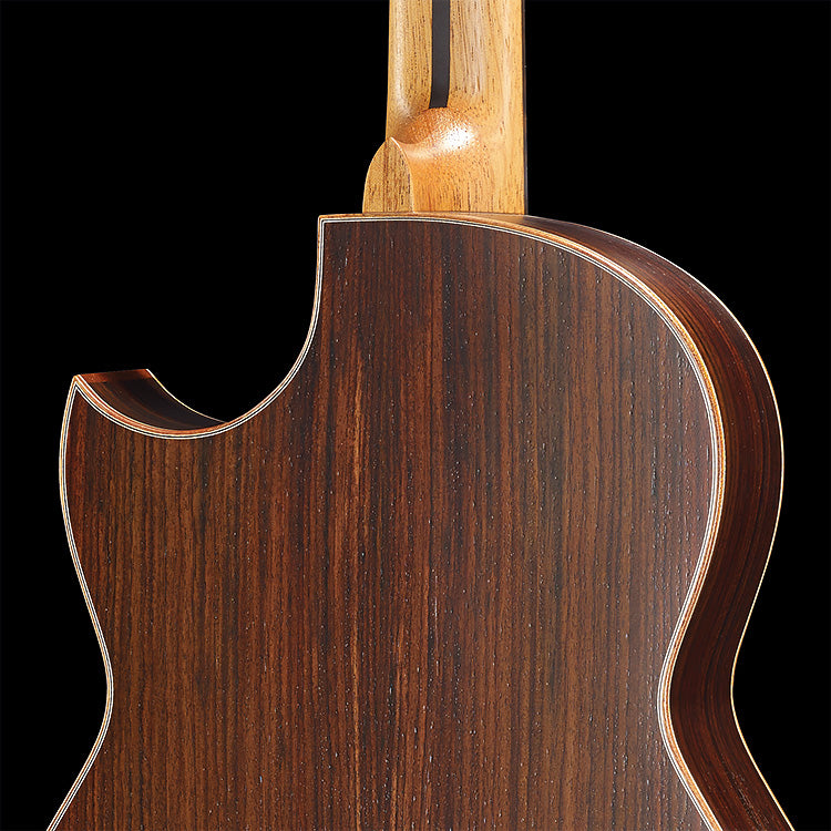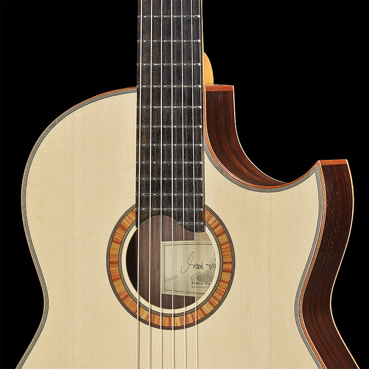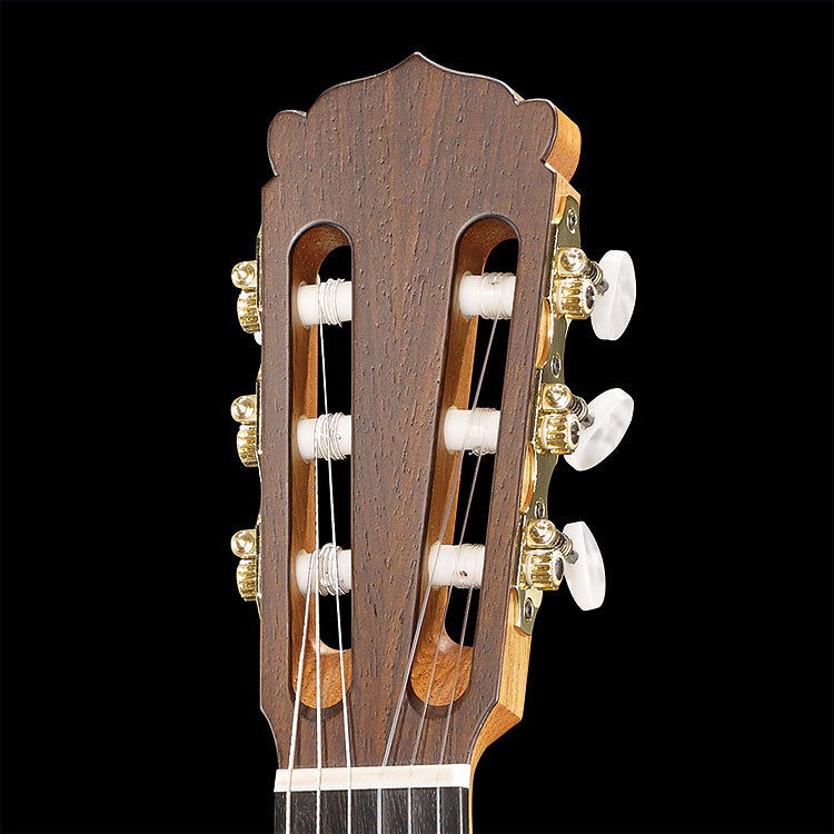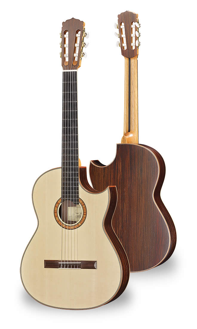 A cutaway classical guitar developed on the basis of our Model 50s for easy fingering and improved playability in high ranges. The Florentine cutaway makes playing in the high ranges comfortable. The rib height has been slightly reduced. Back and ribs made from high-quality east Indian rosewood, the soundboard from spruce wood.