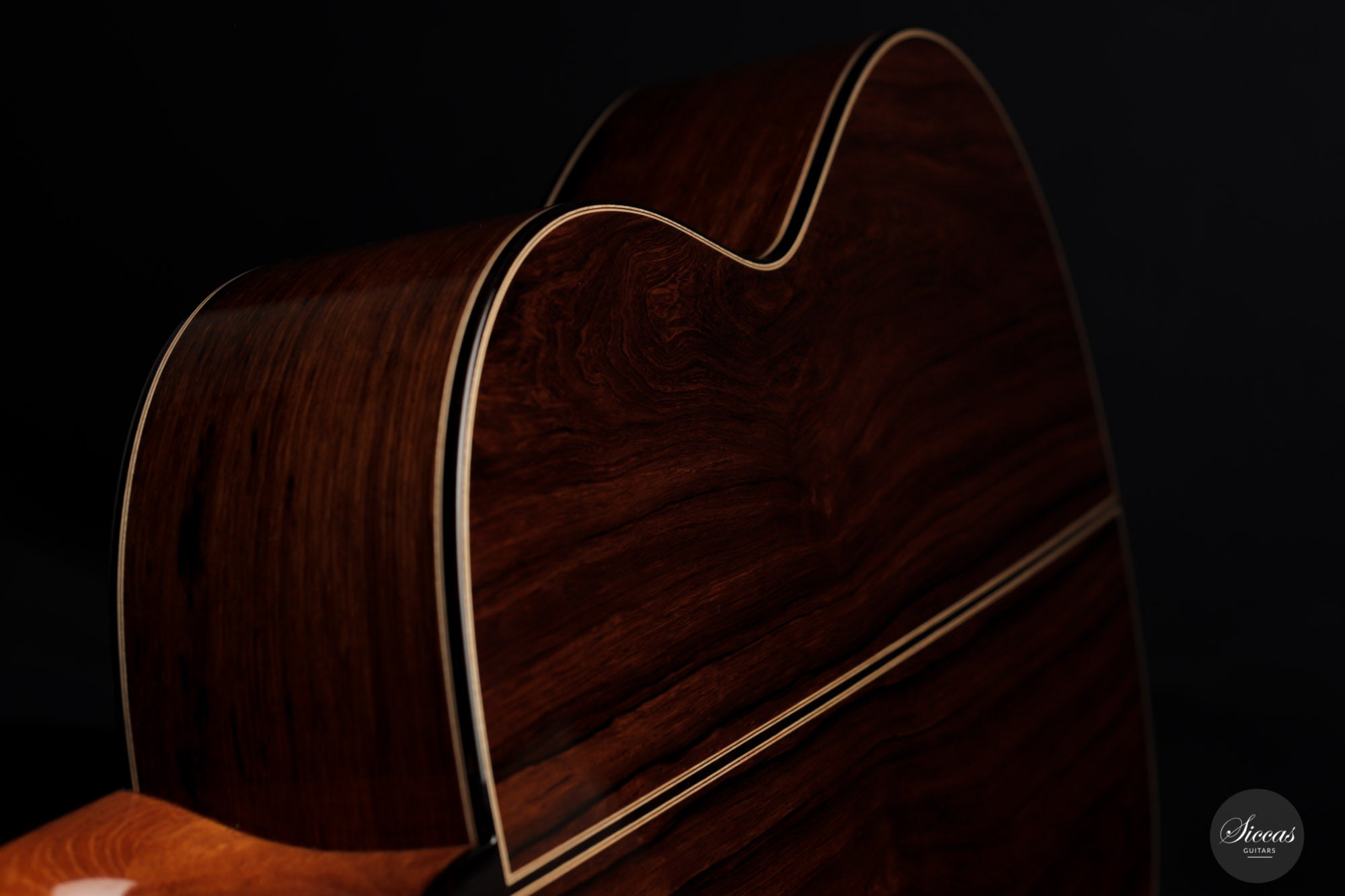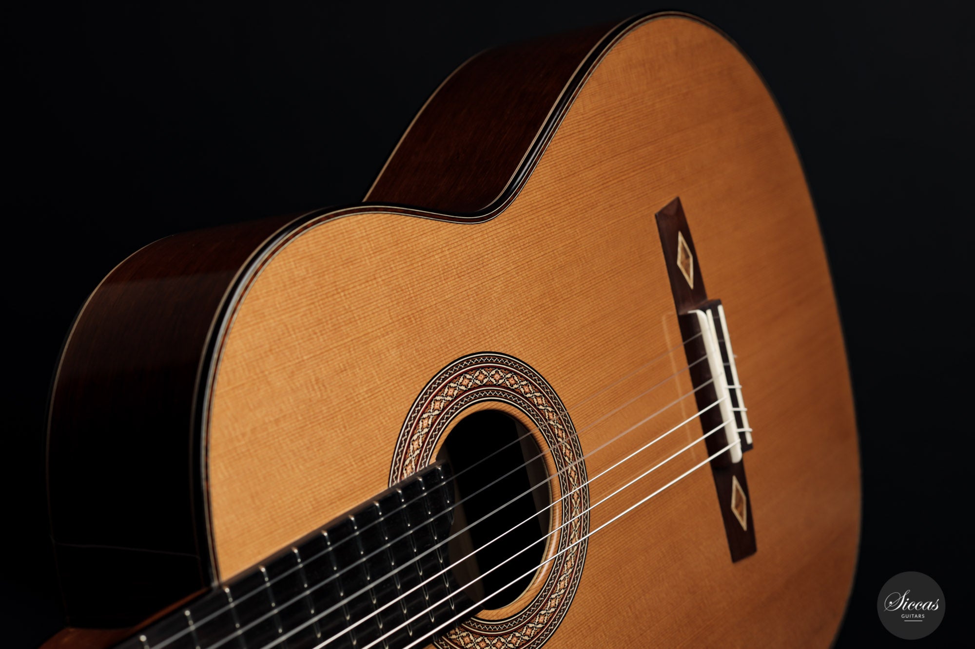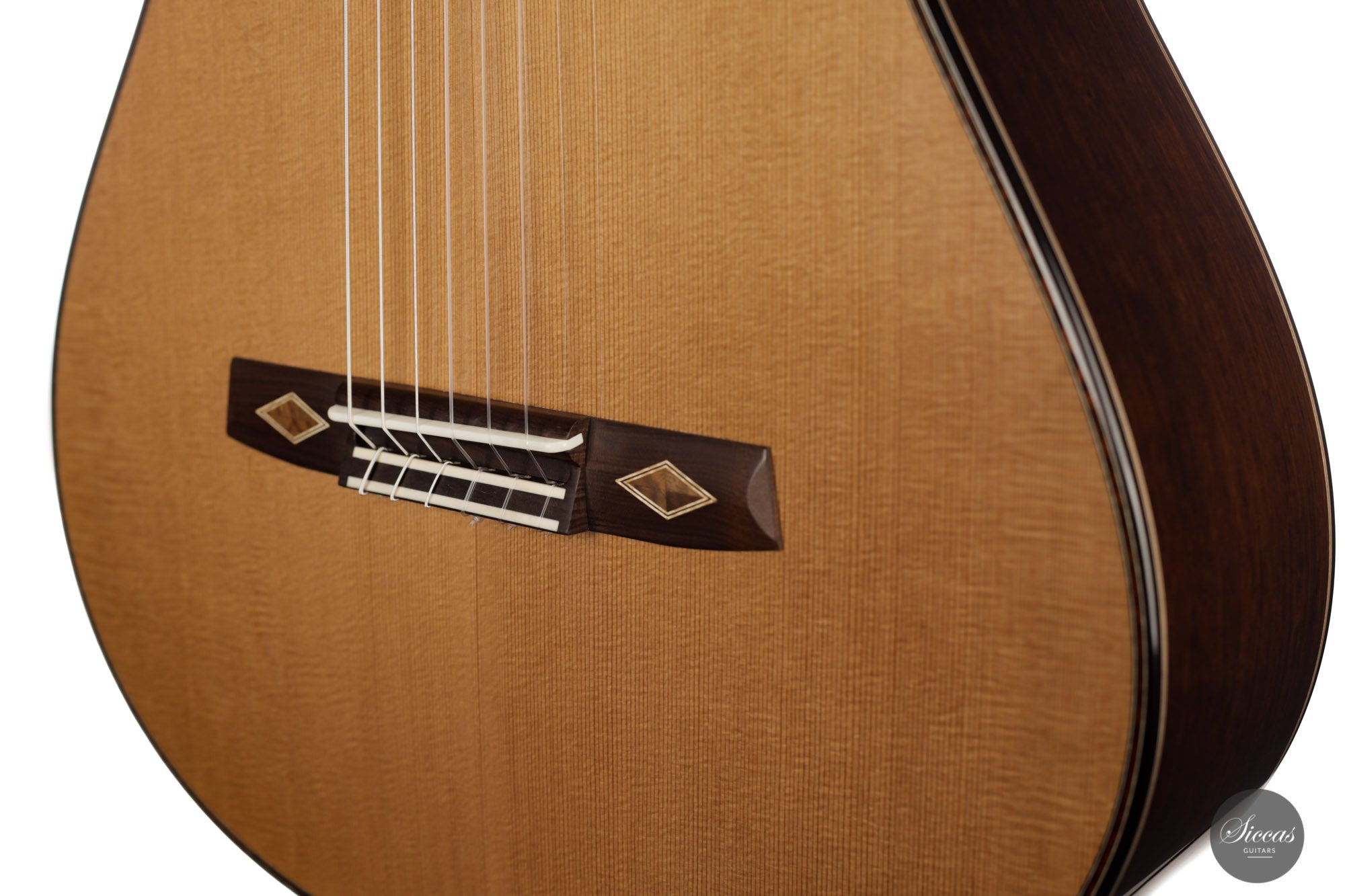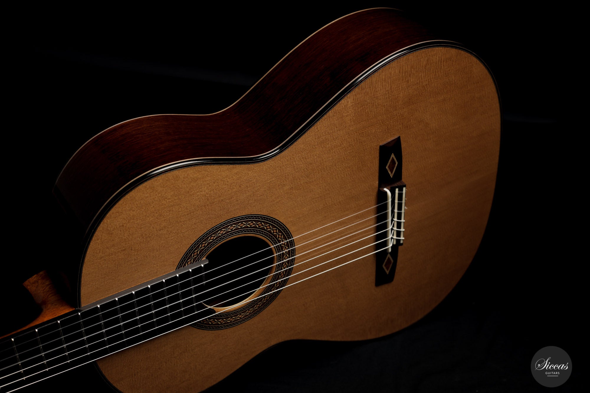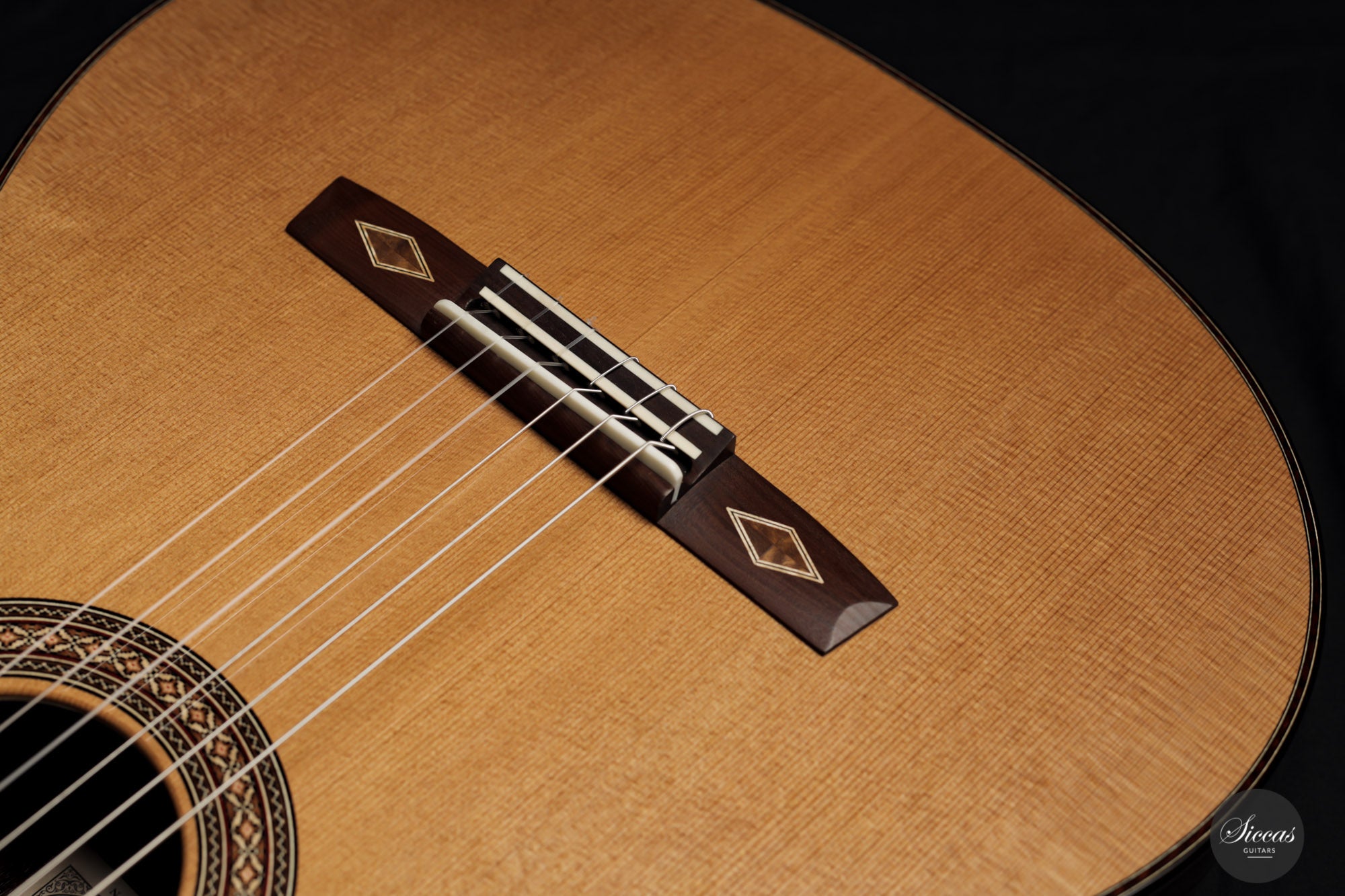 The HE Double-Top offers superior dynamics, a balanced spectrum of timbres, and a crisp and sustained tone. This Special Edition has a unique look and construction. The bridge is made of super-light checkerboard wood, which gives the soundboard an even better responsiveness. It features elegant diamond or rhombus shaped inlays on both sides of the strings. This feature, reminiscent of Antonio de Torres' characteristic guitar bridges, makes this guitar stand out from the usual Armin Hanika collection. Another, albeit more subtle, construction detail is the flat top, in contrast to the typical arched top, which gives the guitar an exceptionally crisp and precise sound.