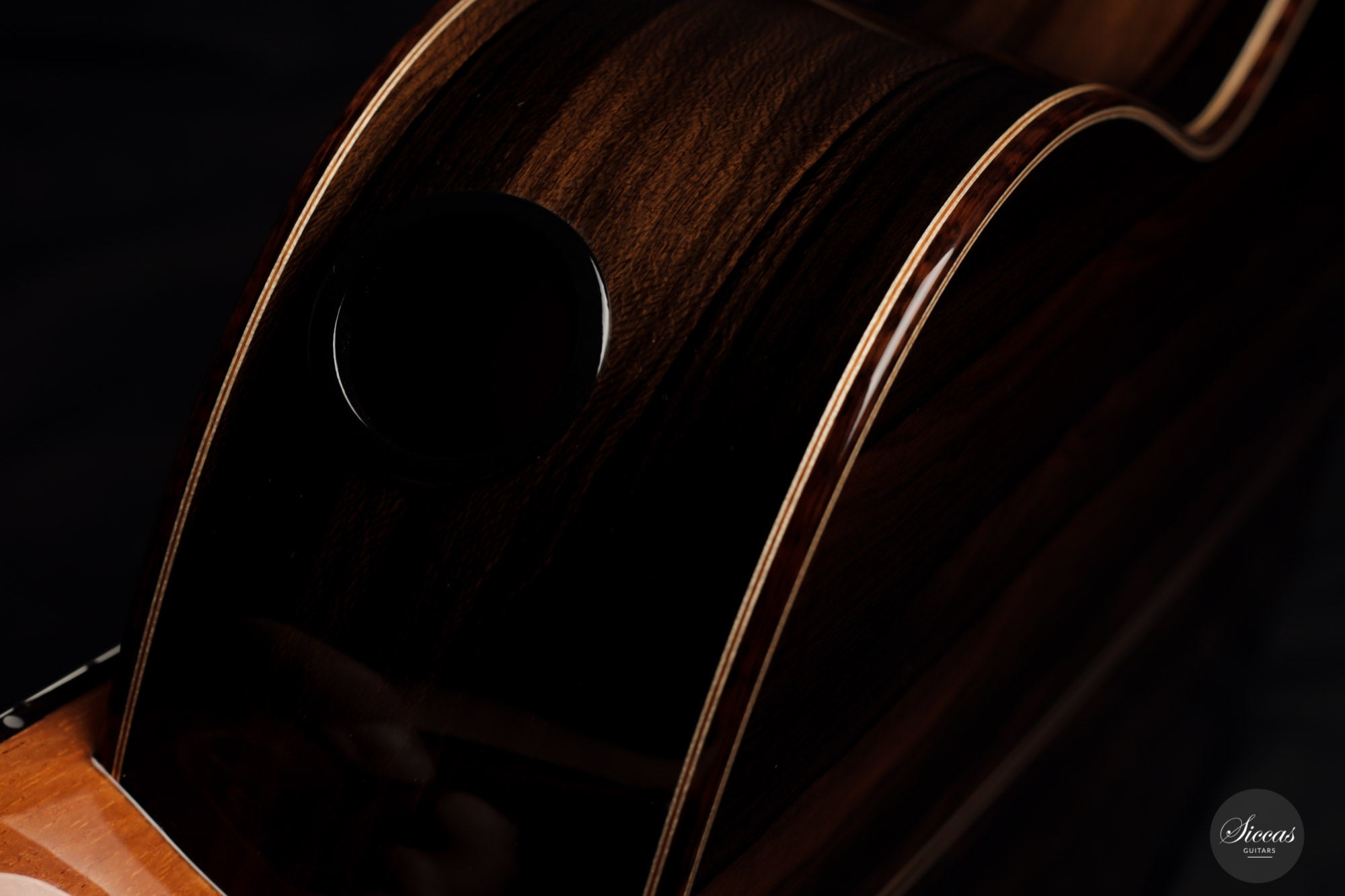 This Armin Hanika, HE Lattice custom, is a unique instrument. Pushing the boundaries of his HE Lattice model and going toward a highly modern design, Armin Hanika gave this "Special Production" guitar a ton of exciting features. To name a few, one will note the elevated fingerboard, double back, 1a head design, first-class Scheller tuners, thermo-treated spruce soundboard with lattice bracing, slight radius on the fingerboard, pins for a strap, and an extra soundport on the side. The most refined set of Ziricote was also chosen for this excellent guitar, bringing this instrument one step more towards the 1A model's quality. Soundwise, it is an absolute beast and offers outstanding responsiveness. A clean, focussed tone with plenty of sympathetical resonances make it an ideal concert guitar.