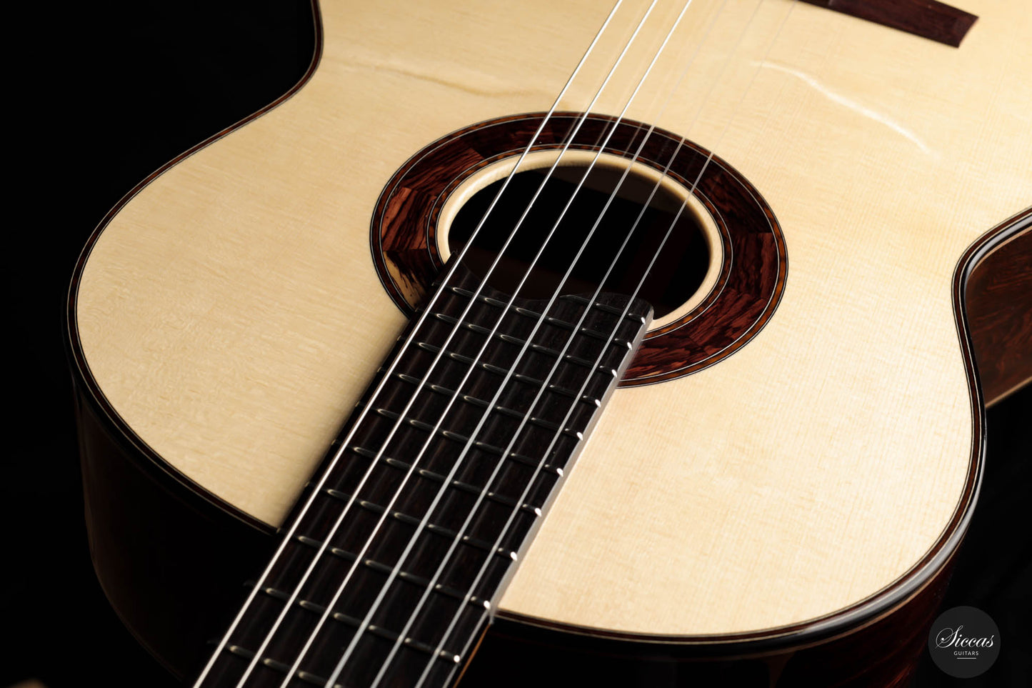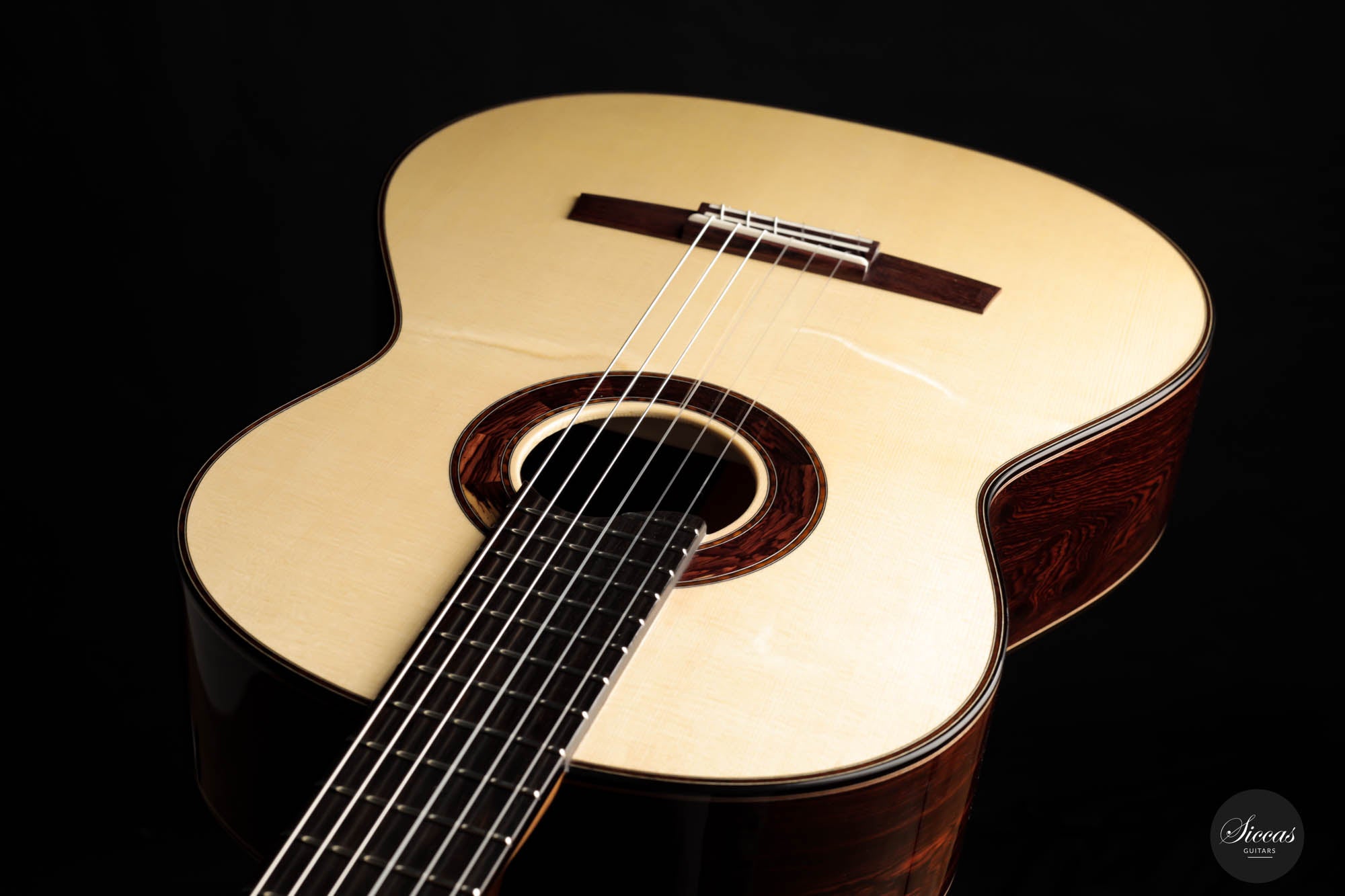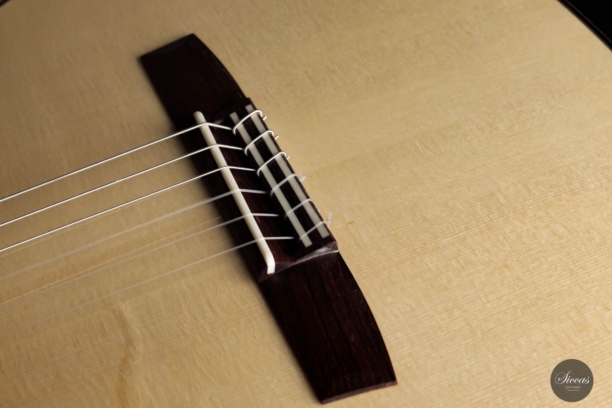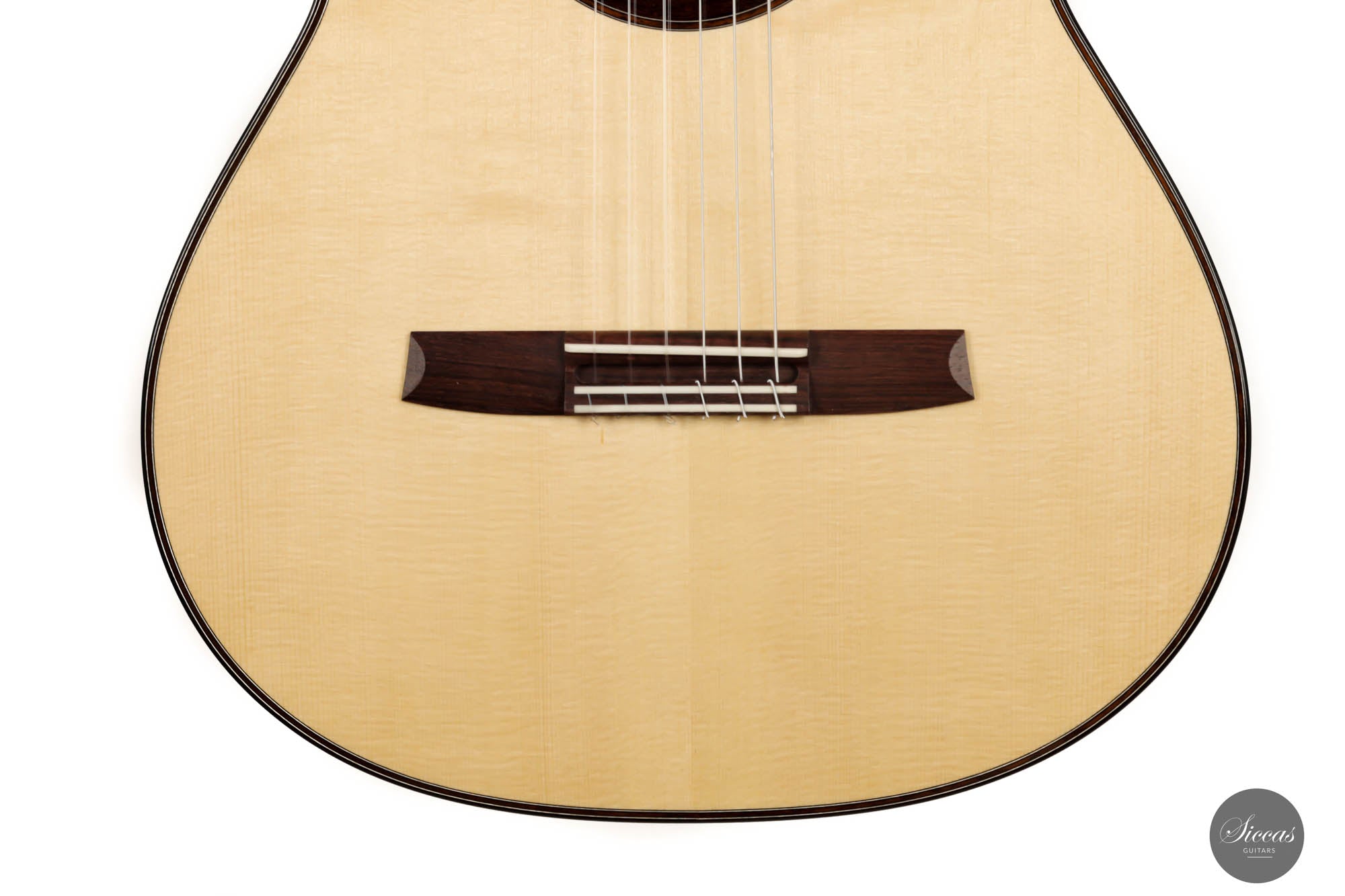 This brand new instrument has a visual blemish caused by a string snapping during construction. It was carefully refinished in Armin Hanika's workshop, so that now only a small mark can be seen under the varnish behind the bridge. Therefore, this guitar is available with a discount of 100€.