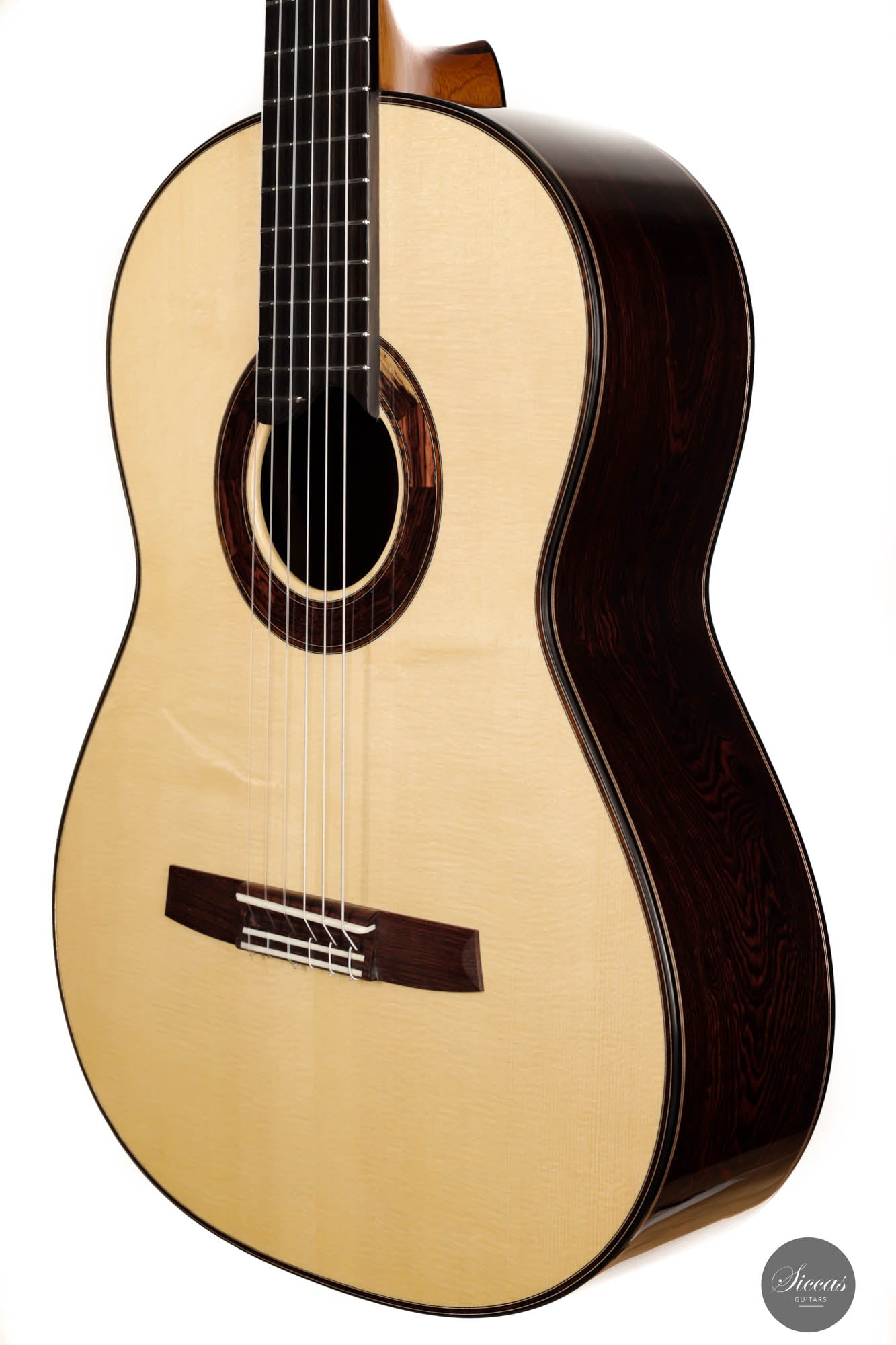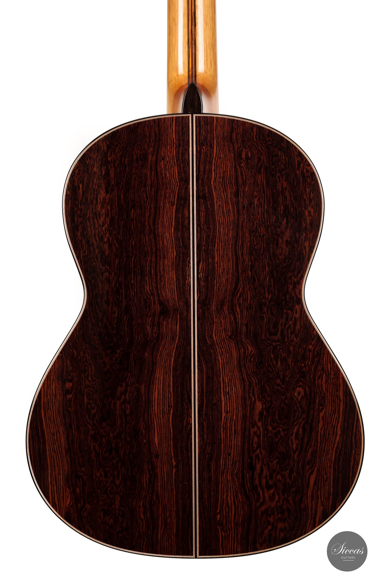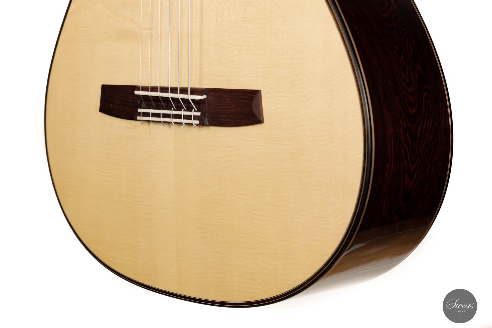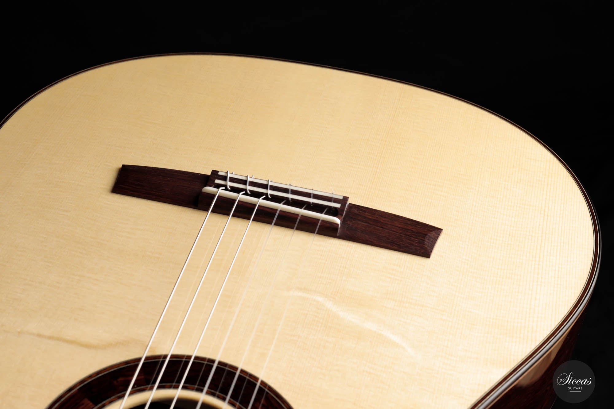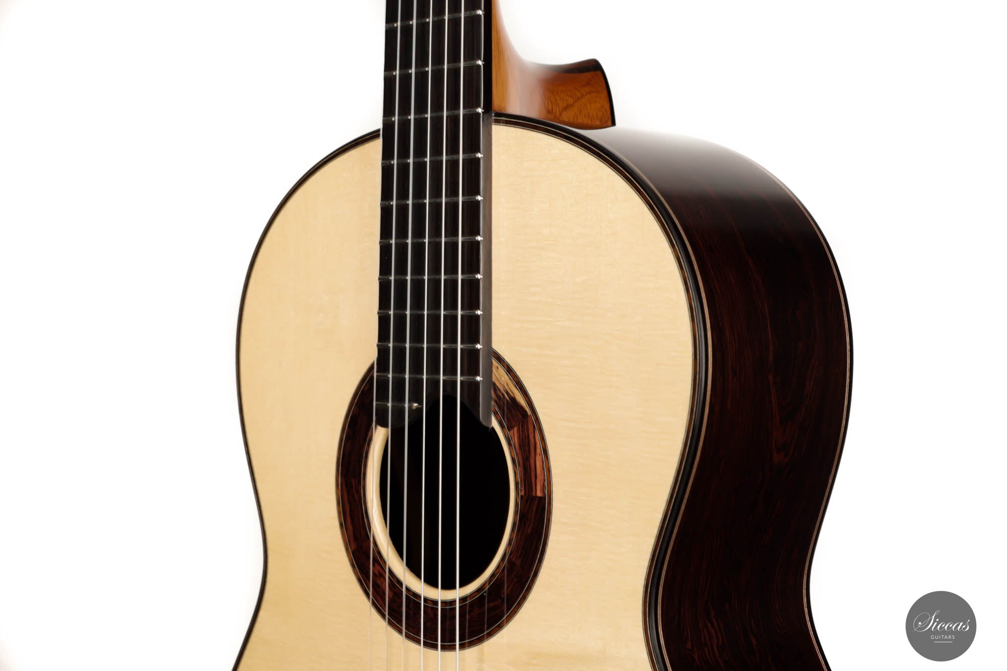 This brand new instrument has a visual blemish caused by a string snapping during construction. It was carefully refinished in Armin Hanika's workshop, so that now only a small mark can be seen under the varnish behind the bridge. Therefore, this guitar is available with a discount of 100€.