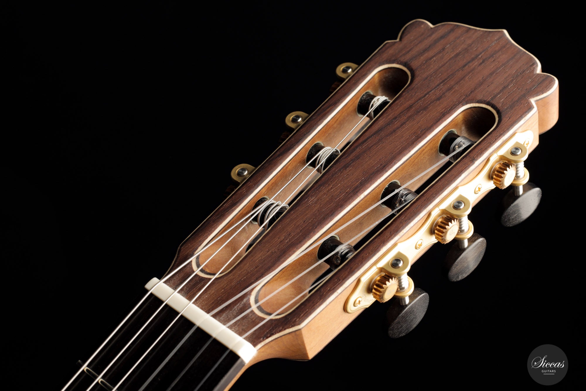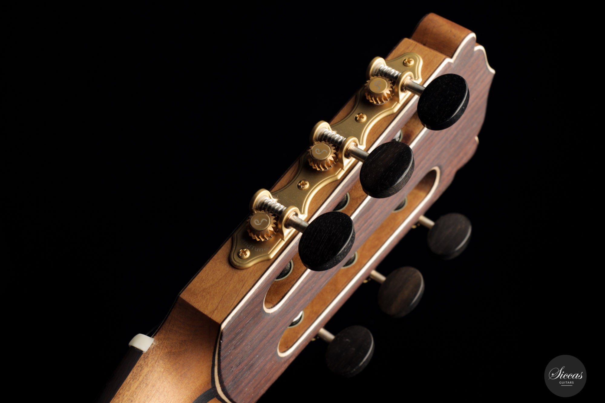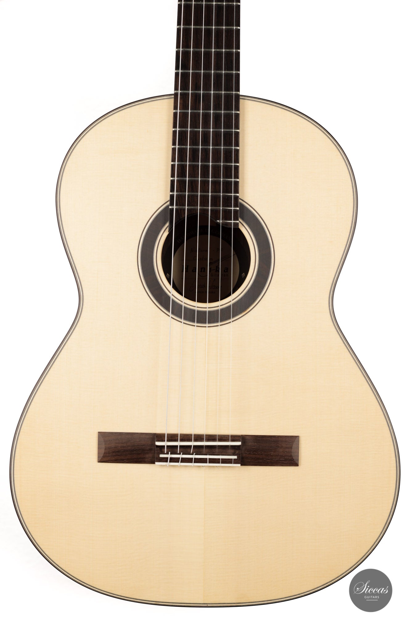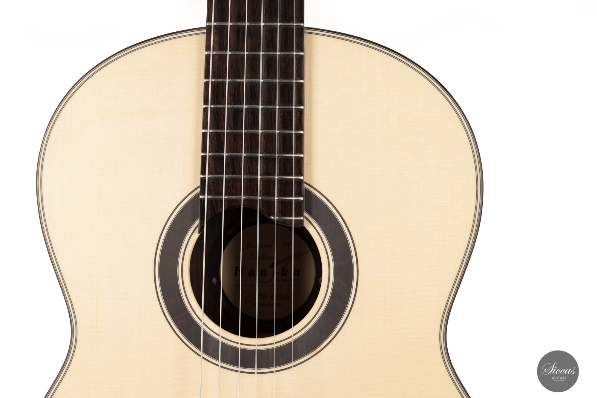 This Hanika is made of fine massive tone woods and features a thin top with an asymmetrical 5-fan-bracing. The golden mechanics with ebony knobs, the hardwood reinforced thermo birch neck, the fretboard made of African blackwood and the 3-layer rosewood-maple-rosewood headstock underline the high quality of the Natural PF. Comes with a Hanika Hiscox Pro II case.