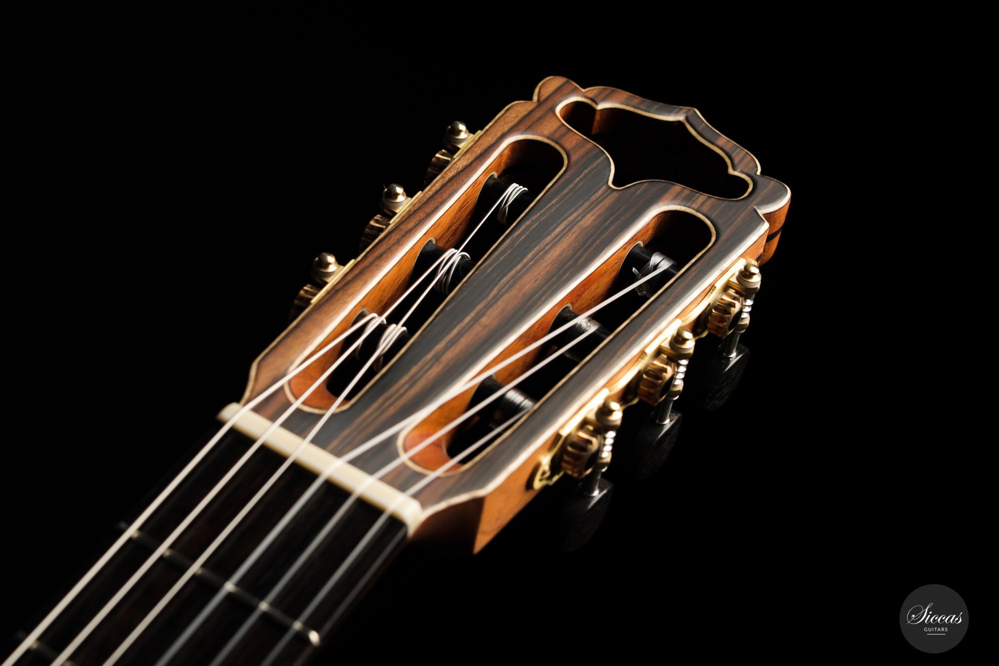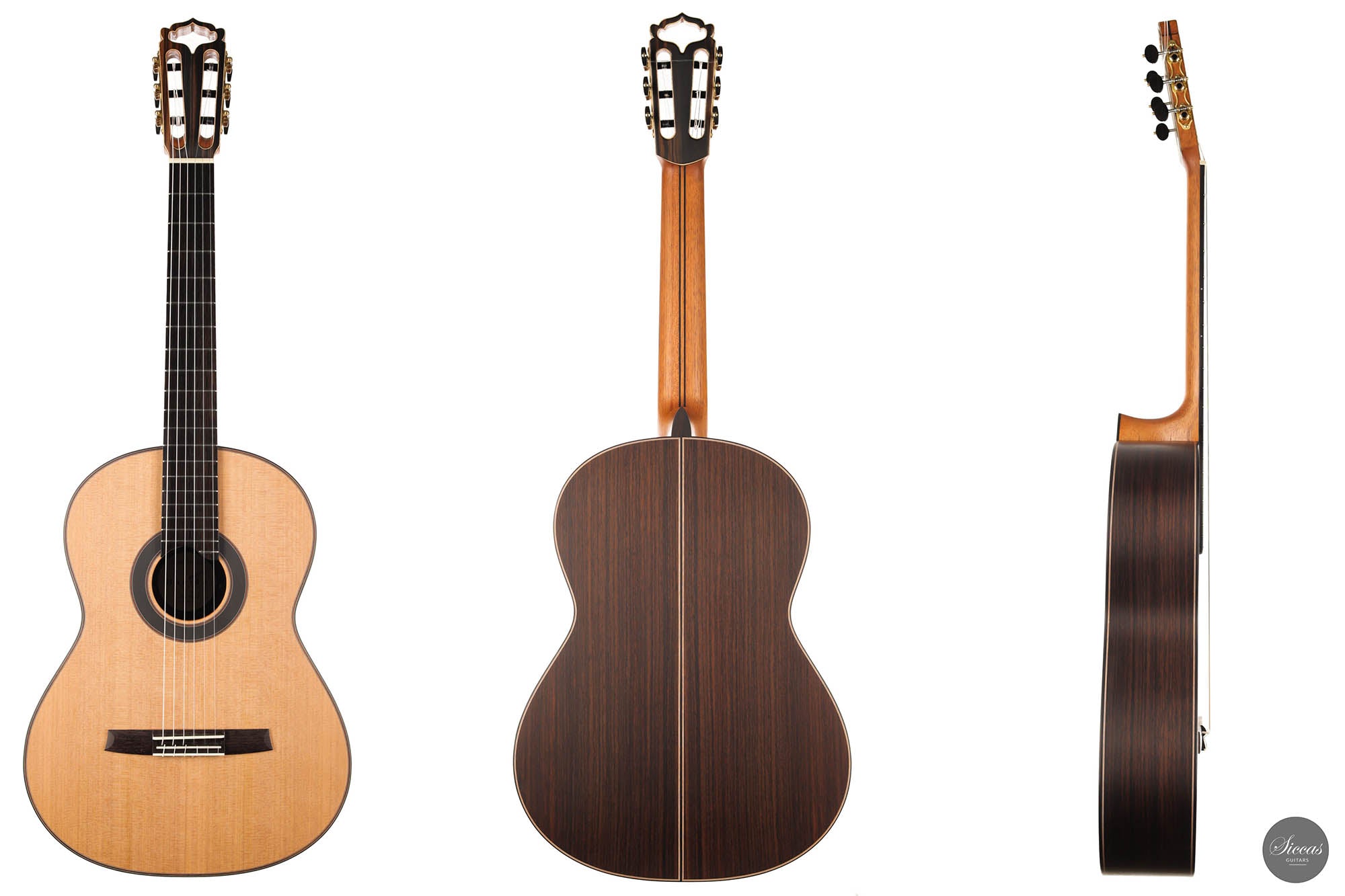 The Hanika Natural Torres Cedar combines East Indian rosewood back and sides with a fine cedar top, creating a concert guitar of warmth, clarity and balance. Its thin soundboard provides strong attack and full resonance with precise note separation, while response and sustain are finely proportioned, making it versatile for a wide range of players. The thin “Natural” varnish and wax surface protects the instrument yet allows an open, transparent tone. Refined details such as Alessi tuners with ebony knobs, a reinforced cedro neck, African blackwood fingerboard and layered rosewood-maple headstock emphasize its craftsmanship. Supplied with a Hiscox Pro II case, it is a reliable and elegant concert instrument.