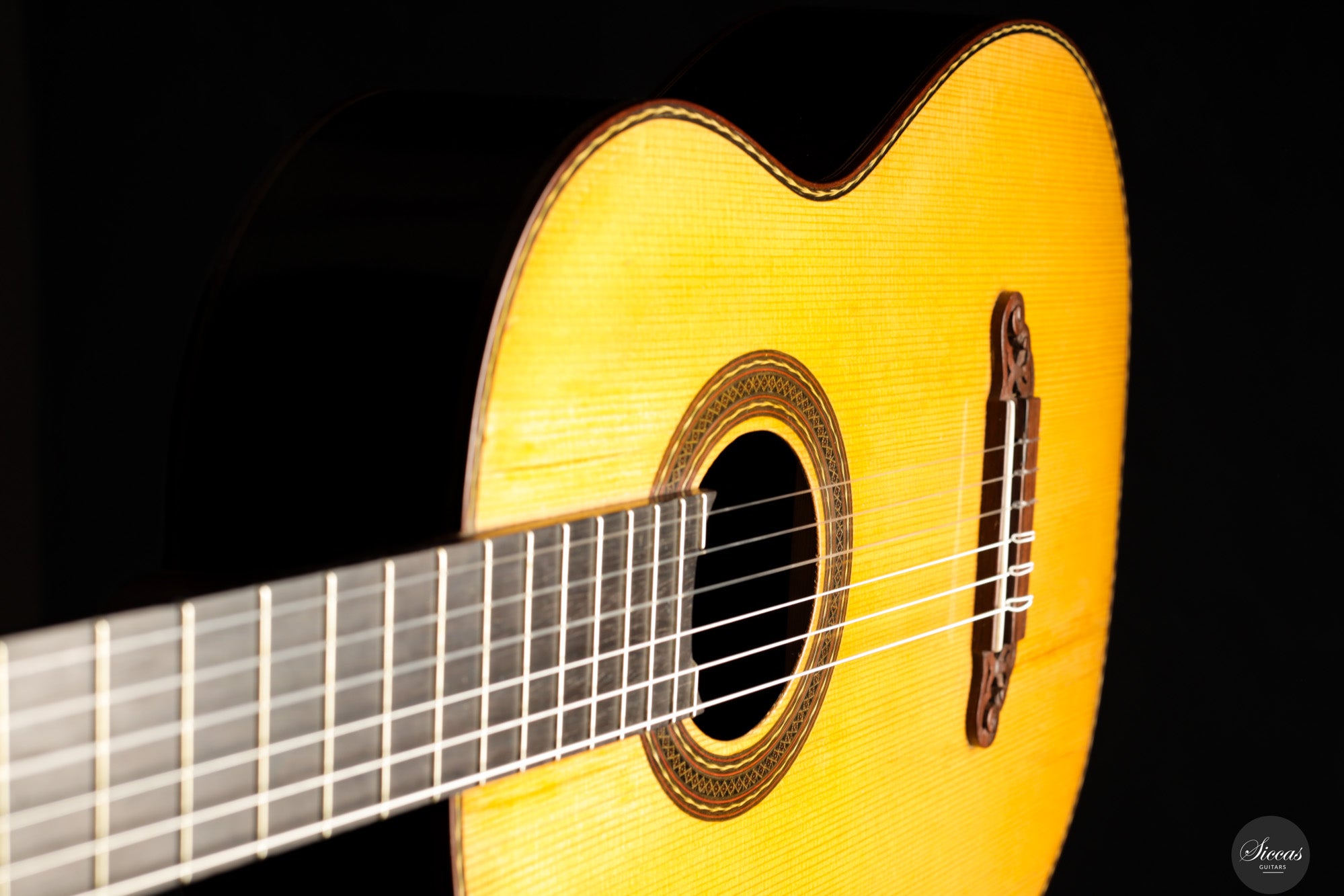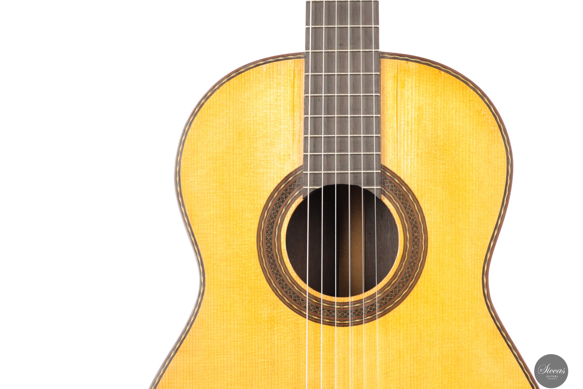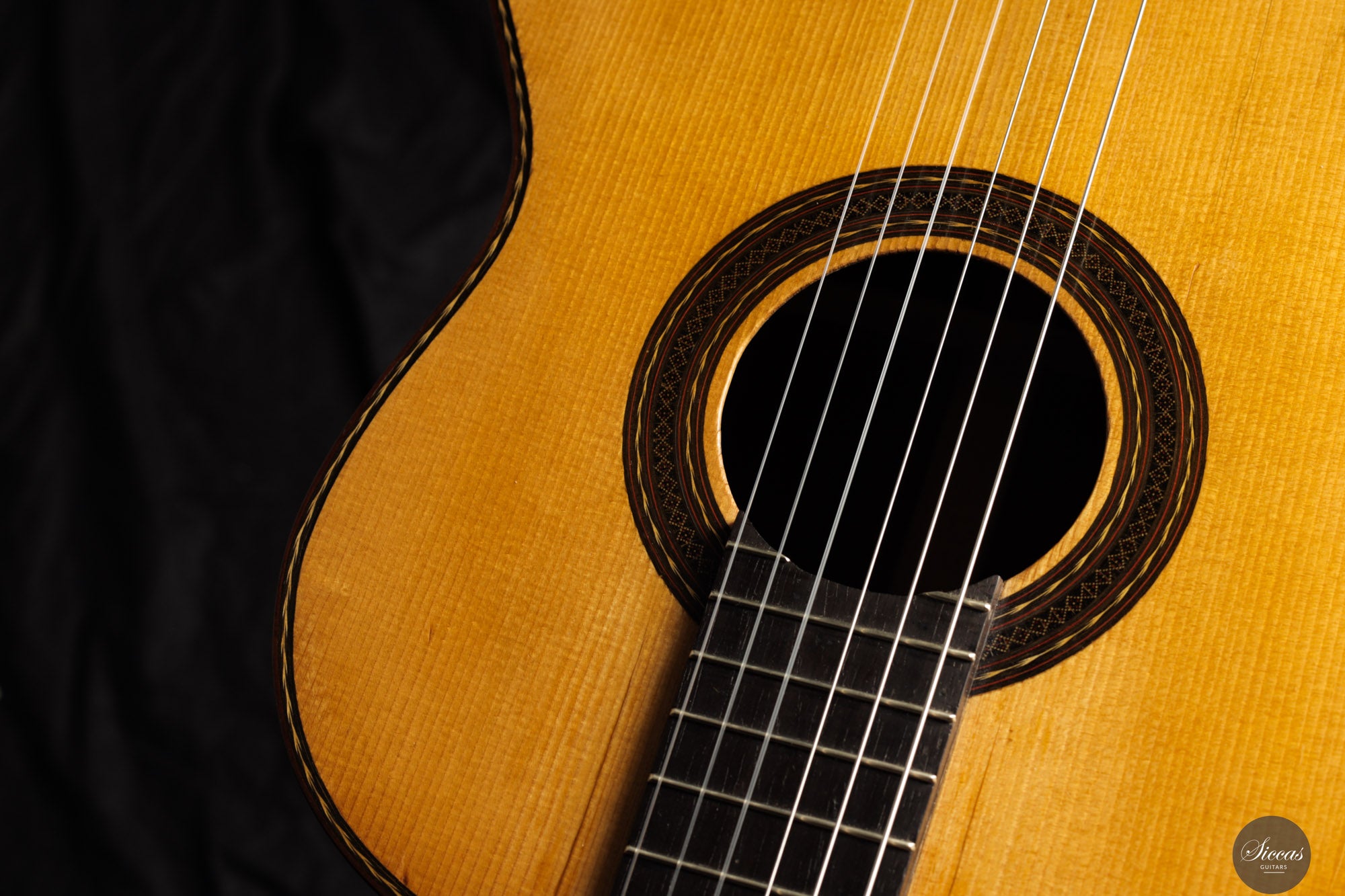The voice of this guitar is distinctive and memorable. The separation of the voices is remarkable, so inner lines and bass melodies remain clearly shaped even in dense textures. The overall character is graceful and poised, yet the guitar has such an individual colour that its sound can be recognised among many instruments. The response is immediate and the guitar rewards a light touch with clear, singing notes. Its dynamic range is broad. Quiet playing keeps warmth and definition, while stronger projection opens the sound freely without harshness and without losing refinement in the trebles. The light build and the spruce top give the attack a quick bloom, and the Brazilian rosewood deepens the colour and resonance of the lower register. The air body resonance lies between G sharp and A and can be felt as a subtle support to the main voice of the instrument rather than a dominant emphasis in the bass. The overall impression is of a poetic and articulate guitar that invites nuanced and expressive playing.