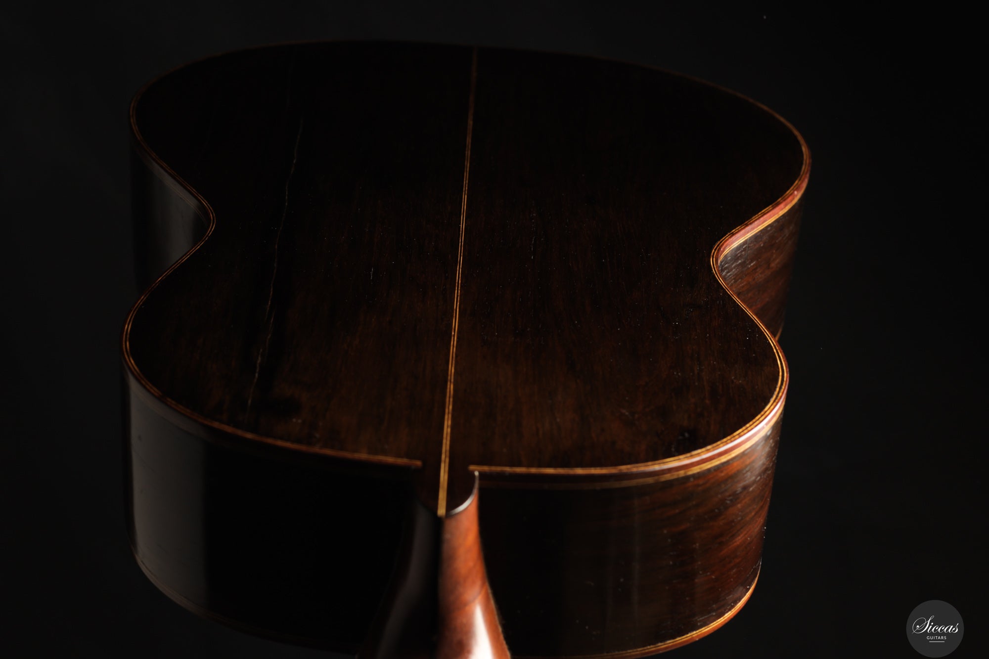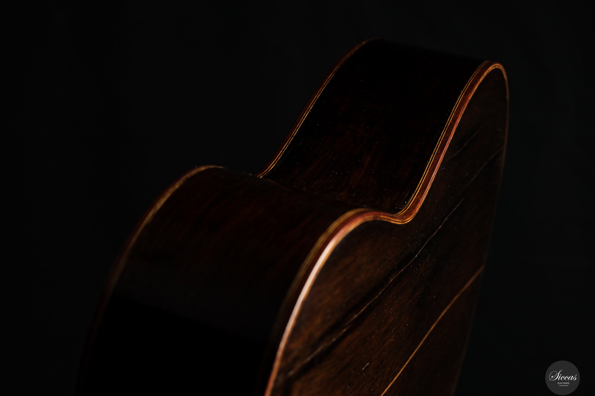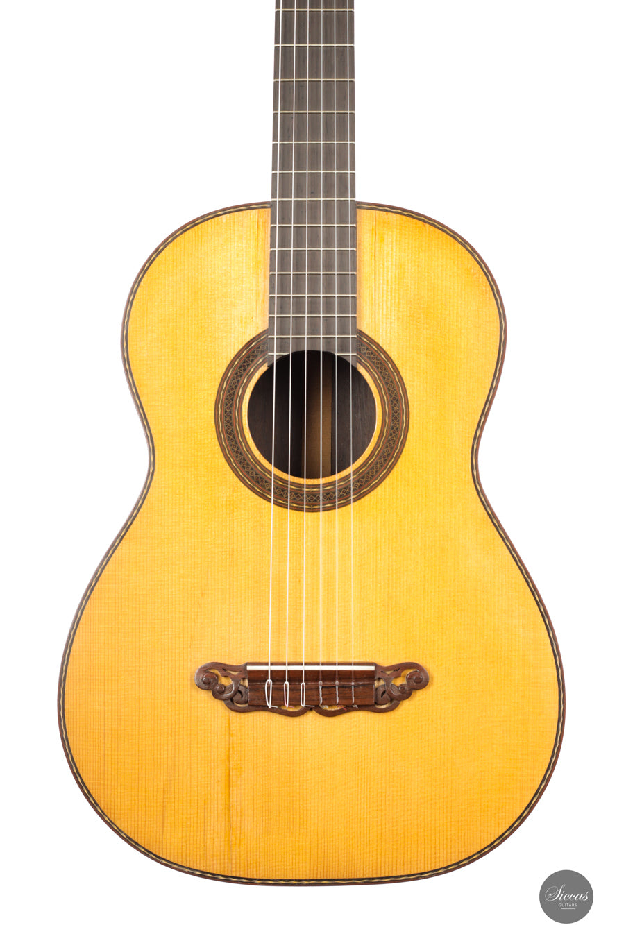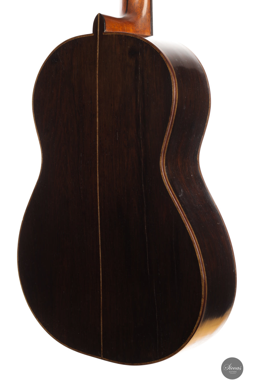 The voice of this guitar is distinctive and memorable. The separation of the voices is remarkable, so inner lines and bass melodies remain clearly shaped even in dense textures. The overall character is graceful and poised, yet the guitar has such an individual colour that its sound can be recognised among many instruments. The response is immediate and the guitar rewards a light touch with clear, singing notes. Its dynamic range is broad. Quiet playing keeps warmth and definition, while stronger projection opens the sound freely without harshness and without losing refinement in the trebles. The light build and the spruce top give the attack a quick bloom, and the Brazilian rosewood deepens the colour and resonance of the lower register. The air body resonance lies between G sharp and A and can be felt as a subtle support to the main voice of the instrument rather than a dominant emphasis in the bass. The overall impression is of a poetic and articulate guitar that invites nuanced and expressive playing.