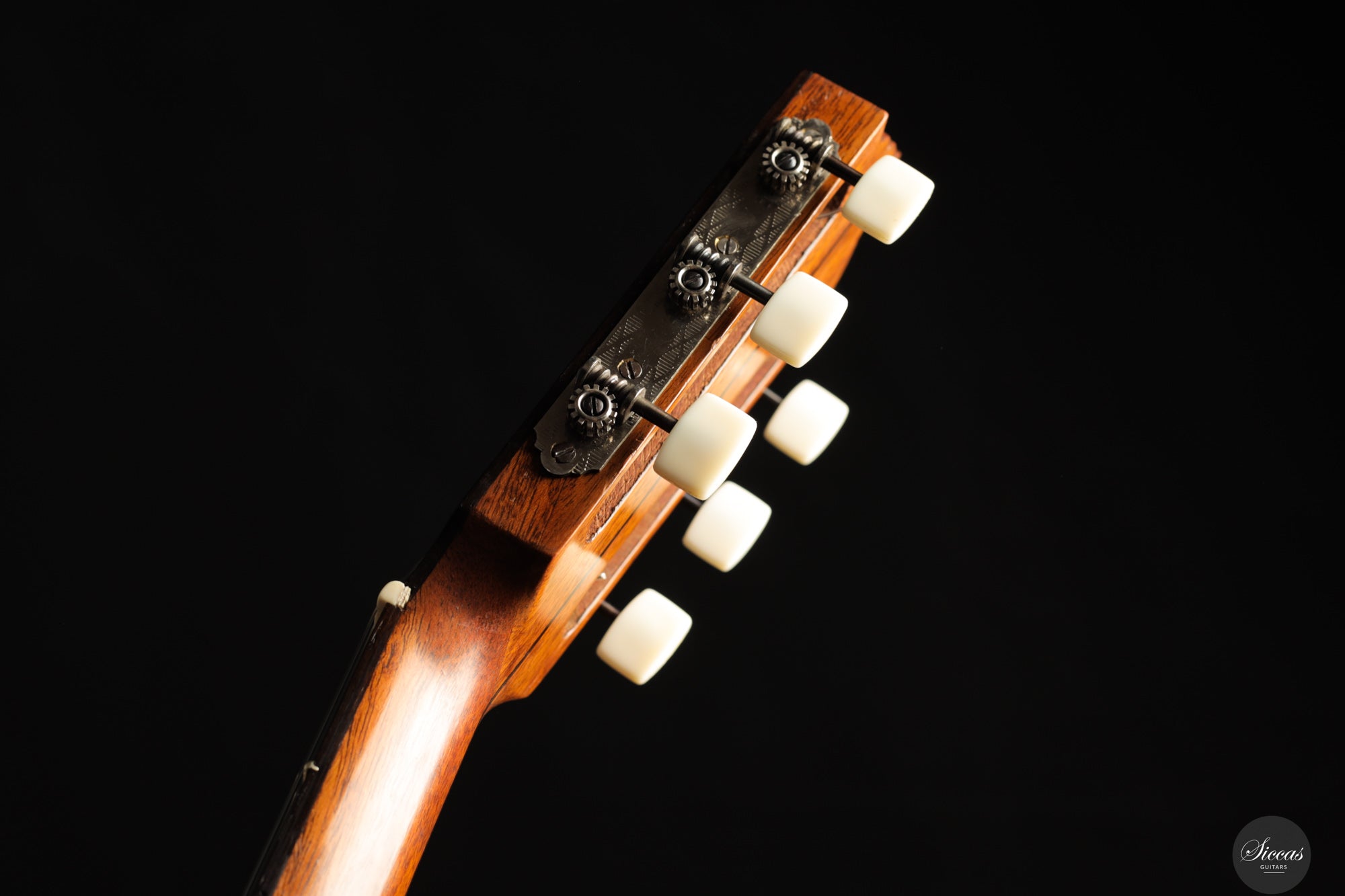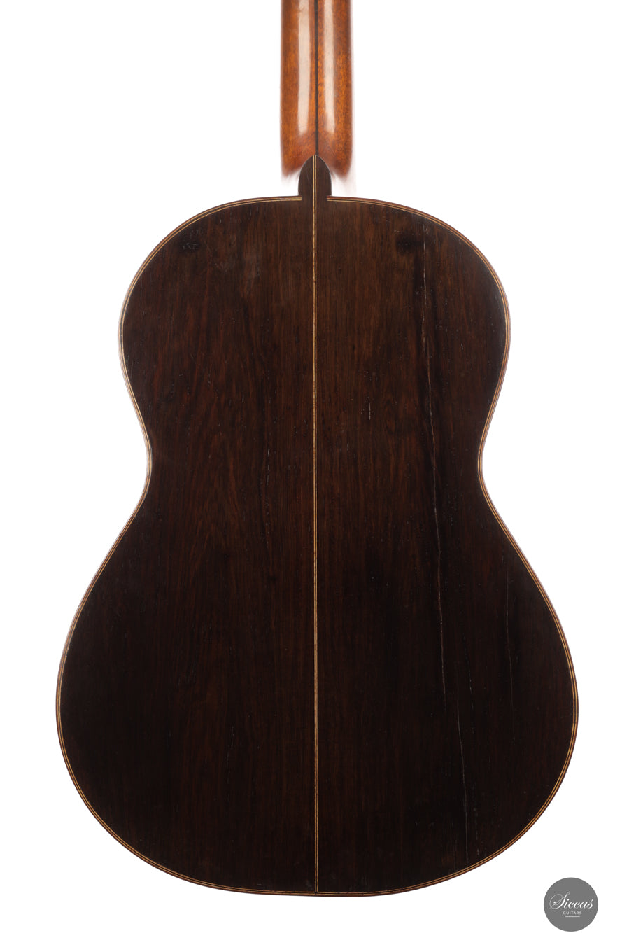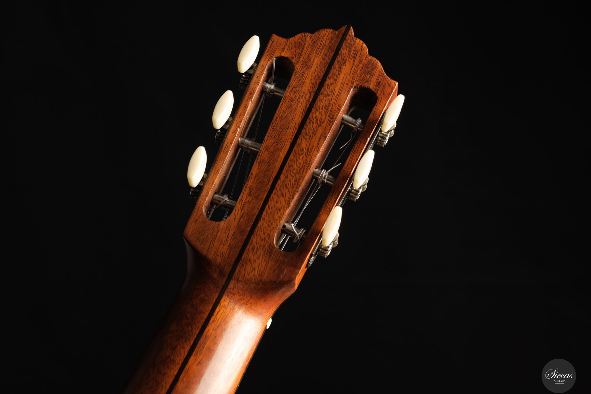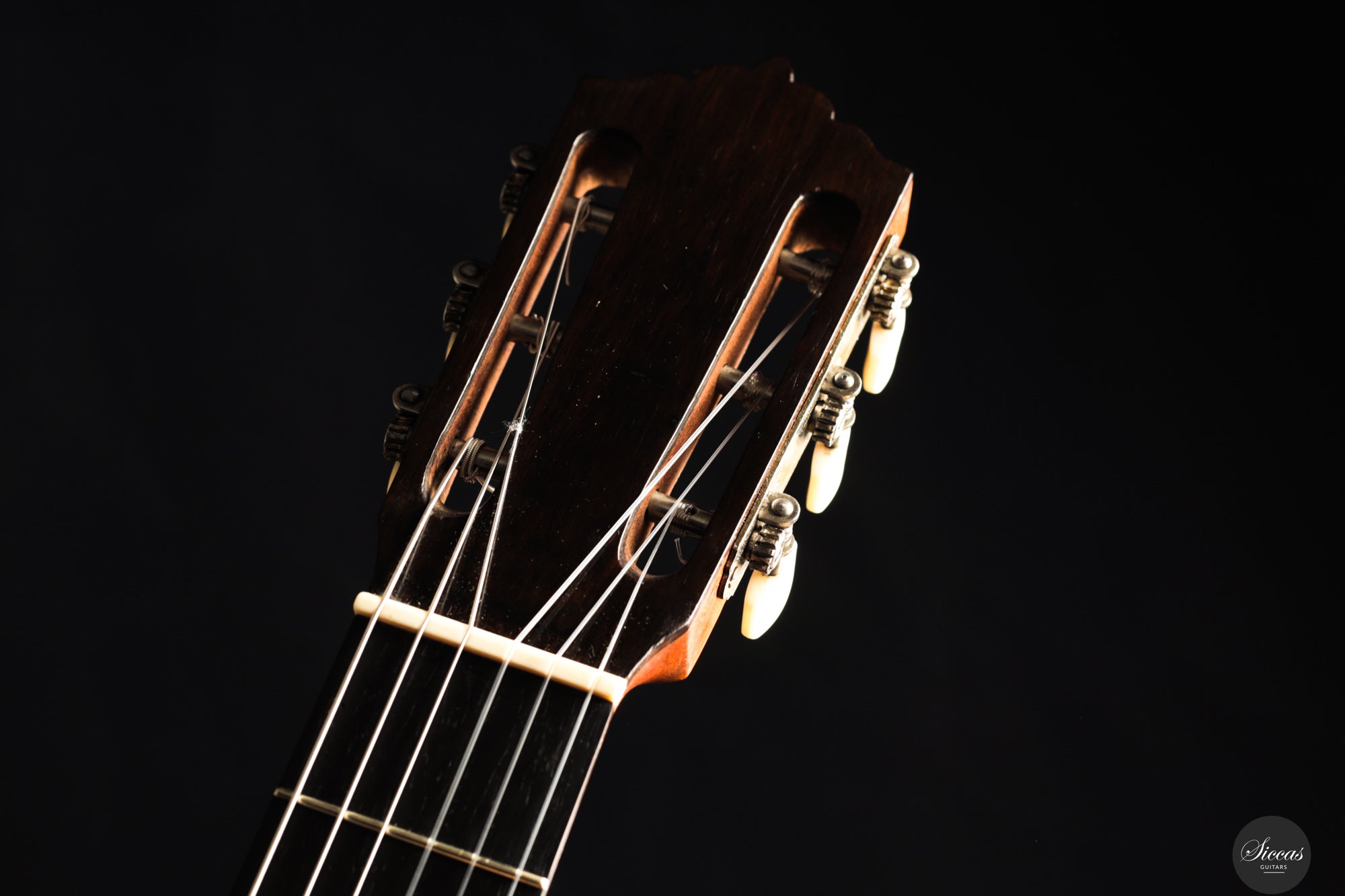 This 1952 instrument shows Nanclares working with assurance and a very clear sound ideal. The bridge has ornamented wings that bring José Ramirez I to mind, while the tie block is deliberately plain, which keeps the whole design quiet and focused. The rosette carries an intricate mosaic, and a very fine pluma line follows the purfling around the top. The headstock has an understated elegance, and the original tuning machines are still present and in very good working order. The instrument is signed on the underside of the top, and the build year 1952 is clearly stated.