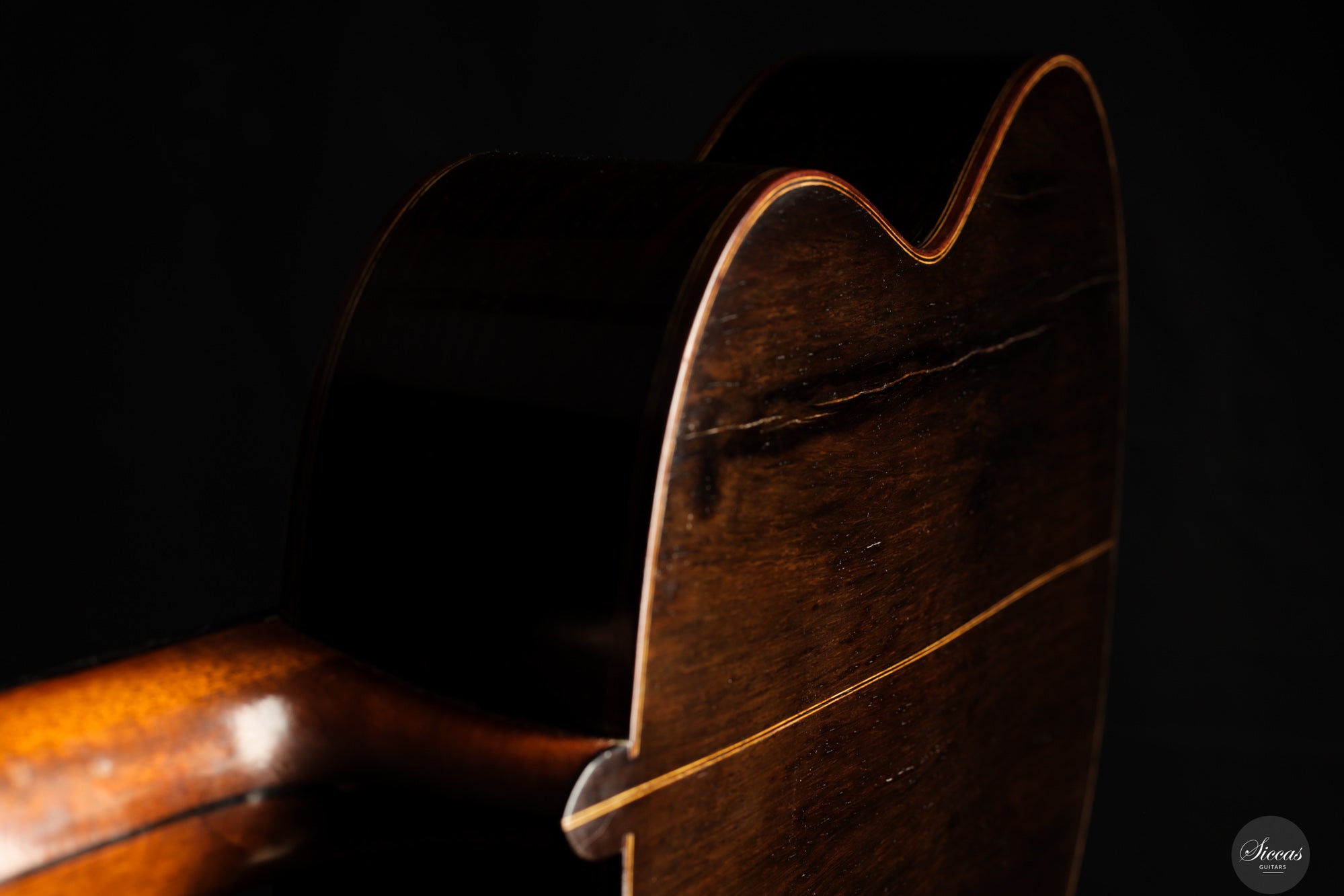 This instrument shows the traces of careful use, and after a long musical life has been carefully restored. The top presents several repaired cracks. There is one crack on each side of the fretboard, both reinforced with cleats. A longer crack runs along the left wing of the bridge, with the lower section supported by cleats. Other cracks in the top have been glued without need of additional reinforcement. The sides also show several repaired cracks. The back contains multiple repaired cracks that have been stabilised with cleats. All restoration work is stable and has been carried out in a professional manner. The French polish on the soundboard and body displays natural ageing and wear consistent with regular careful use. The original tuners remain in place, function well and are in very good condition for their age.