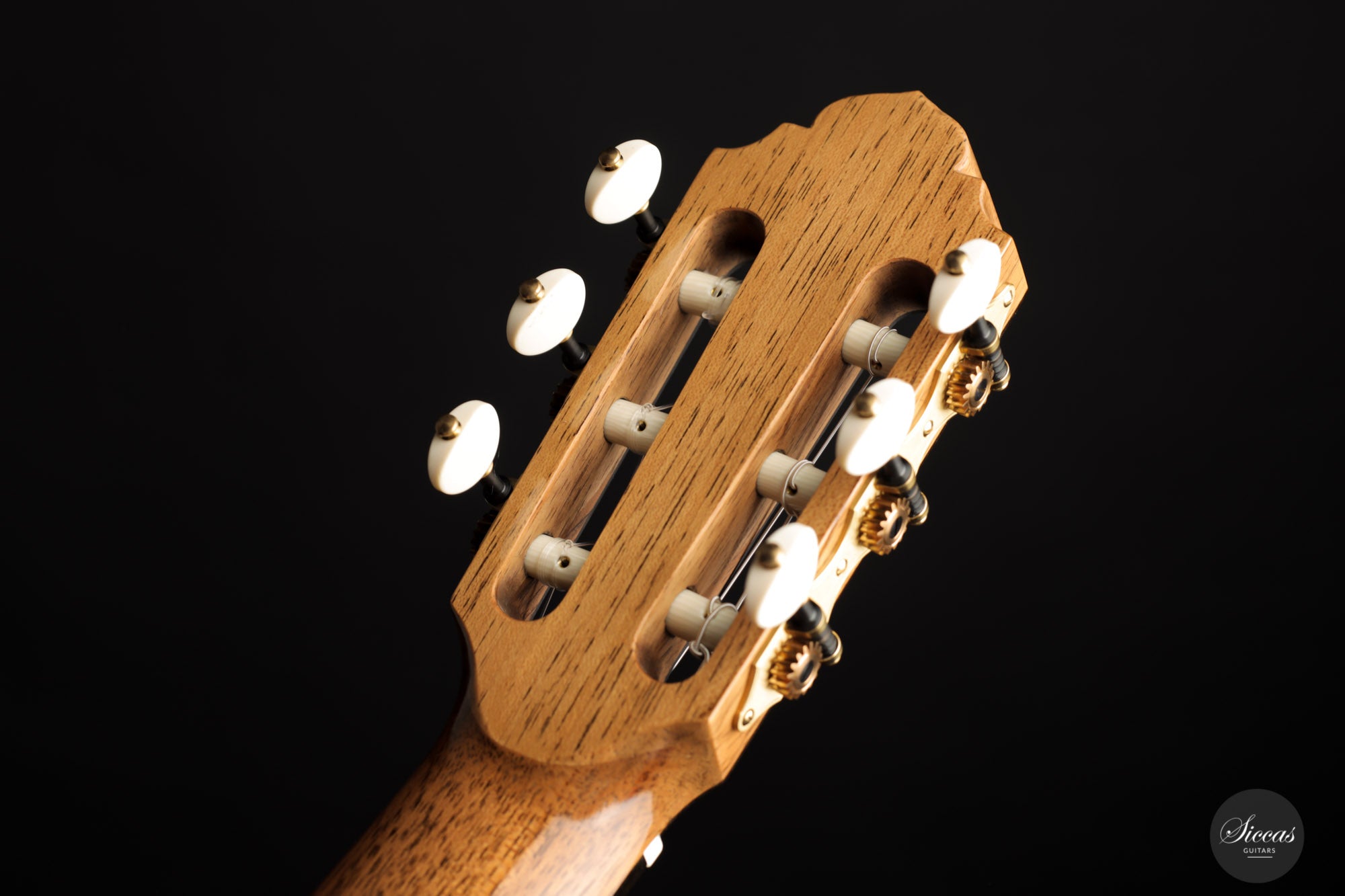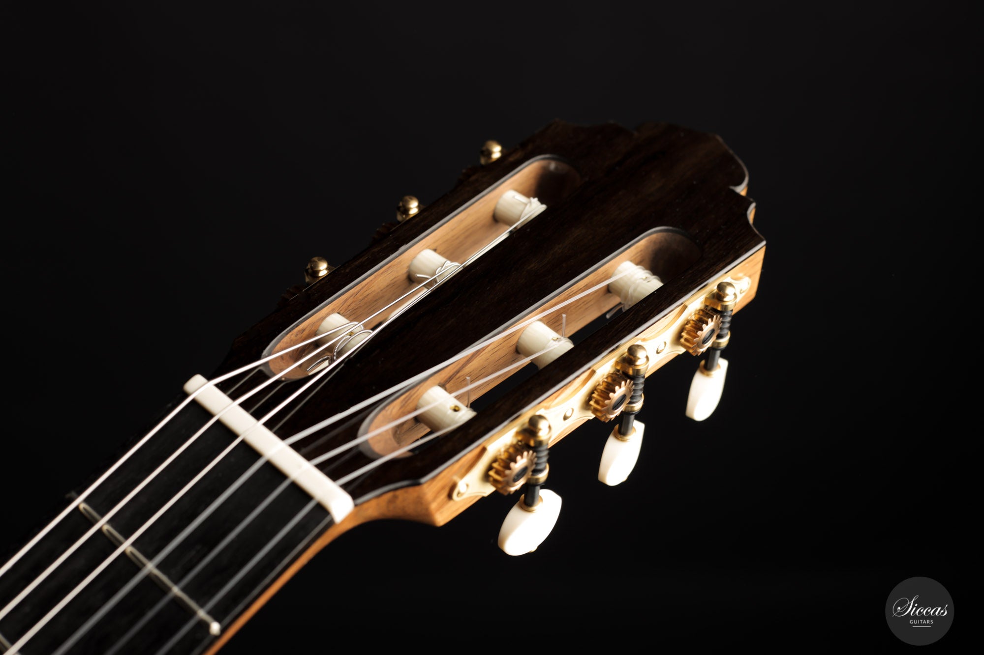 Built in 2021, this instrument weighs only an impressive 1240 grams and has a remarkable sound volume. With its spruce/Nomex/spruce fan bracing, this guitar develops an elegant and rich tone while offering unexpected possibilities of dynamic phrasing. Particularly noteworthy is the excellent balance in polyphony. In addition, especially the first string is characterized by an amazing consistency and long sustain up to the high registers. This guitar clearly belongs to the top category of modern guitars and is an ideal concert instrument, also due to its excellent playability.