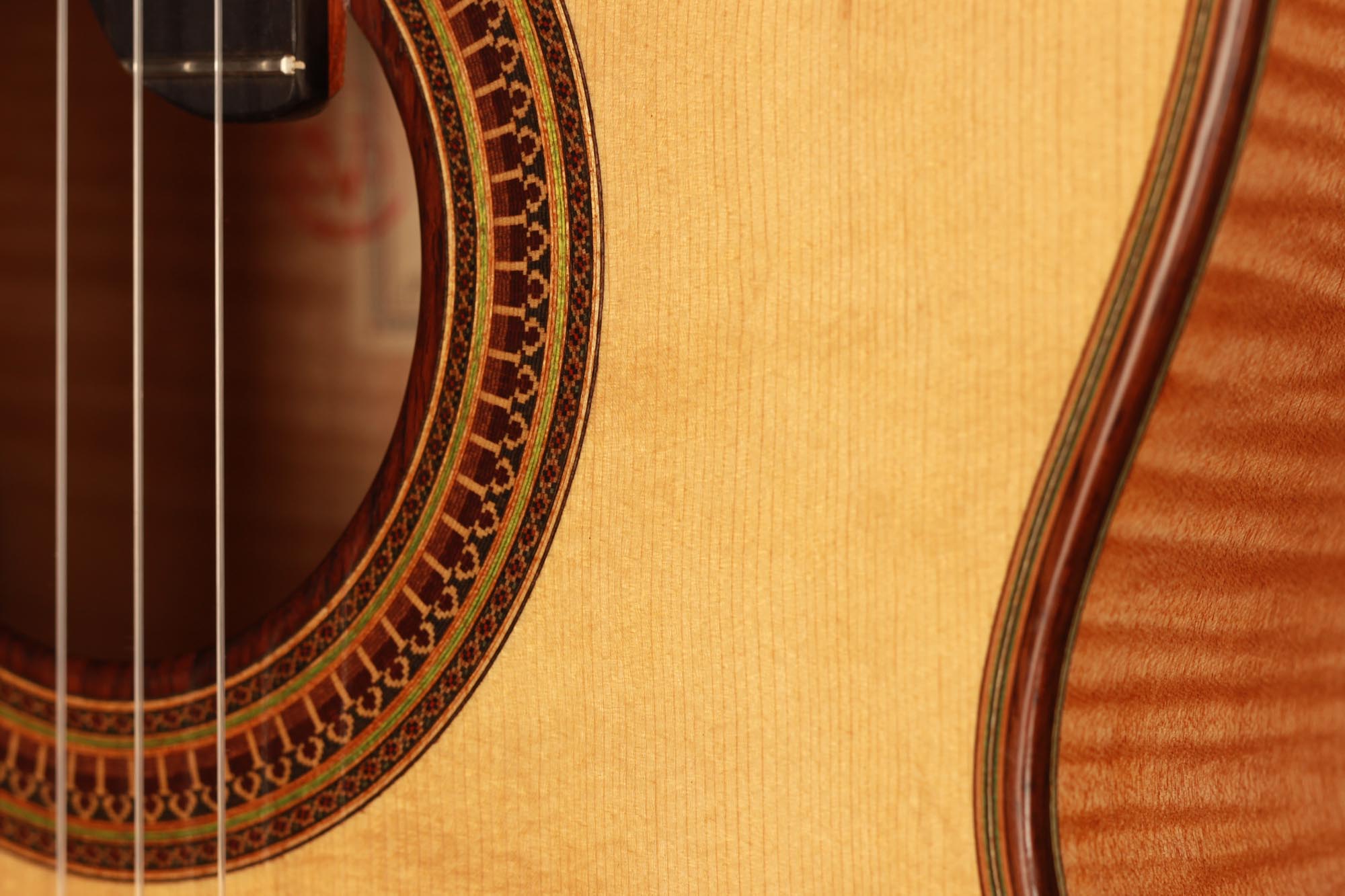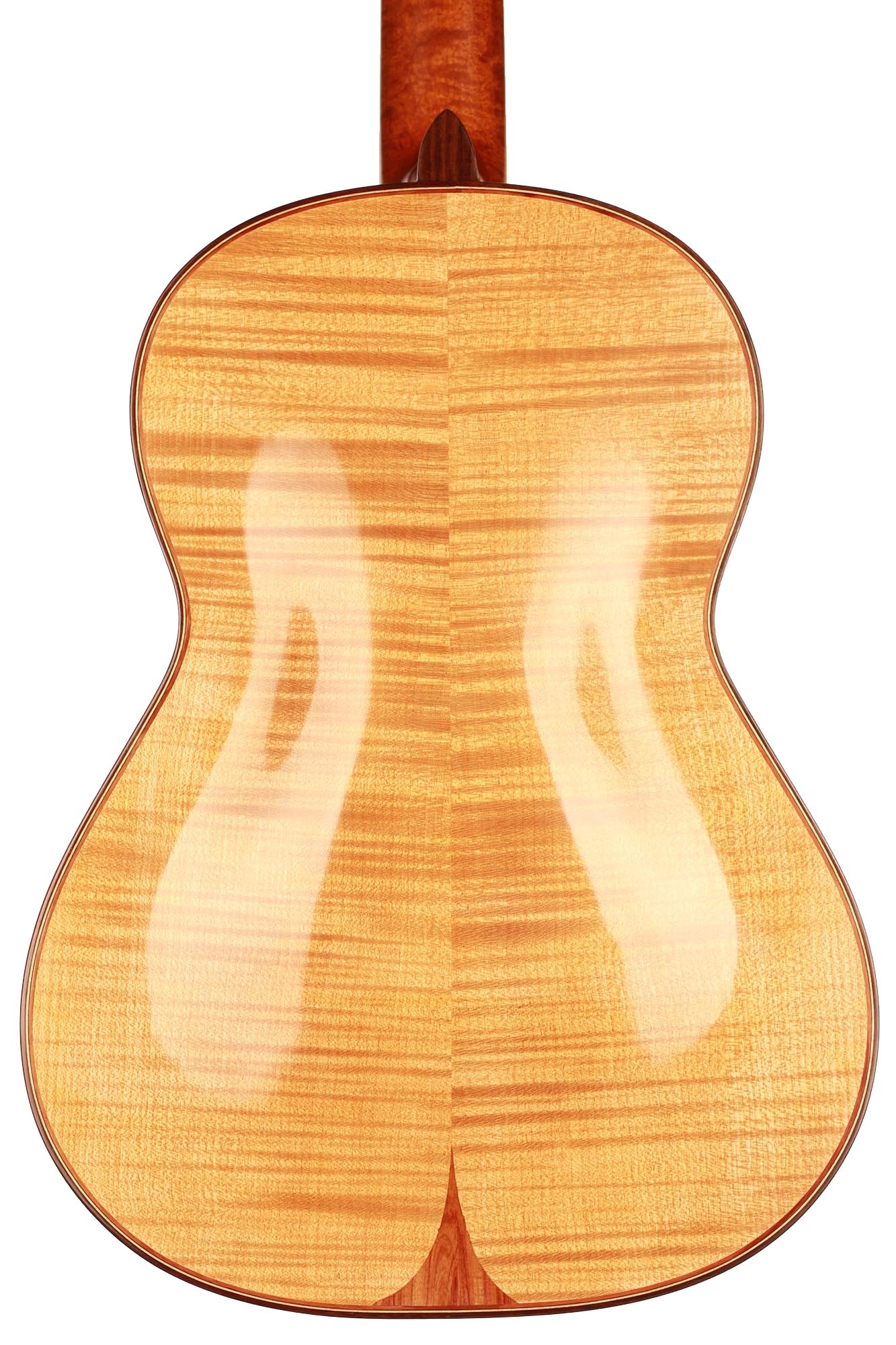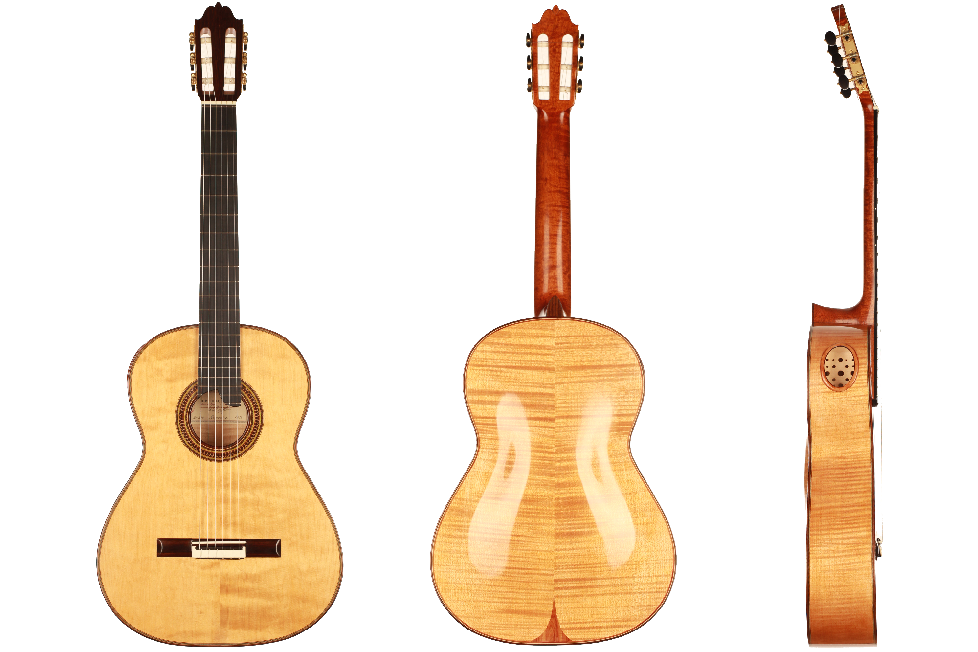 Here is an exquisite instrument built by Curt Claus Voigt in 2015. This beautiful “Espressivo” model has a very fine antique-coloured spruce top complemented by seductive flamed maple back and sides. The guitar is all French polished to very high standard. This guitar is notable by its huge volume and projection offered by the fluidly domed back and the very light lattice-braced top. Its sensitivity makes it an extremely nuanced guitar with a grandiose volume and a sophisticated tone. Definitely advised for an ambitious and passionate musician.