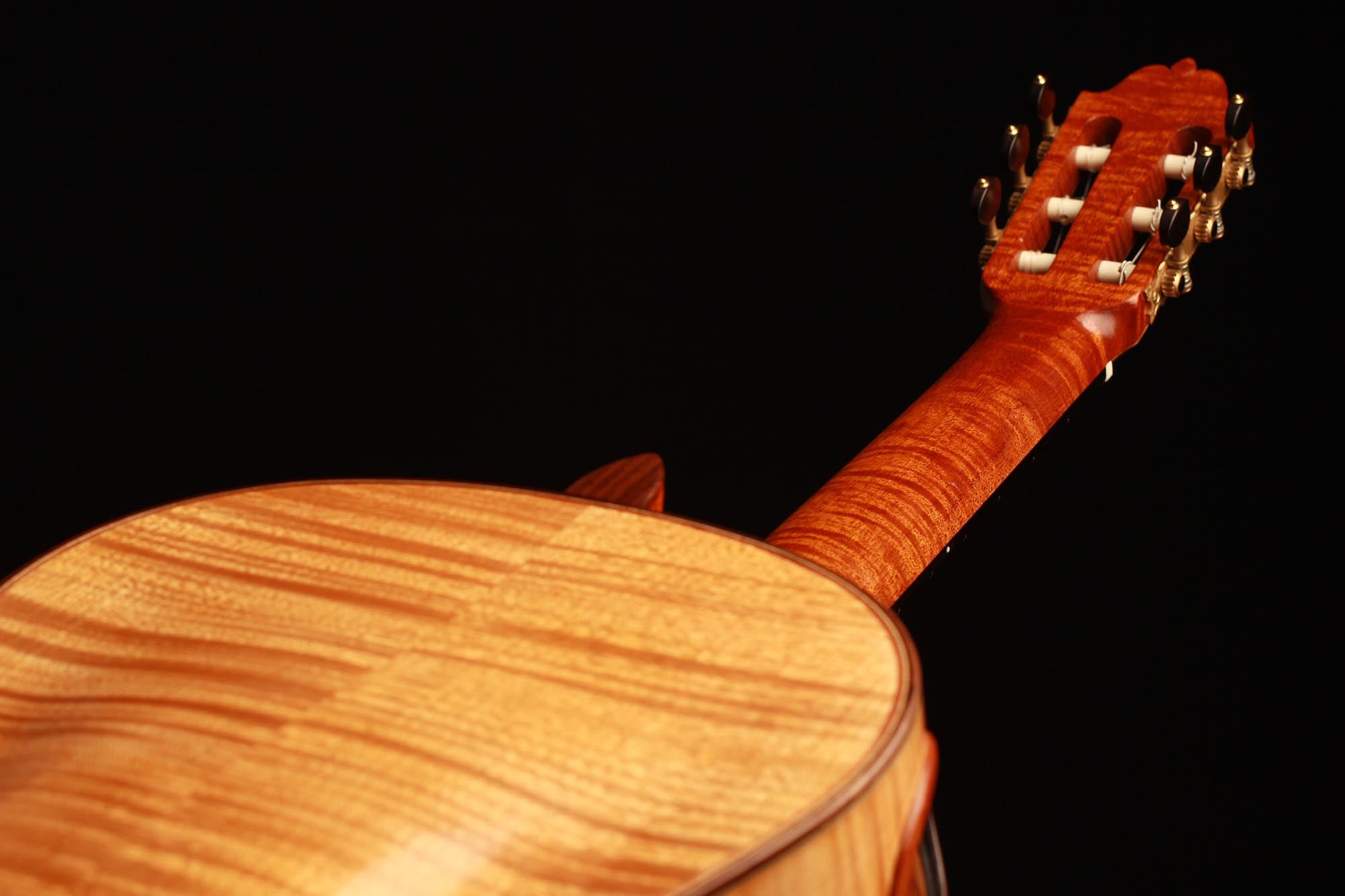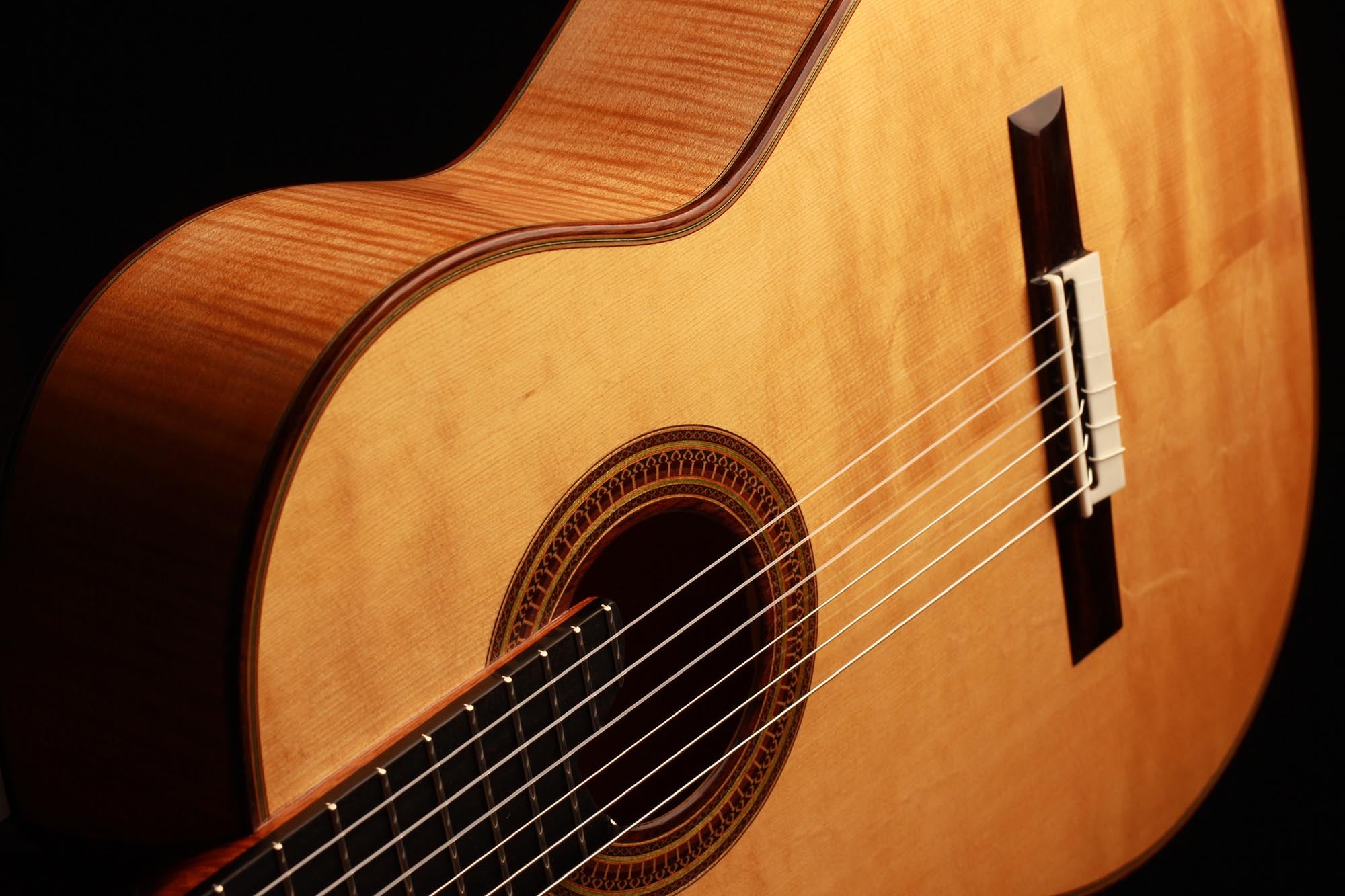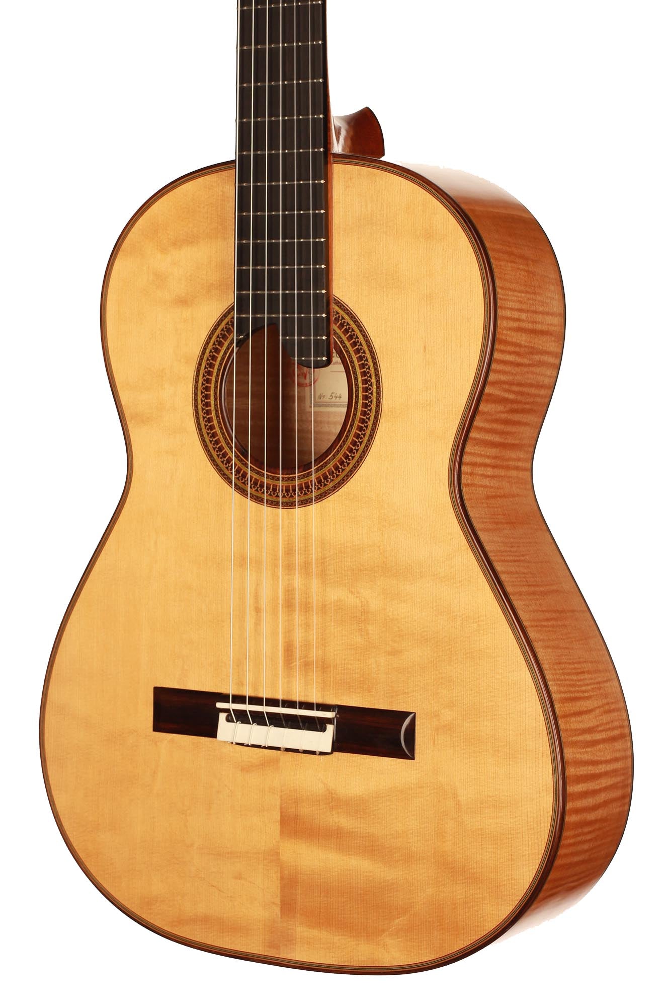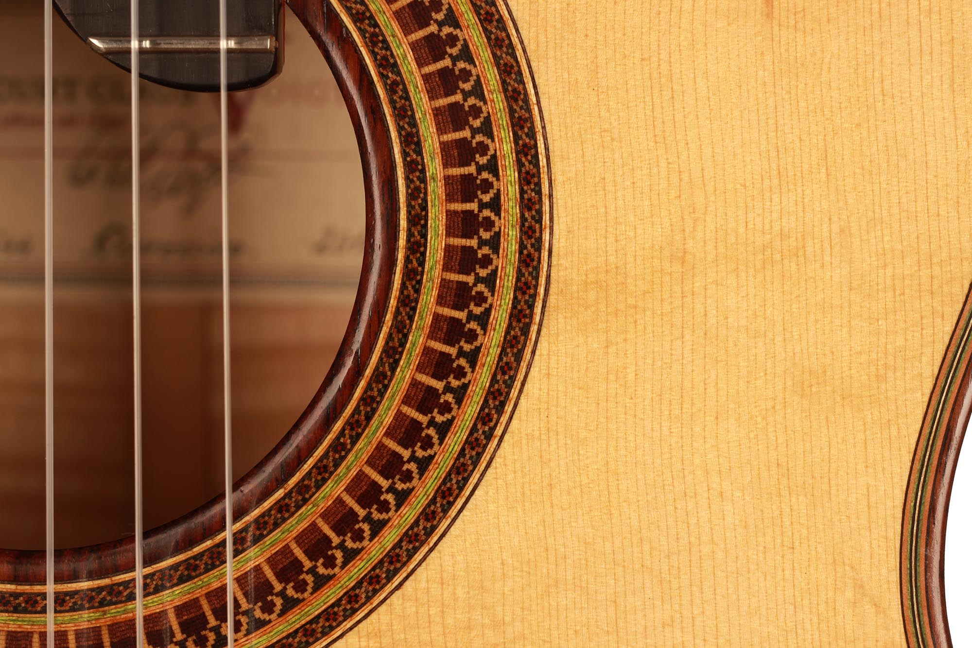 Here is an exquisite instrument built by Curt Claus Voigt in 2015. This beautiful “Espressivo” model has a very fine antique-coloured spruce top complemented by seductive flamed maple back and sides. The guitar is all French polished to very high standard. This guitar is notable by its huge volume and projection offered by the fluidly domed back and the very light lattice-braced top. Its sensitivity makes it an extremely nuanced guitar with a grandiose volume and a sophisticated tone. Definitely advised for an ambitious and passionate musician.