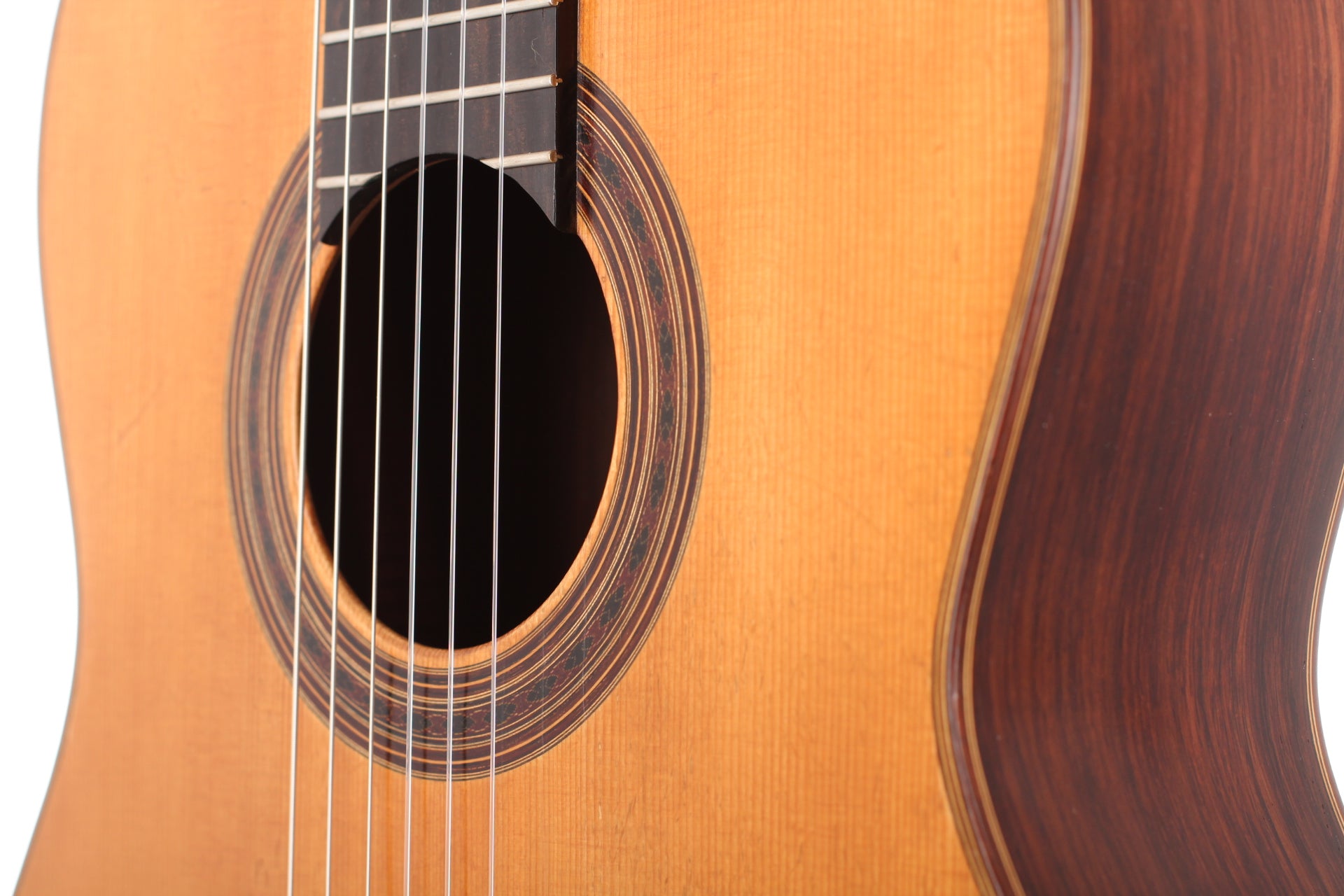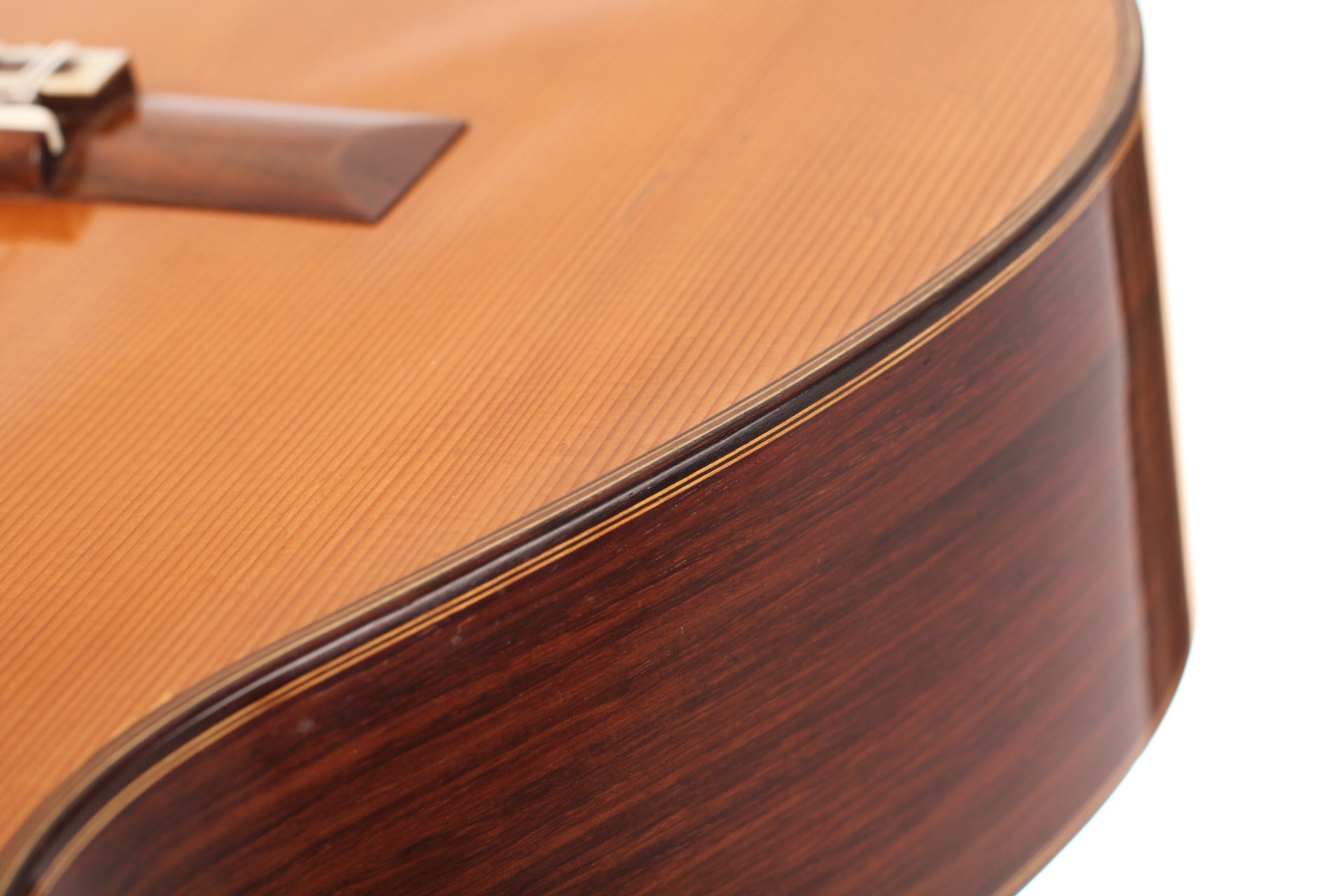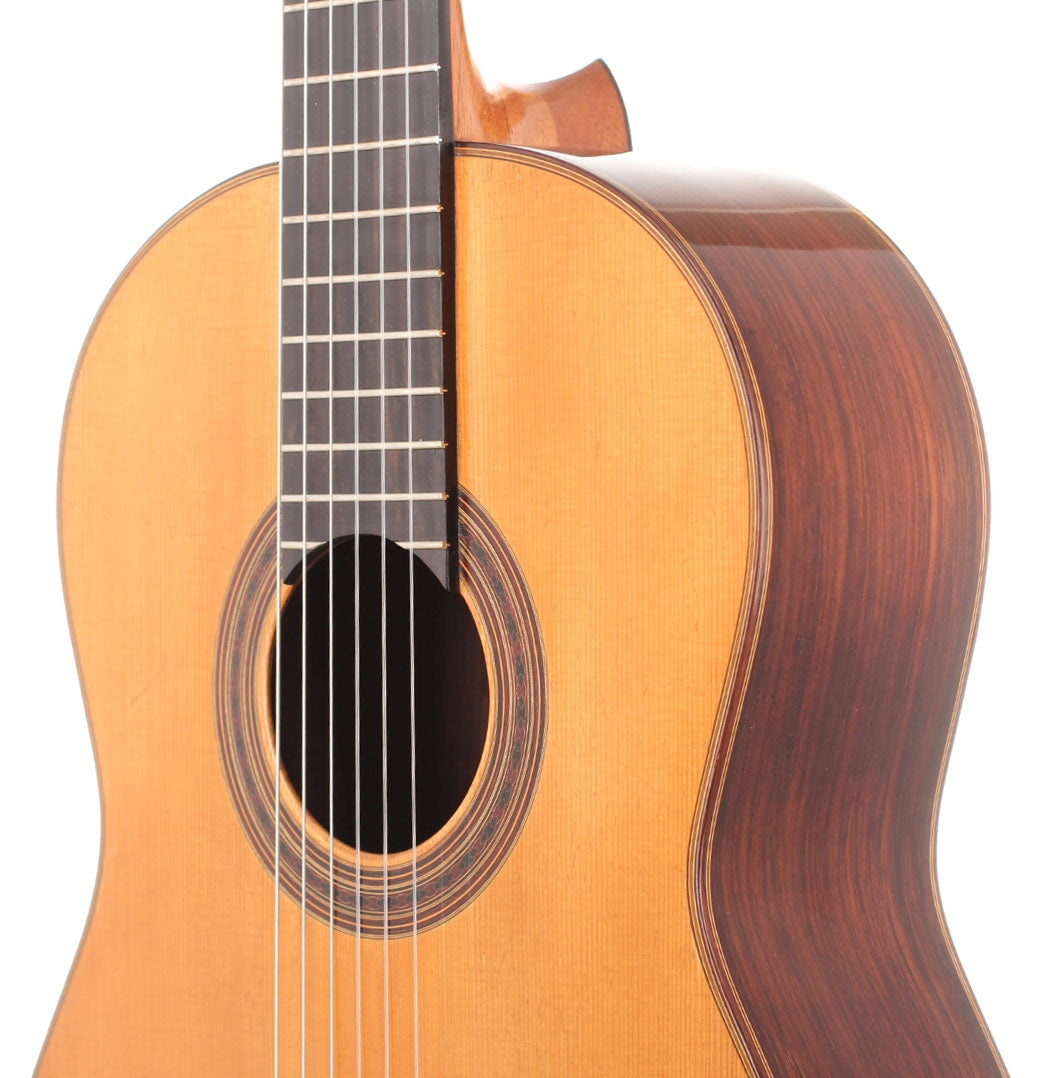 Early in his career, he built some guitars with spruce top, but this changed in 1974 when he finally devoted himself mainly to guitars with cedar top (with only few exceptions that were built on special request). This Recital model guitar has a spruce top and Indian rosewood back and sides. The guitar in good condition. There is a well repaired crack near the bridge (on the right side). The tuning machines are made by Fustero.