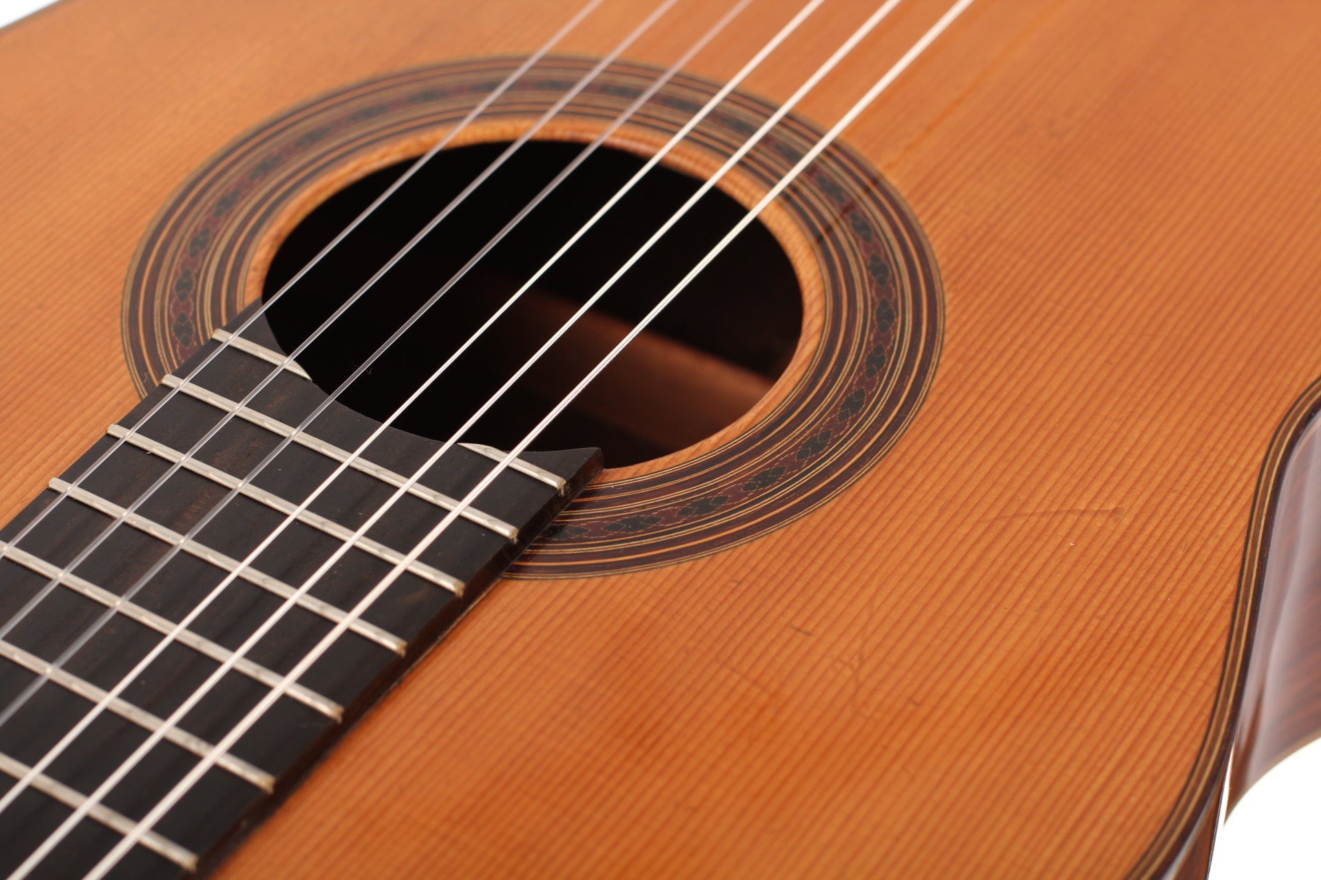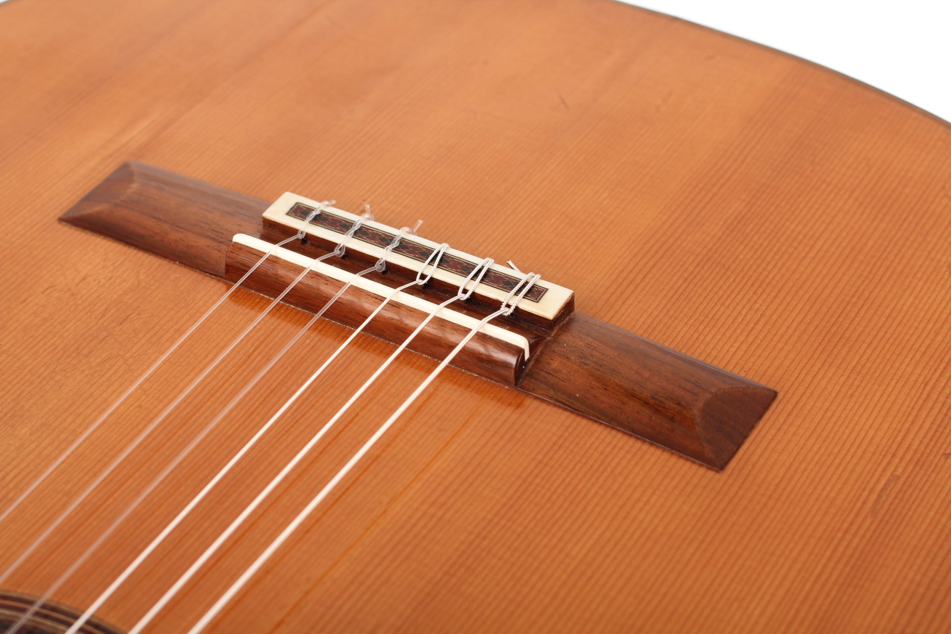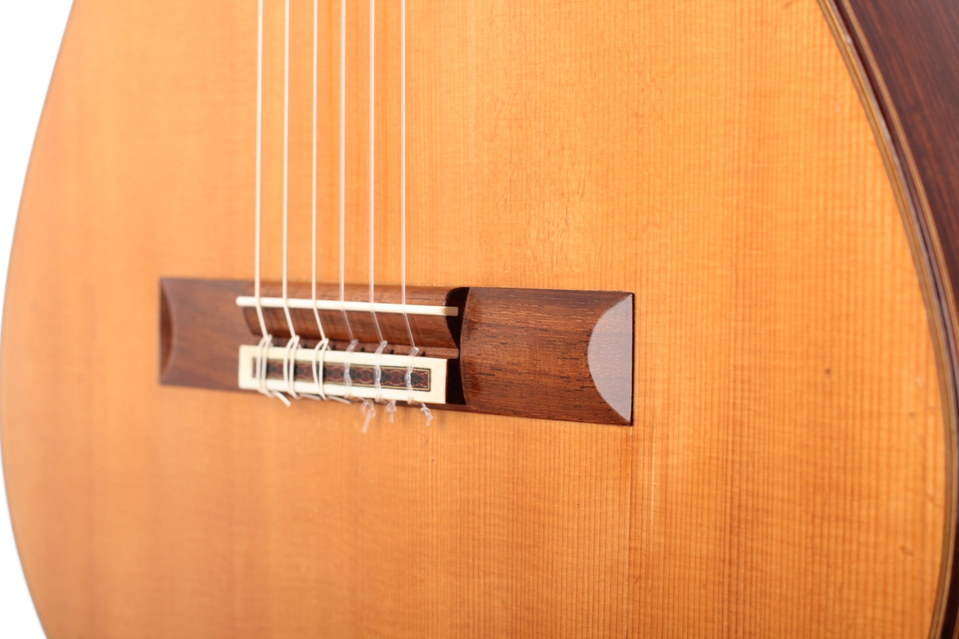 Early in his career, he built some guitars with spruce top, but this changed in 1974 when he finally devoted himself mainly to guitars with cedar top (with only few exceptions that were built on special request). This Recital model guitar has a spruce top and Indian rosewood back and sides. The guitar in good condition. There is a well repaired crack near the bridge (on the right side). The tuning machines are made by Fustero.