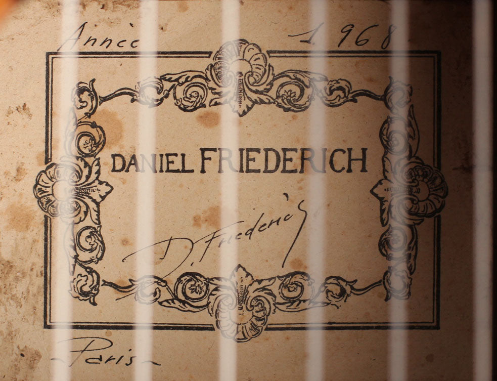 Daniel Friederich was born on January 16th in 1932. At the age of 23 years he built his first instrument (a copy of a Simplicio), because he wanted to learn to play the guitar. His guitar teacher Christian Aubin and the painter and guitar builder Robert Bouchet had a great influence on his work and Friederich developed their ideas further. For decades now, Friederich has been one of the world’s most important luthiers and his guitars are played all over the world.