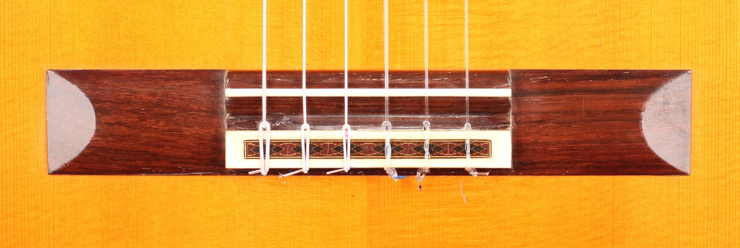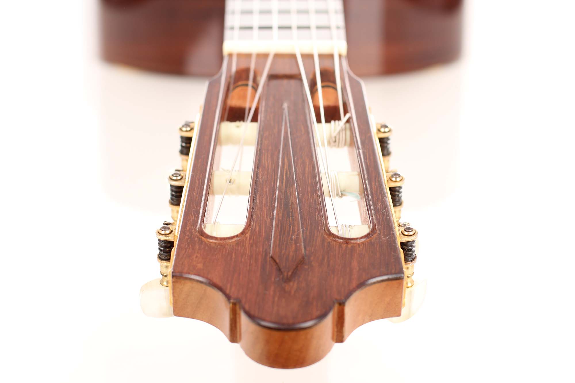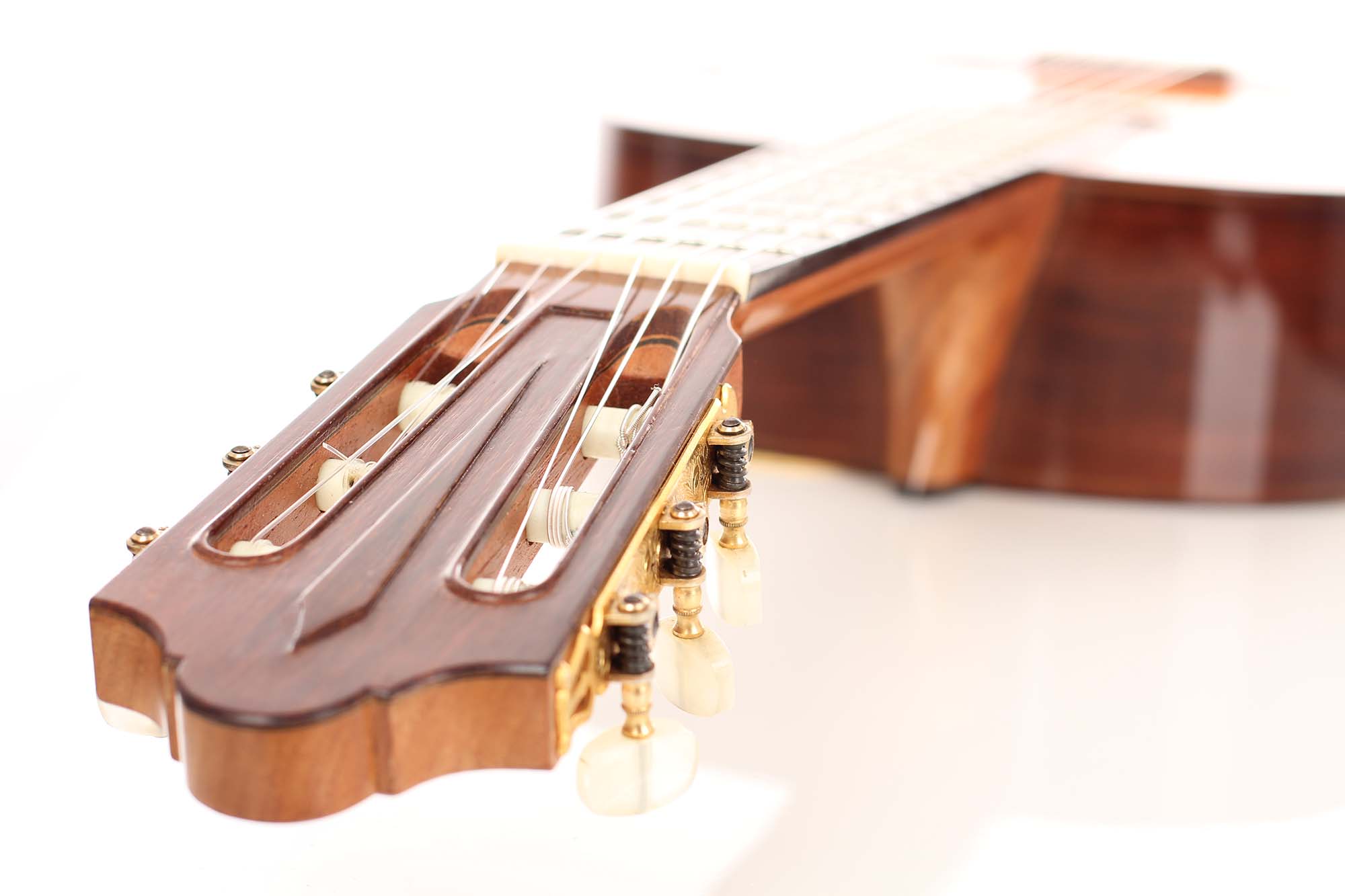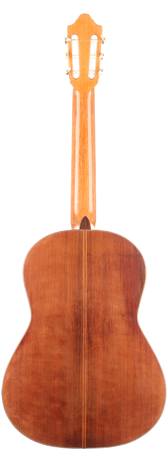 Early in his career, he built some guitars with spruce top, but this changed in 1974 when he finally devoted himself mainly to guitars with cedar top (with only few exceptions that were built on special request. This guitar is one of the rare examples with a spruce top. The guitar in impressive condition - everything is original. There is a little ding underneath the bridge. The tuning machines are made by Fustero.