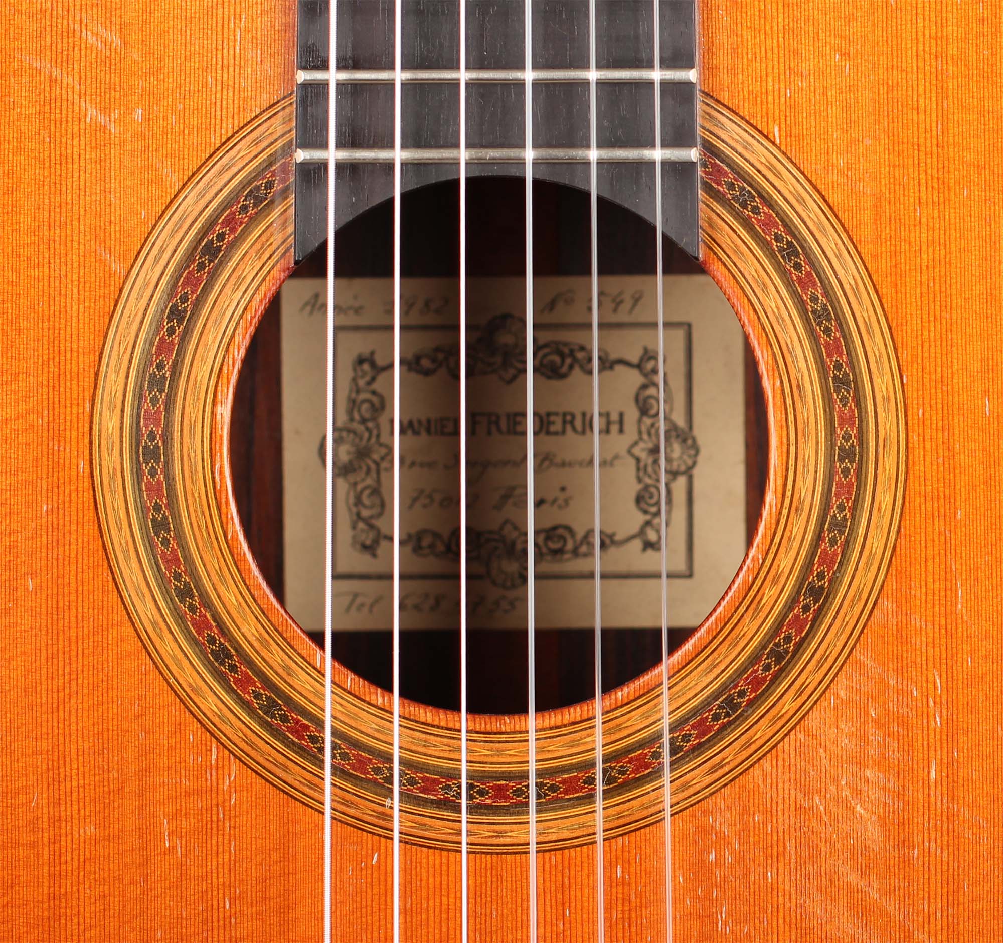 Daniel Friederich was born on January 16, 1932. Although having the strong wish to play guitar, he had to face the shortage of money. However, at the age of 23, Friederich solved this dilemma by building his first guitar himself with the result of a copy of a Simplicio guitar. At the beginning Friederich was helped by his guitar teacher Aubin. Also after the early beginnings of guitar making, Friederich was inspired by the work of his friend Robert Bouchet whose ideas were also further developed by Friederich. For decades, Daniel Friederich has been one of the most important luthiers in the world. In 2015 he stopped to build guitars and sold all his tools.