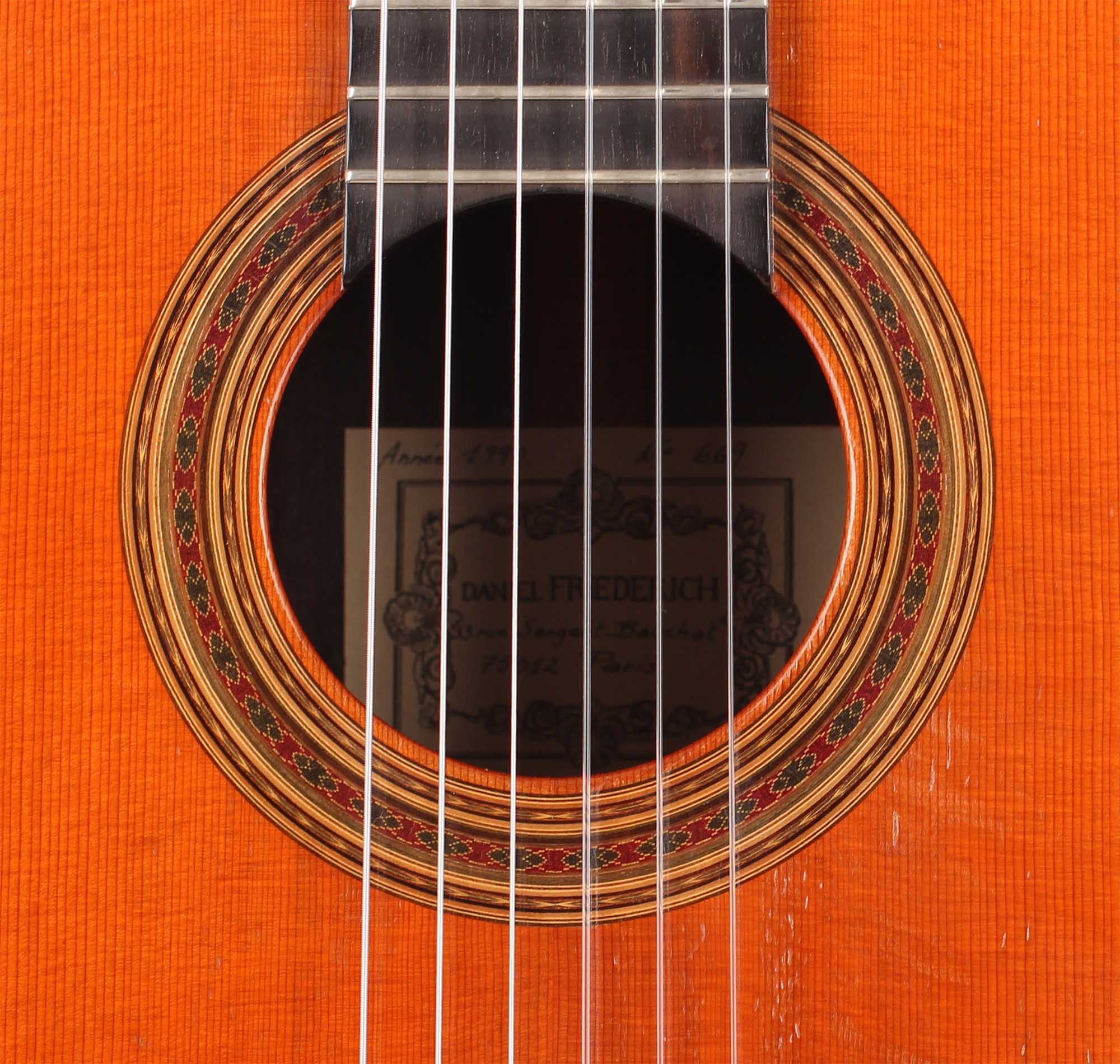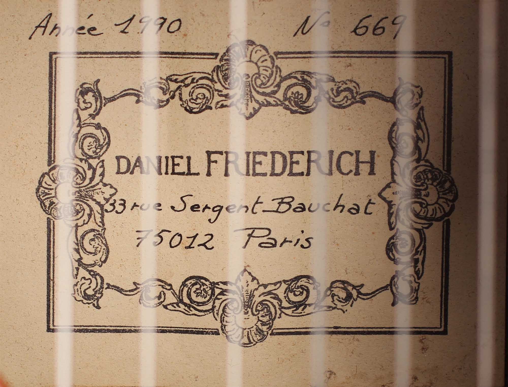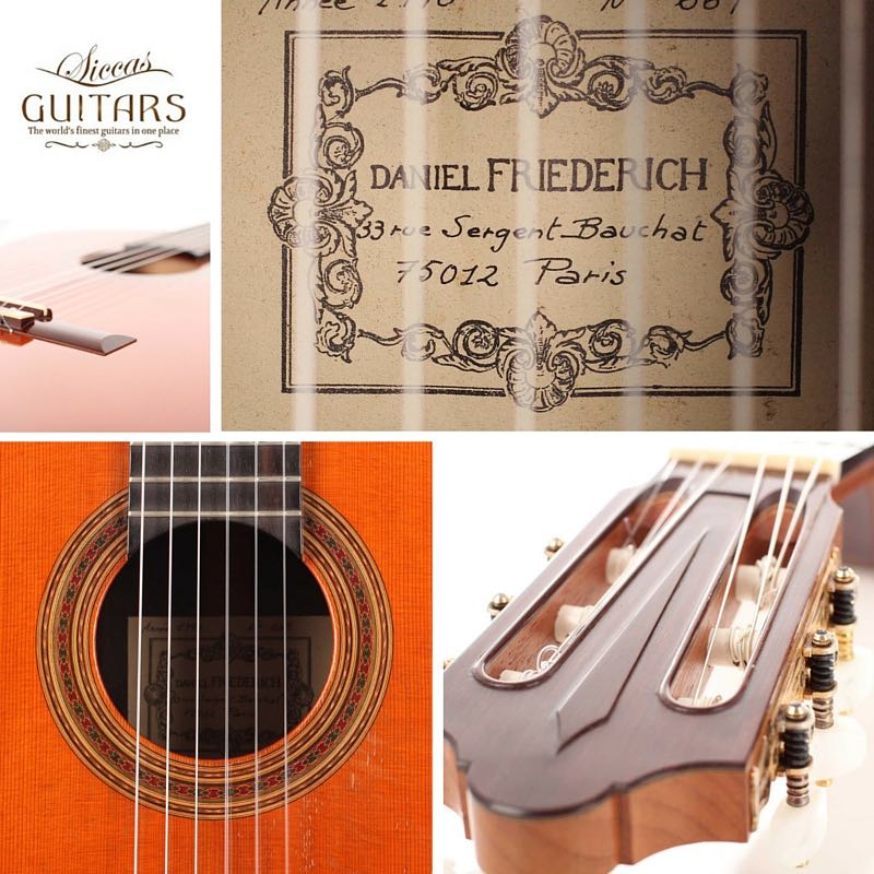 Daniel Friederich was born on January 16, 1932. Although having the strong wish to play guitar, he had to face the shortage of money. However, at the age of 23, Friederich solved this dilemma by building his first guitar himself with the result of a copy of a Simplicio guitar. At the beginning Friederich was helped by his guitar teacher Aubin. Also after the early beginnings of guitar making, Friederich was inspired by the work of his friend Robert Bouchet whose ideas were also further developed by Friederich. For decades, Daniel Friederich has been one of the most important luthiers in the world. In 2015 he stopped to build guitars and sold all his tools.