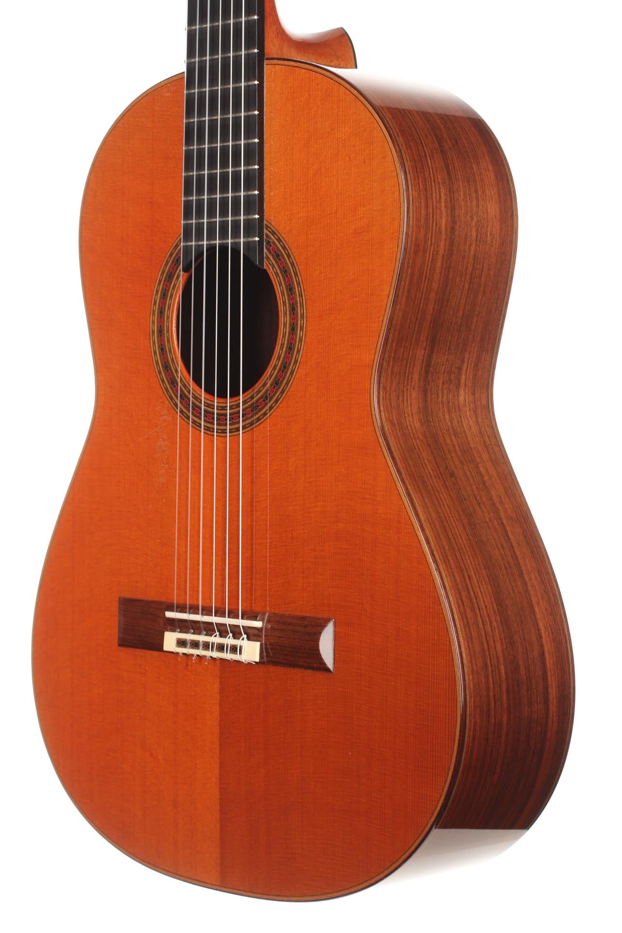 At the beginning of his career, Daniel Friederich was building mostly spruce-top guitars. That changed in the 1970’s as he devoted his production to the construction of cedar-top guitars. This Friederich guitar is a very rare lefthand model of this second period. It was made in 1994 and is in very good condition: it only has some marking on the top and a very little ding below the bridge. It has no structural cracks. As its fellow Friederich right-handed instruments, this guitar is a master instrument of the higher level. It features all the results of the researches Daniel Friederich devoted his life to. It is a perfectly balanced guitar with an even and homogeneous sound level and sound quality all along the fingerboard. It is very comfortable to play and to listen to. An amazing chance for a demanding left-handed guitar player. The original tuners are made by Fustero. A Hiscox Pro II case is included.