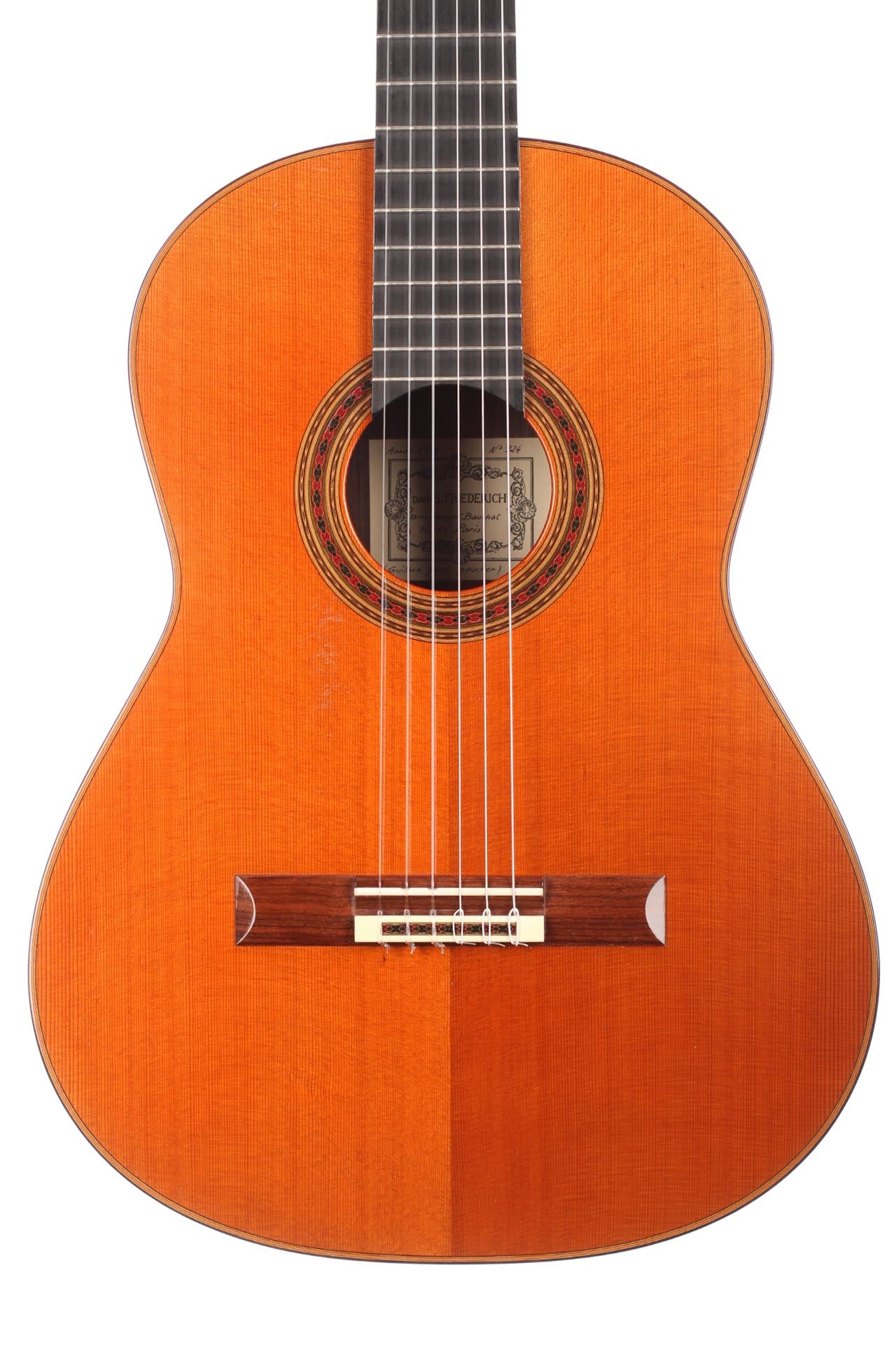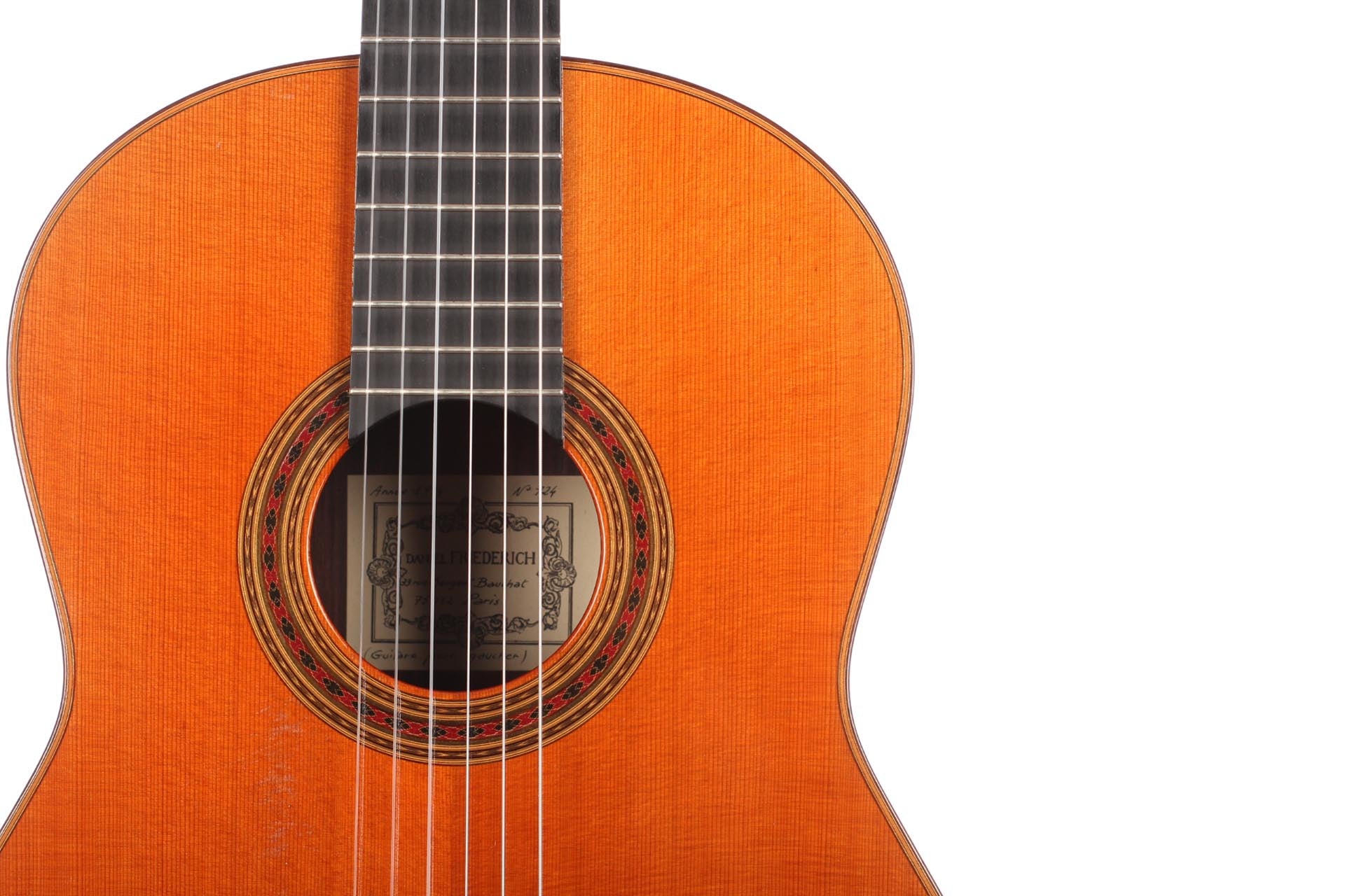 Daniel Friederich was born on the sixteenth of January 1932. Although having the strong wish to play the guitar, he had to face a shortage of money. However, at the age of 23, Friederich solved this dilemma by building his first guitar himself: a copy of a Simplicio guitar. At the beginning, Friederich was helped by his guitar teacher Christian Aubin. After having bought tools and gathered some guitar making experiences, Friederich showed his fifteenth guitar to Robert Bouchet. Ever since, R. Bouchet inspired his work. He personally developed some ideas of R. Bouchet during his career. For decades, Daniel Friederich has been one of the most important luthiers in the world. In 2015, he stopped building guitars and sold all his tools.