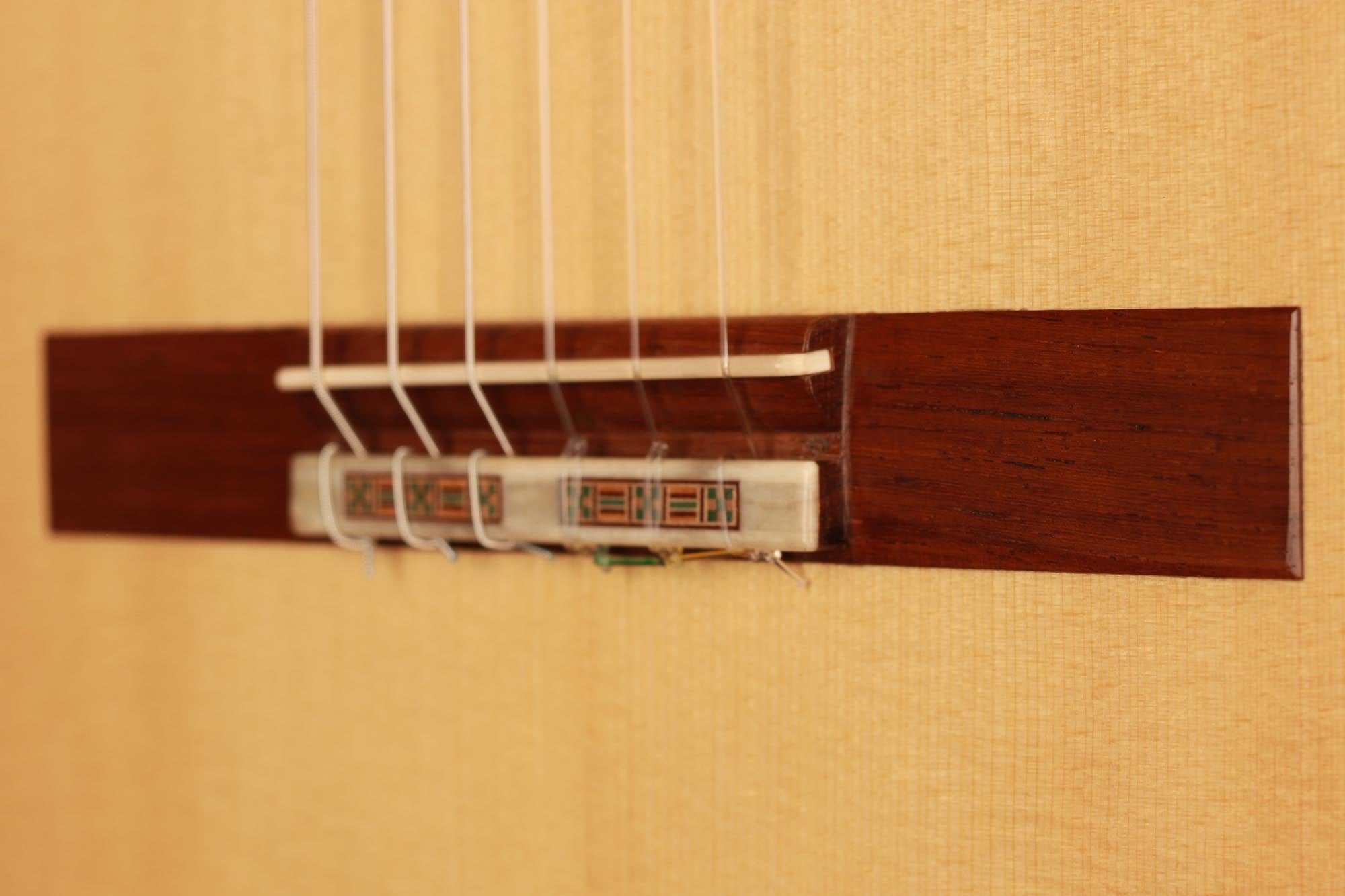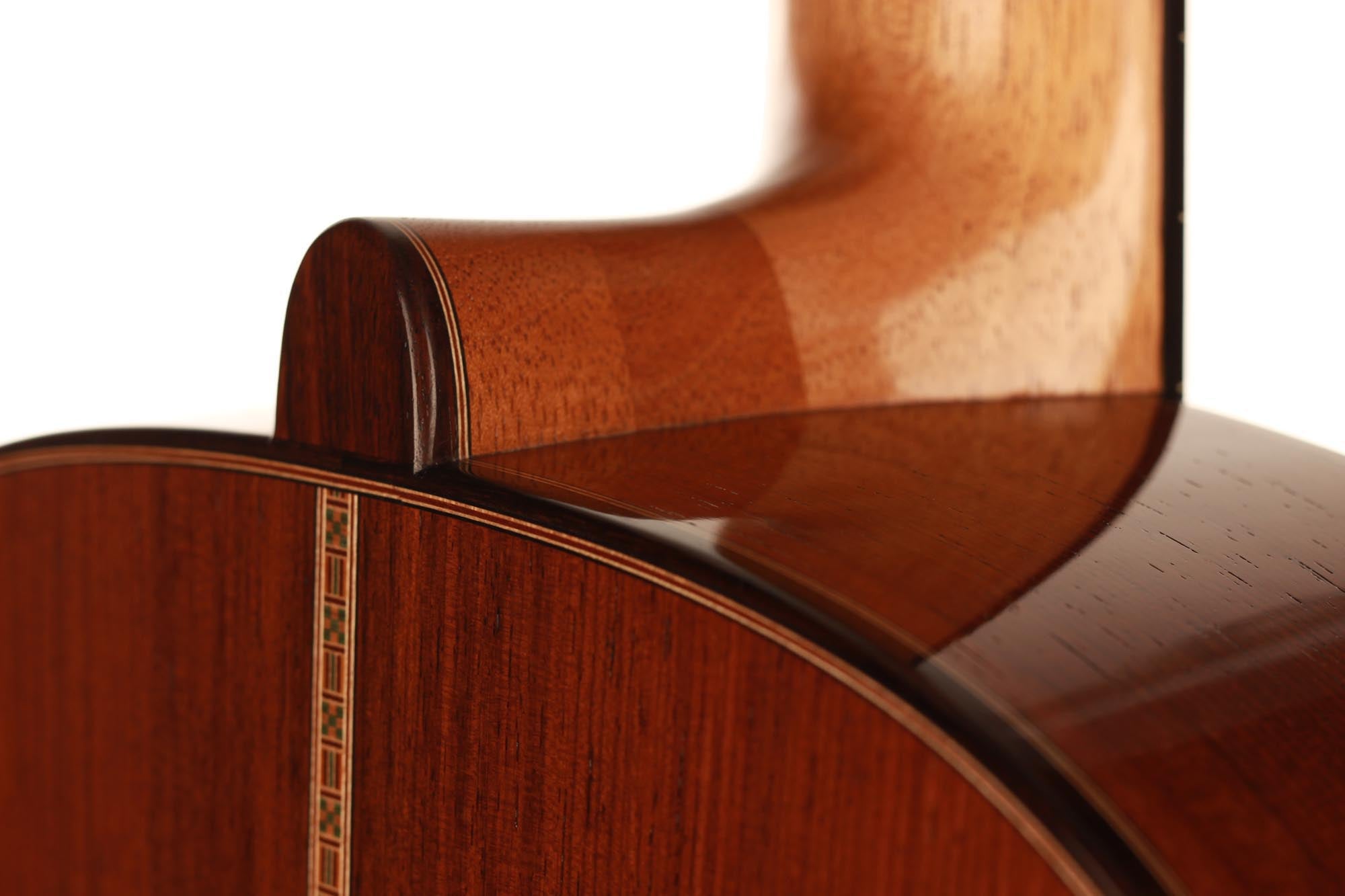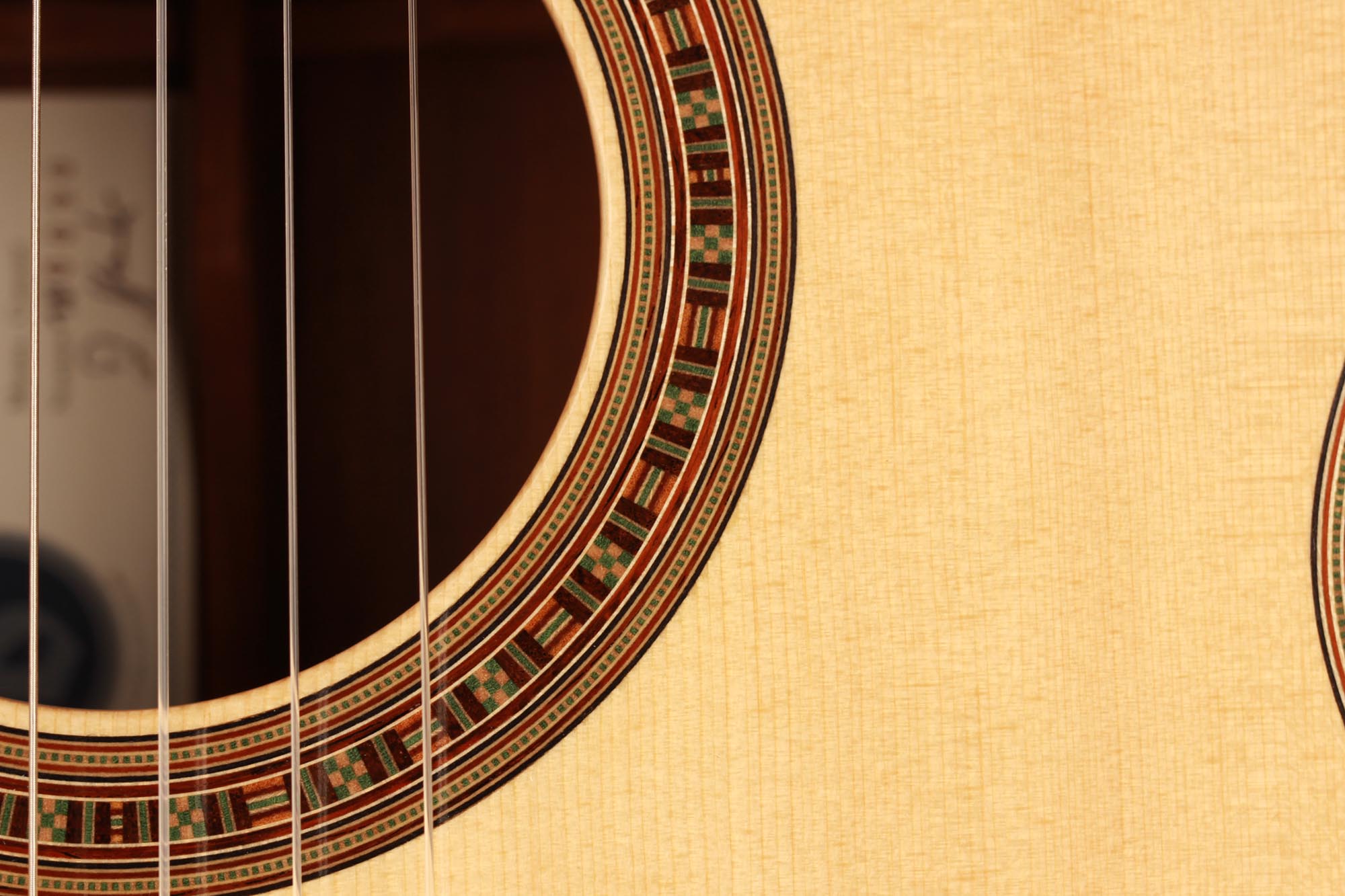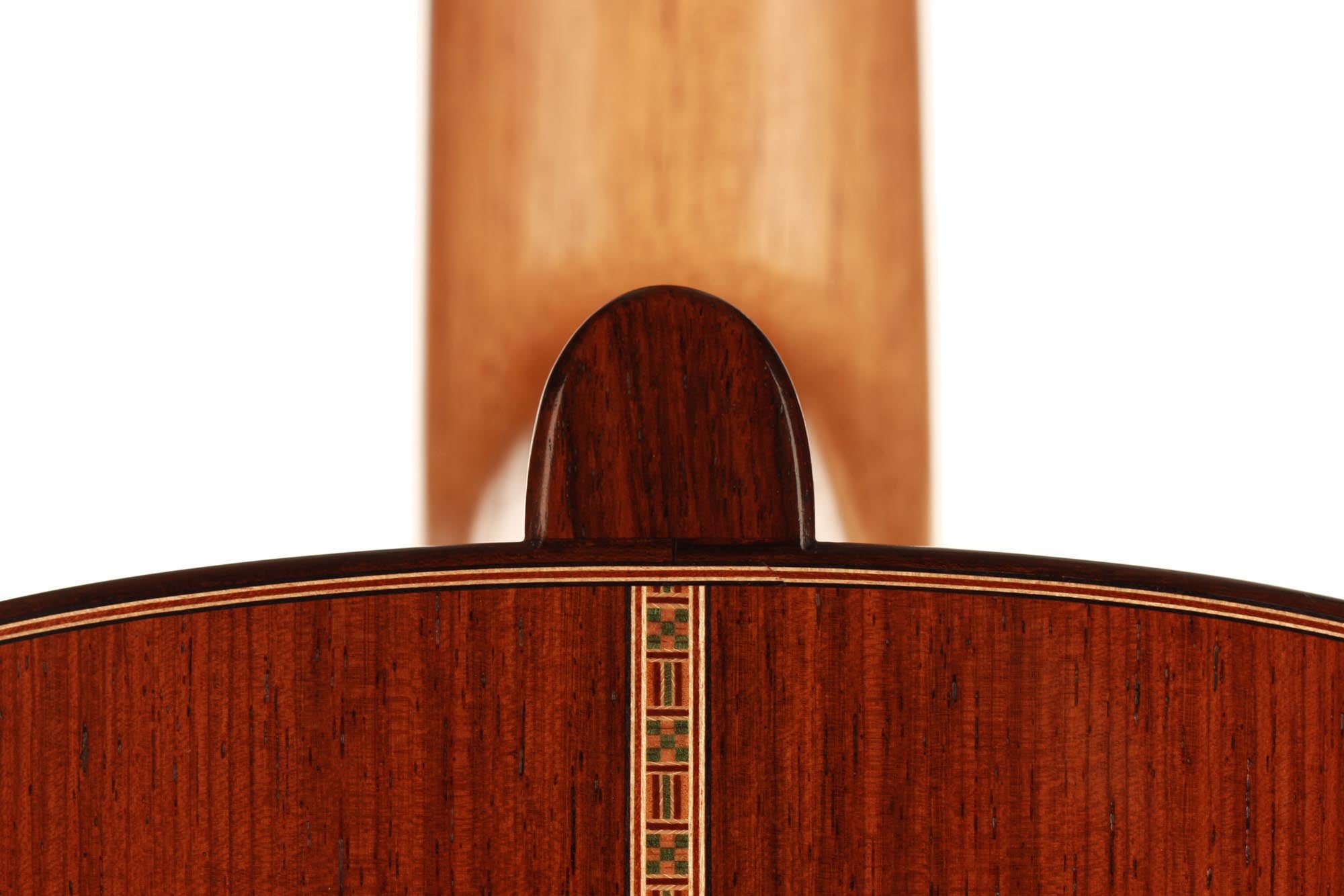 This guitar, which was built at the end of 2018, is especially decorated and very interesting in its construction. The top is slightly sloping on the treble side so that access to the treble is easier in the higher registers. On the bass side, however, the top is shaped as usual, so that the guitarist keeps his orientation when looking at the fingerboard. The volume and projection of this guitar are impressive. The precise response, the accuracy of the tones and the ease of playing make this guitar an extremely vibrant instrument, ideal for ambitious guitarists.