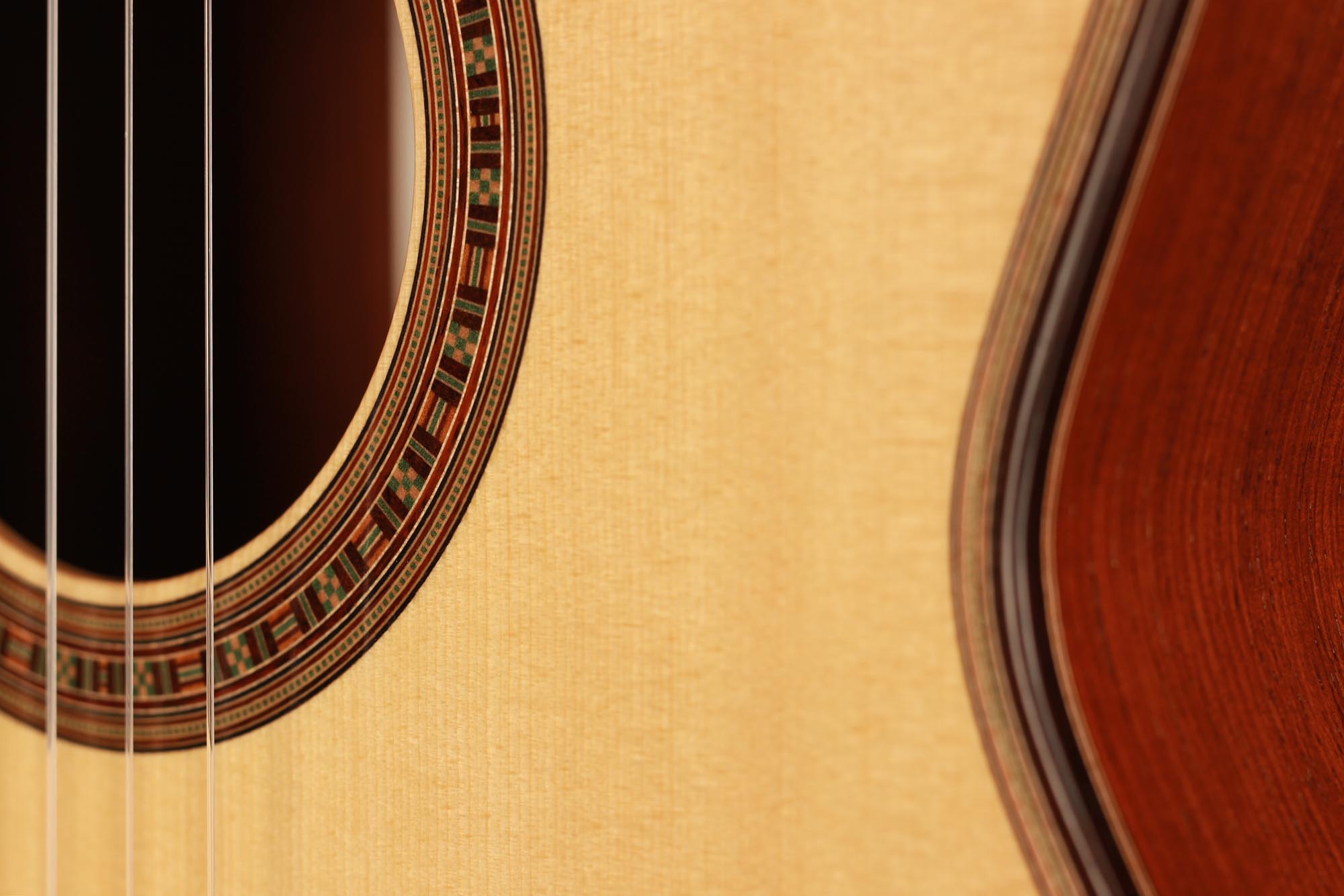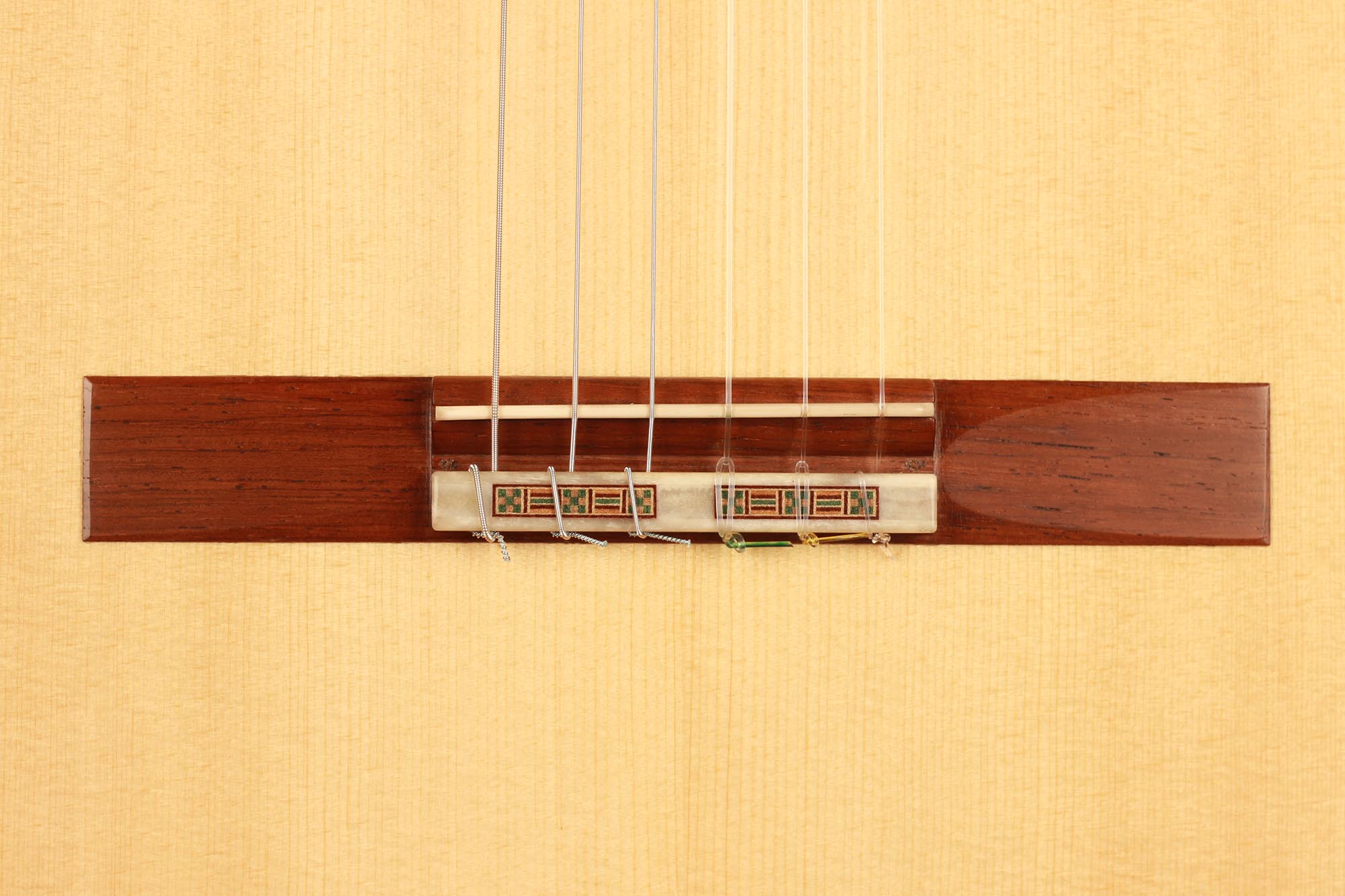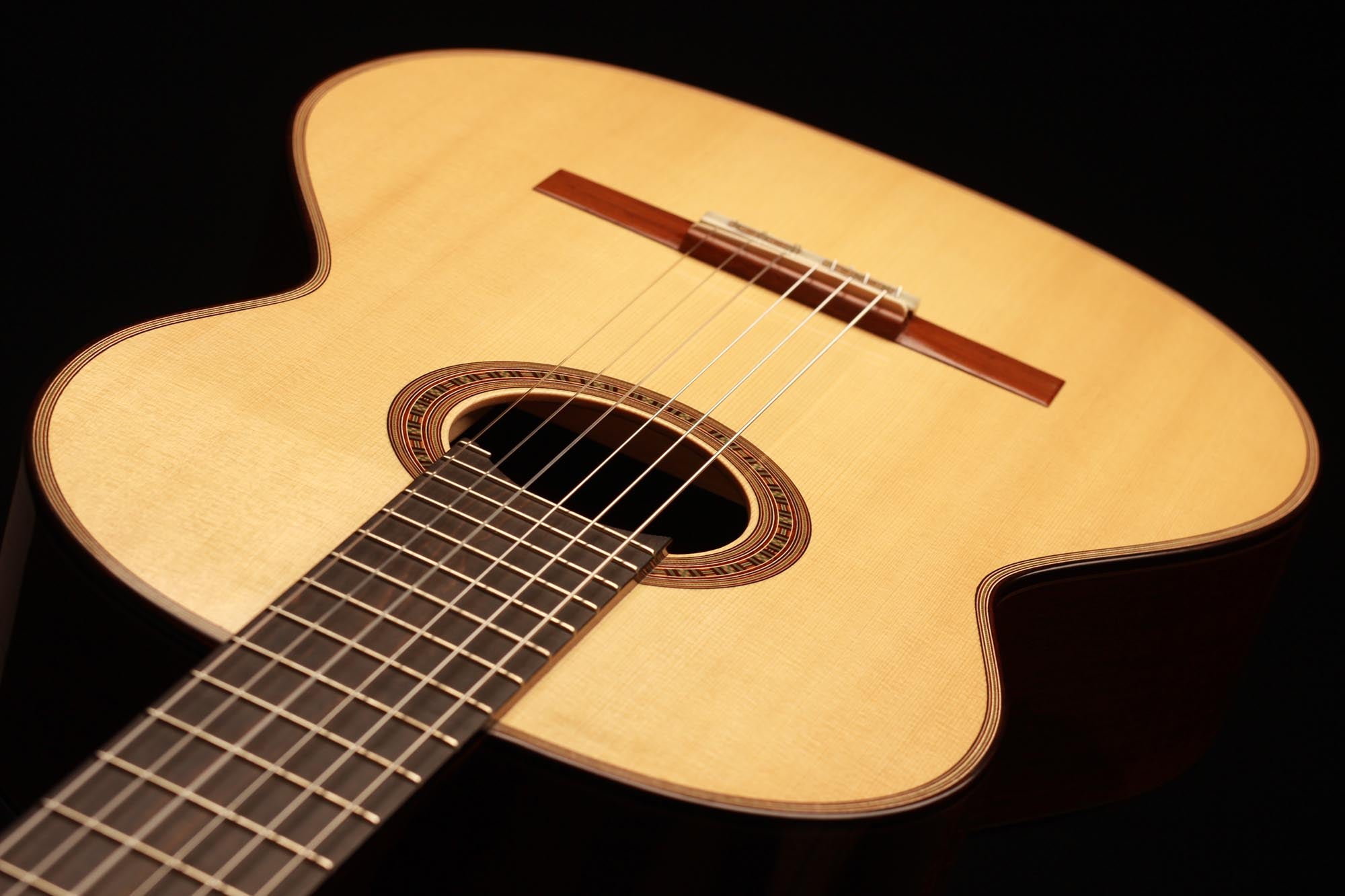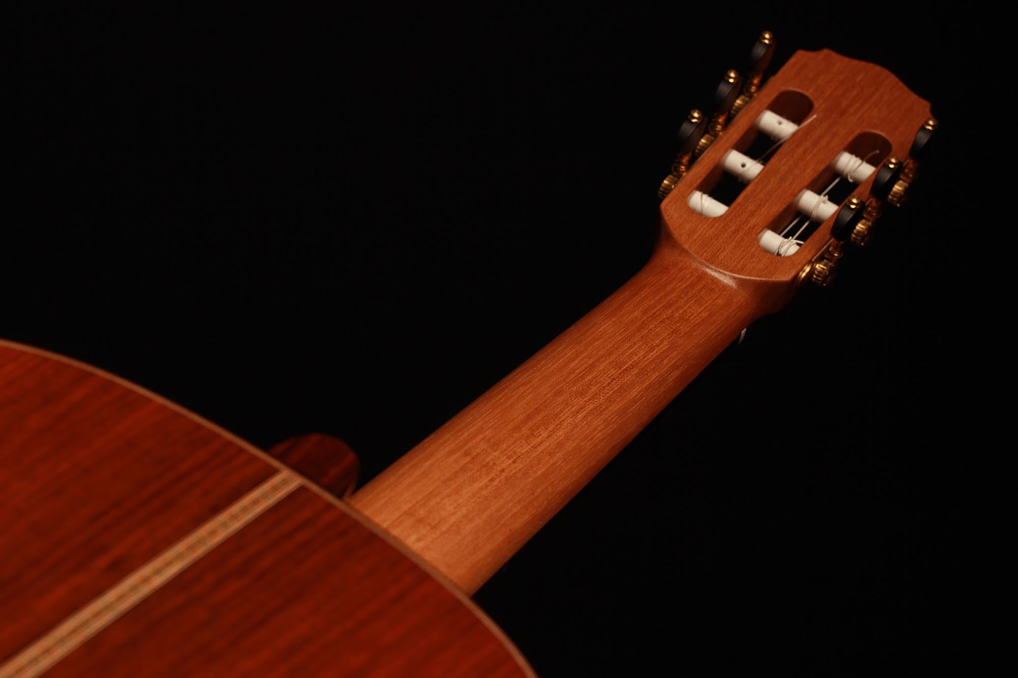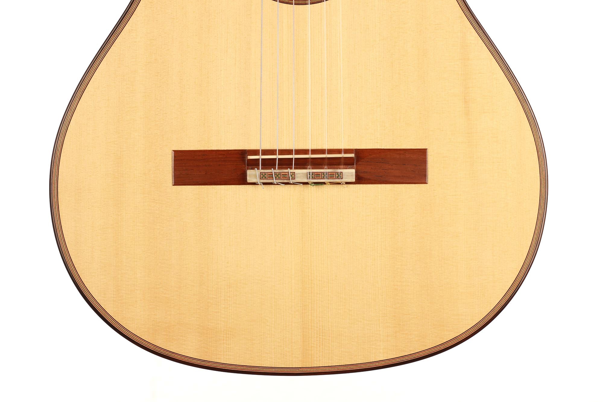 This guitar, which was built at the end of 2018, is especially decorated and very interesting in its construction. The top is slightly sloping on the treble side so that access to the treble is easier in the higher registers. On the bass side, however, the top is shaped as usual, so that the guitarist keeps his orientation when looking at the fingerboard. The volume and projection of this guitar are impressive. The precise response, the accuracy of the tones and the ease of playing make this guitar an extremely vibrant instrument, ideal for ambitious guitarists.