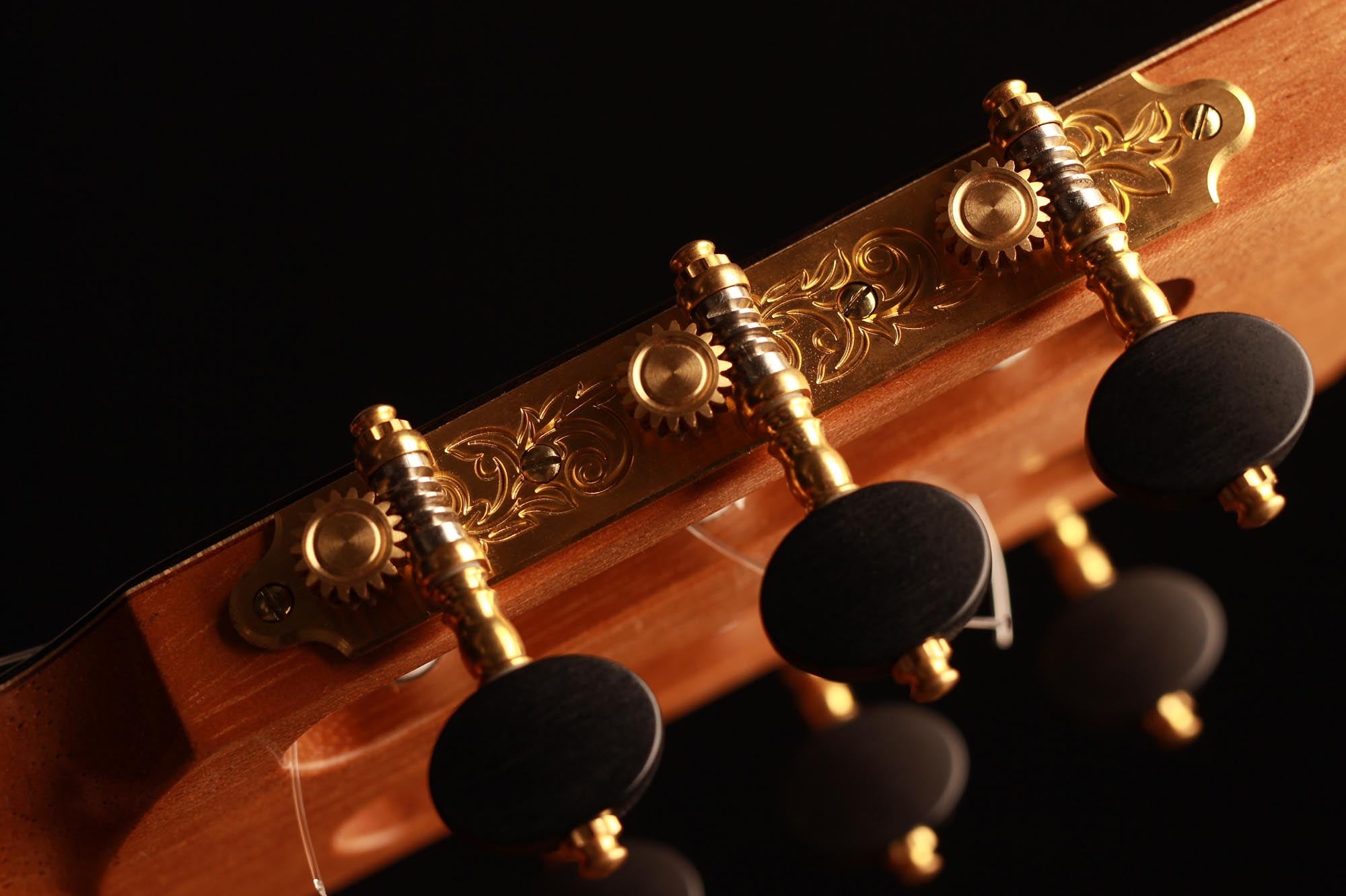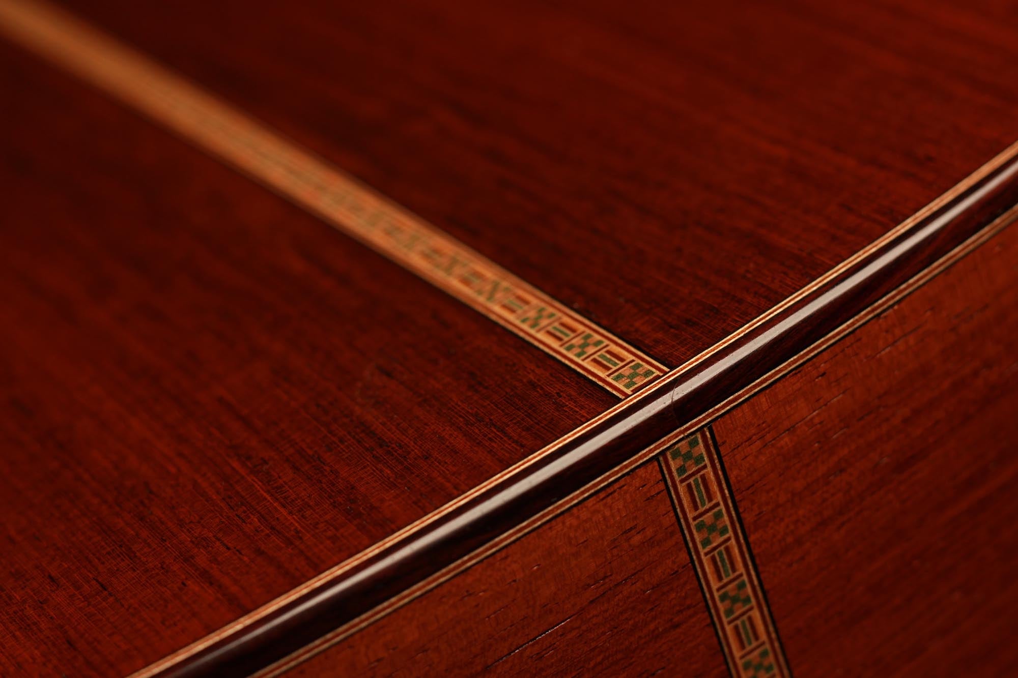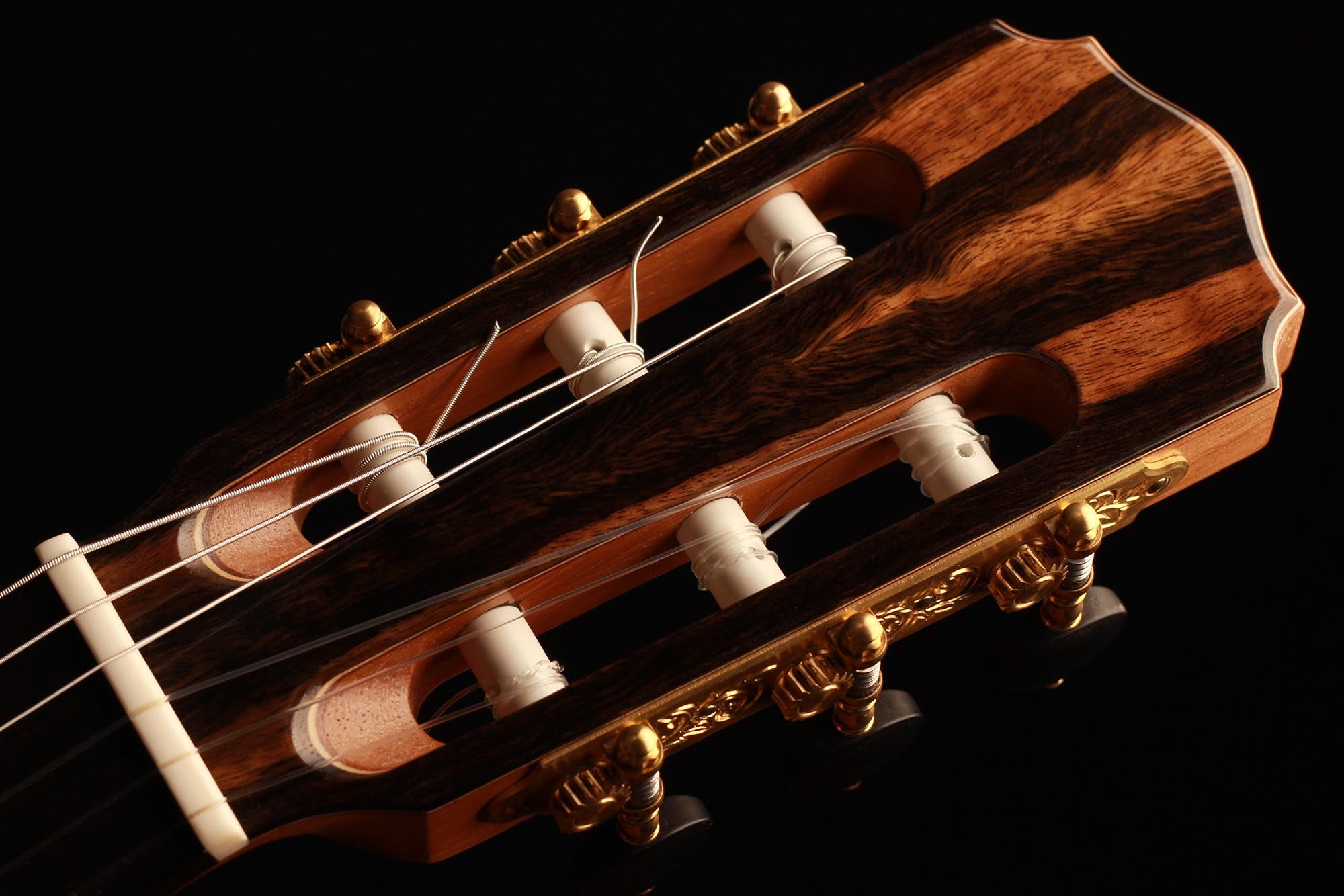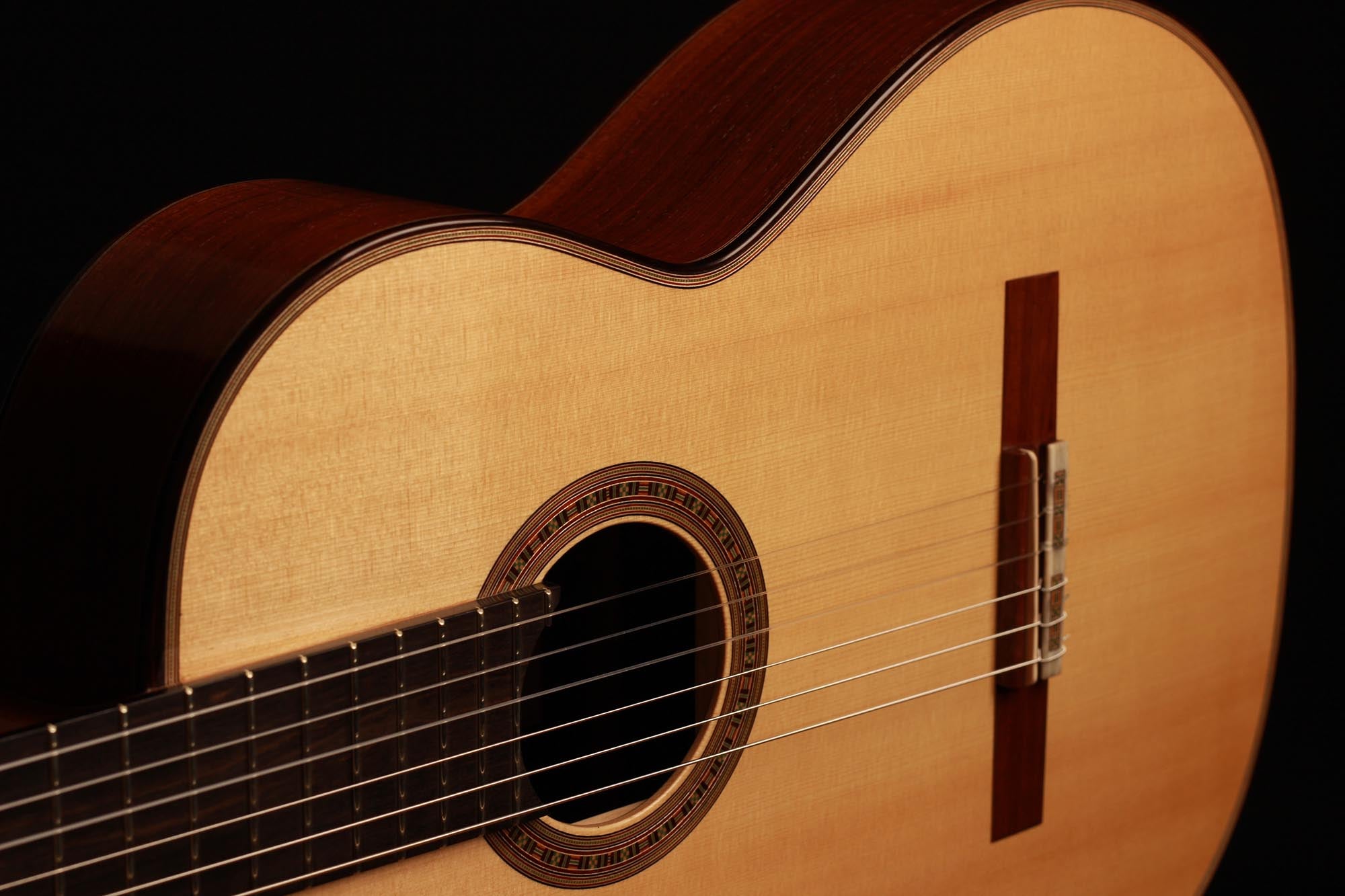 This guitar, which was built at the end of 2018, is especially decorated and very interesting in its construction. The top is slightly sloping on the treble side so that access to the treble is easier in the higher registers. On the bass side, however, the top is shaped as usual, so that the guitarist keeps his orientation when looking at the fingerboard. The volume and projection of this guitar are impressive. The precise response, the accuracy of the tones and the ease of playing make this guitar an extremely vibrant instrument, ideal for ambitious guitarists.